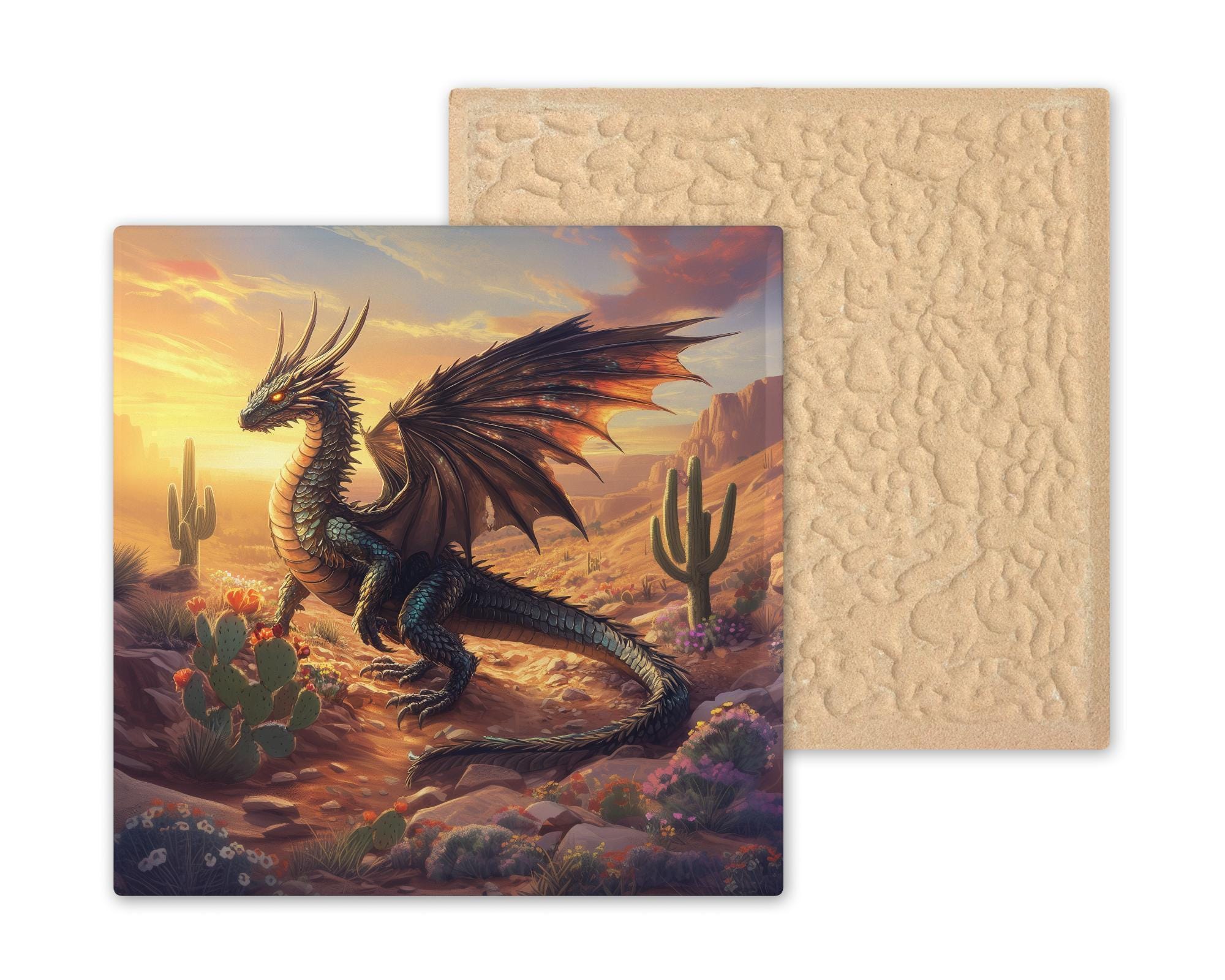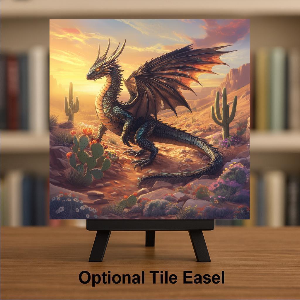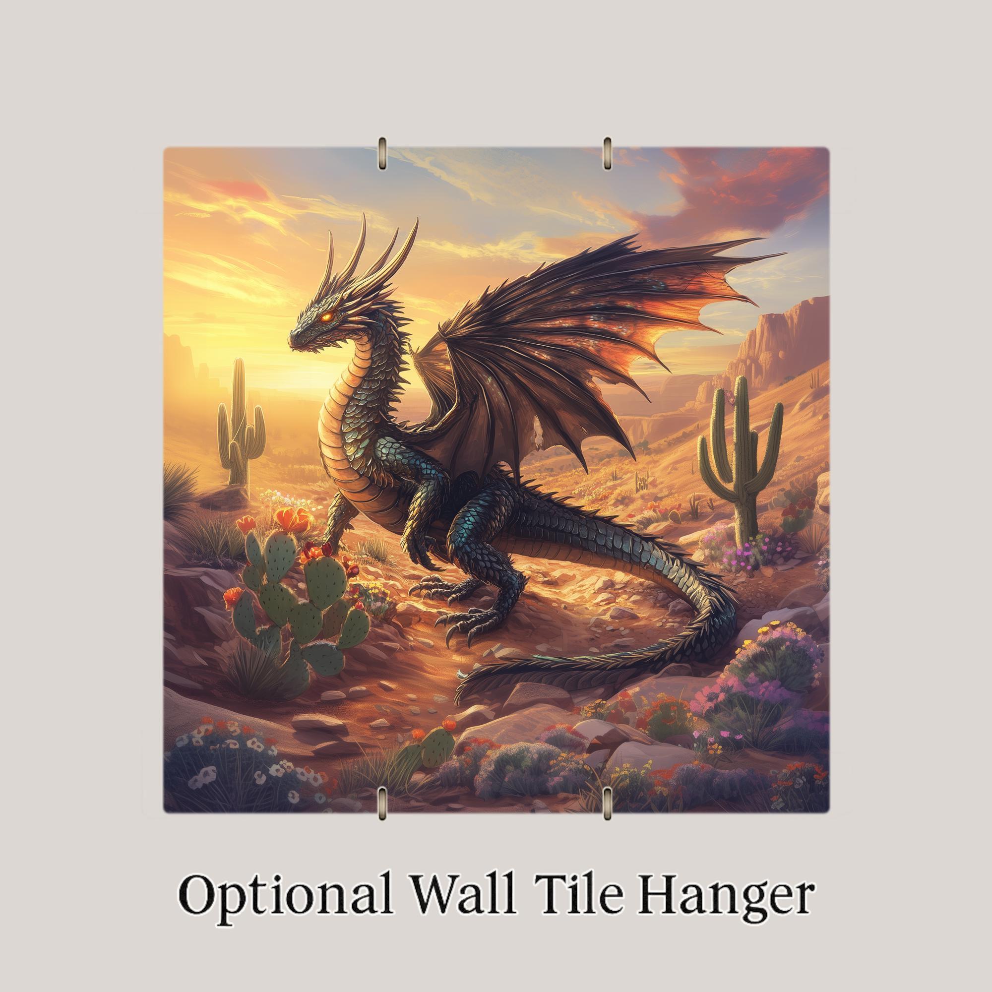 This tile makes an excellent gift for fans of dragons, desert landscapes, Southwestern art, and fantasy illustration. Its warm palette and desert setting make it a standout decorative piece that complements boho interiors, rustic decor, Earth-toned homes, and fantasy-inspired environments. The vivid colors and detailed design create a bold statement that draws attention and sparks conversation.
