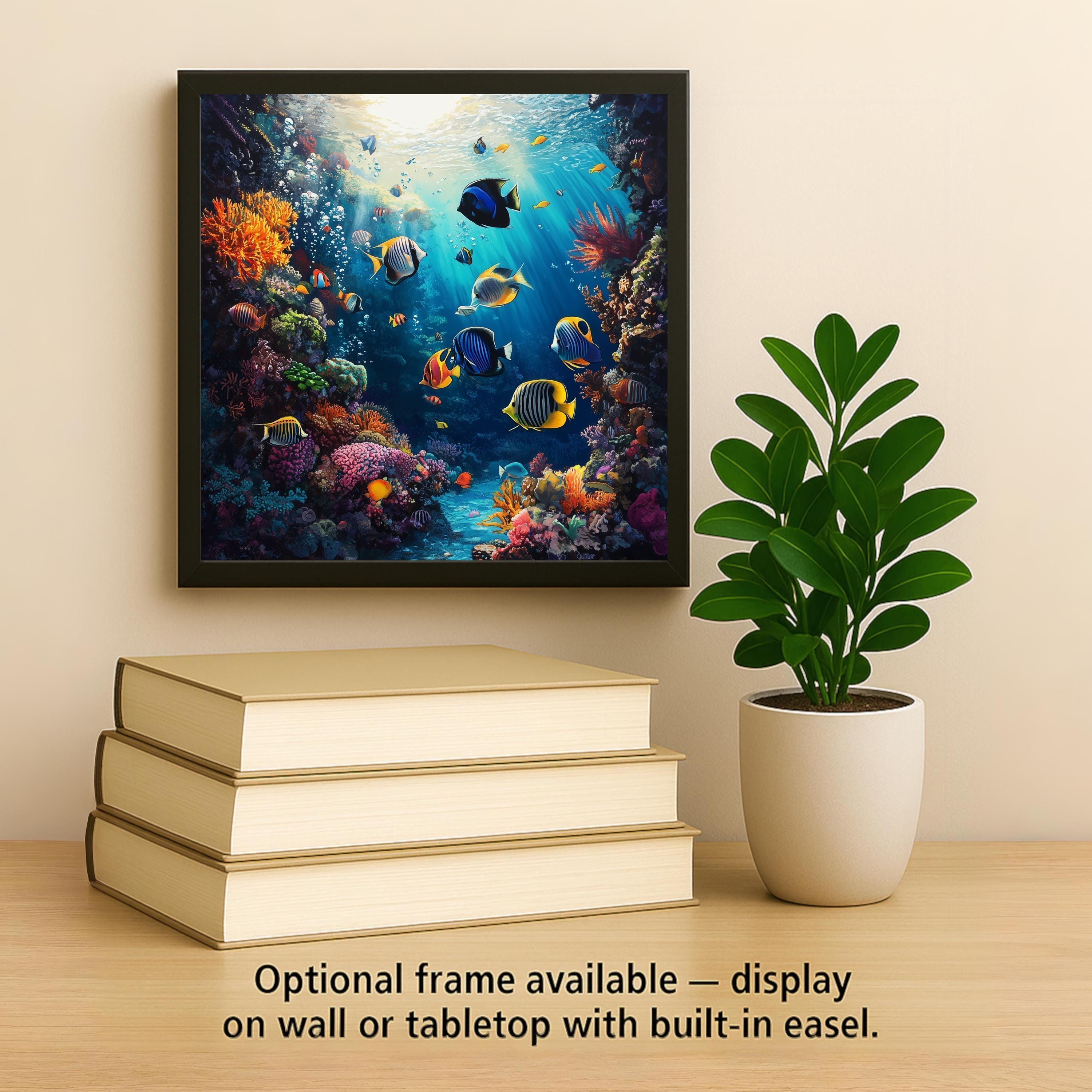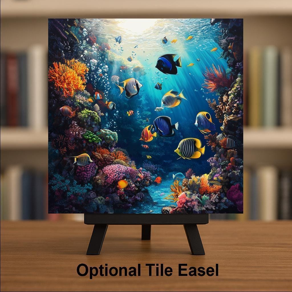 Crafted with brilliant detail, the reef scene is alive with striped angelfish, butterflyfish, and bright coral blooms. The tile can be displayed on a wall with the optional tile wall hanger, set on an easel stand, or customized with cork backing to use as a functional trivet or coaster.