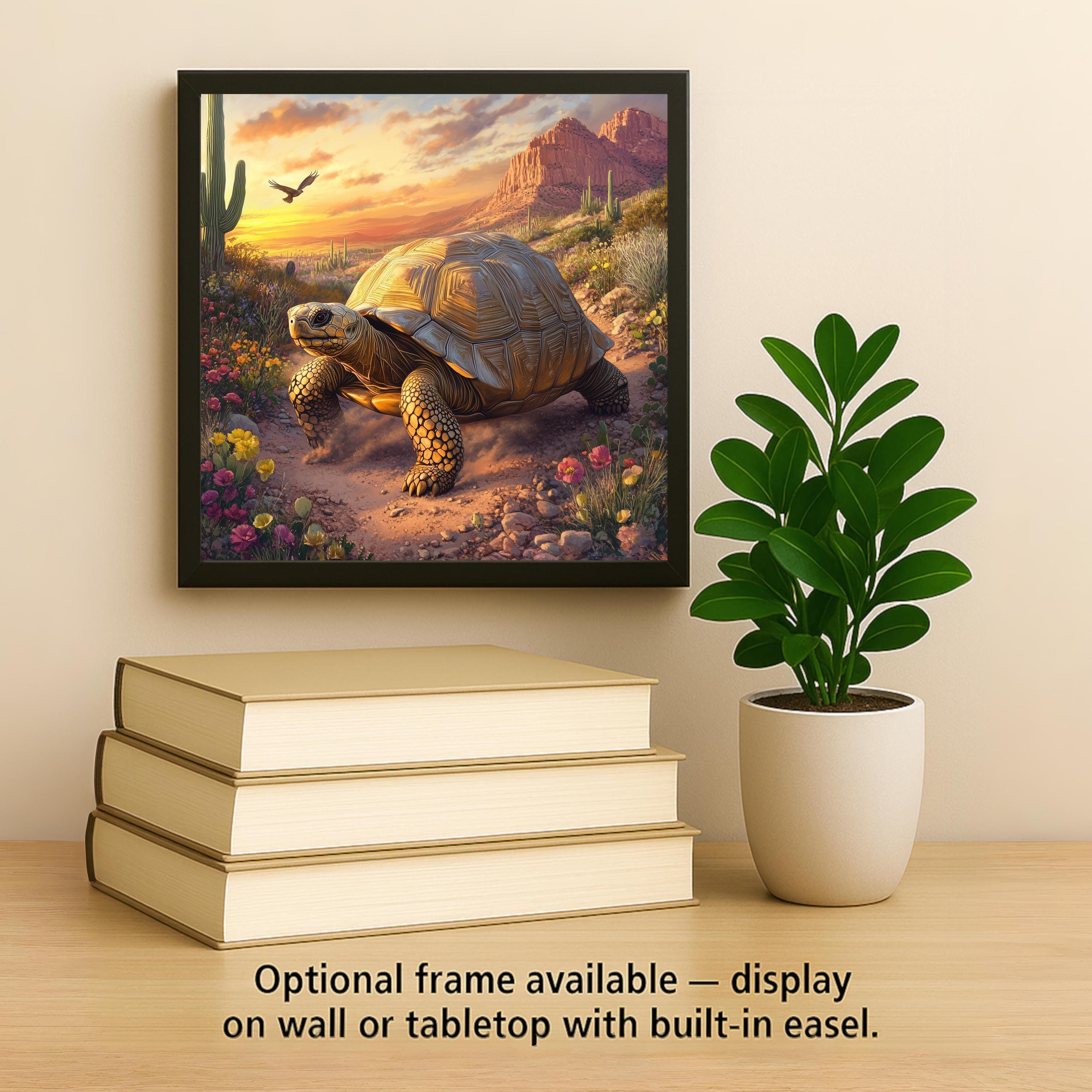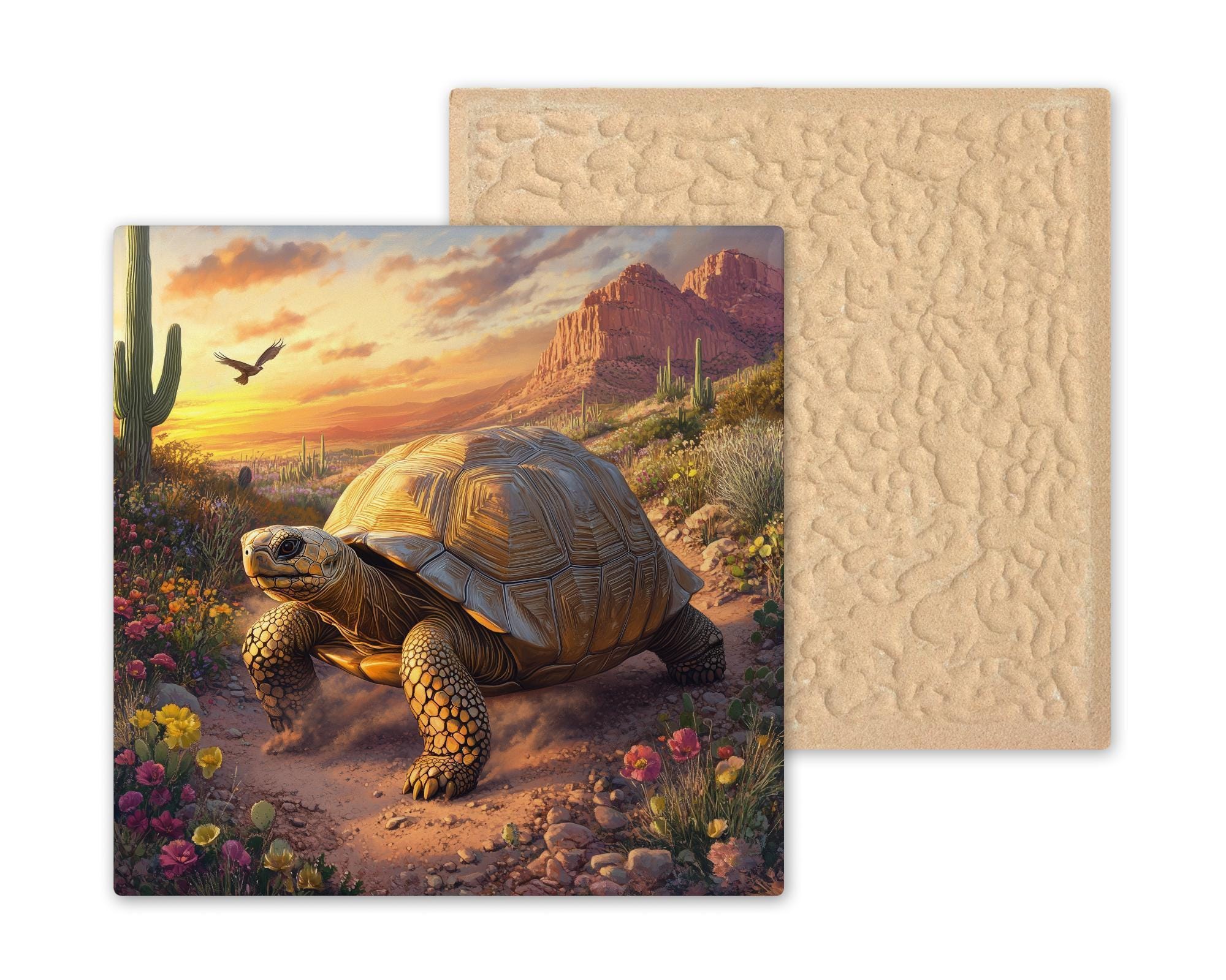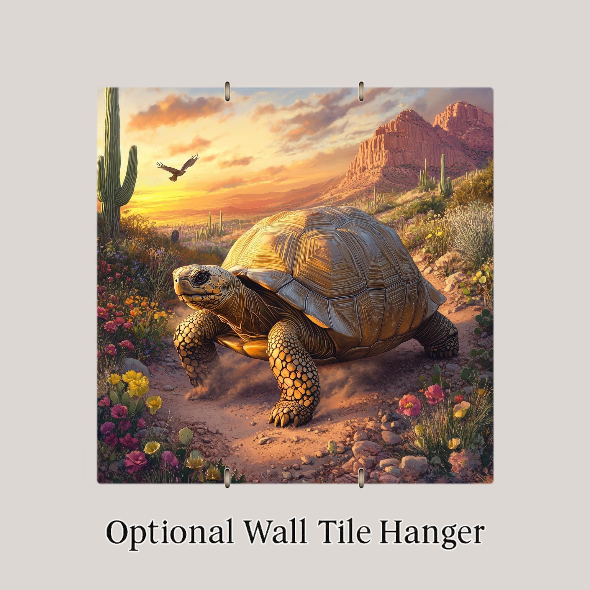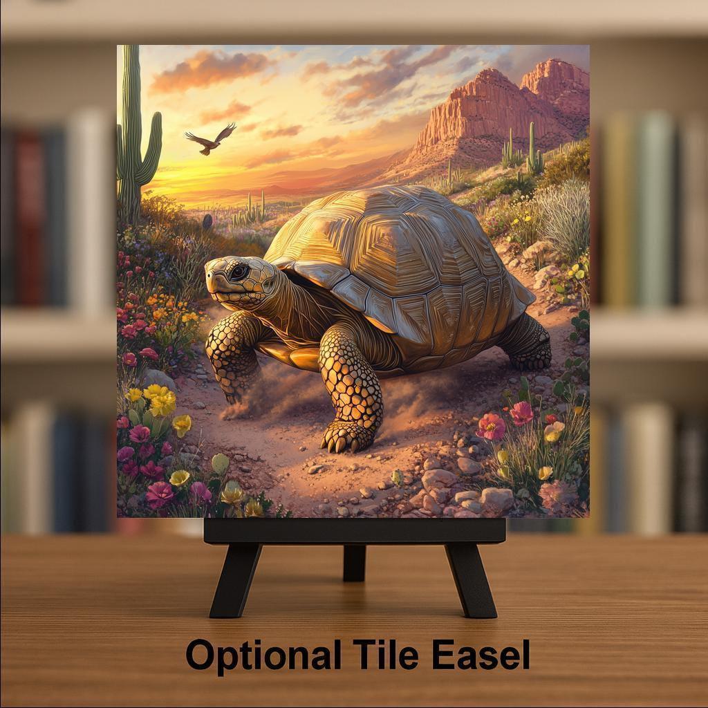 The design celebrates the slow and steady journey of the tortoise, capturing the essence of desert wildlife in rich, detailed tones. The texture and composition of the art give the impression of movement, sunlight, and life in a place often seen as harsh yet filled with quiet beauty. Add a tranquil, southwestern vibe to your entryway, hallway, kitchen, or office with this artistic tile.