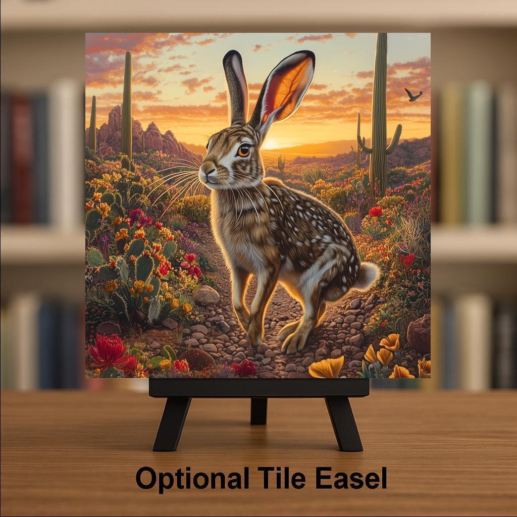 This Southwestern ceramic tile features a jackrabbit standing alert in a blooming desert landscape filled with cacti, golden poppies, and a vibrant setting sun. Capturing the essence of the high desert, the design is ideal for adding warmth and natural character to any room. The rich colors and realistic details bring a wild, rustic feel to your wall or shelf decor.