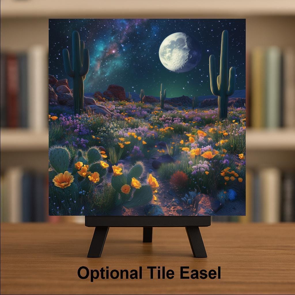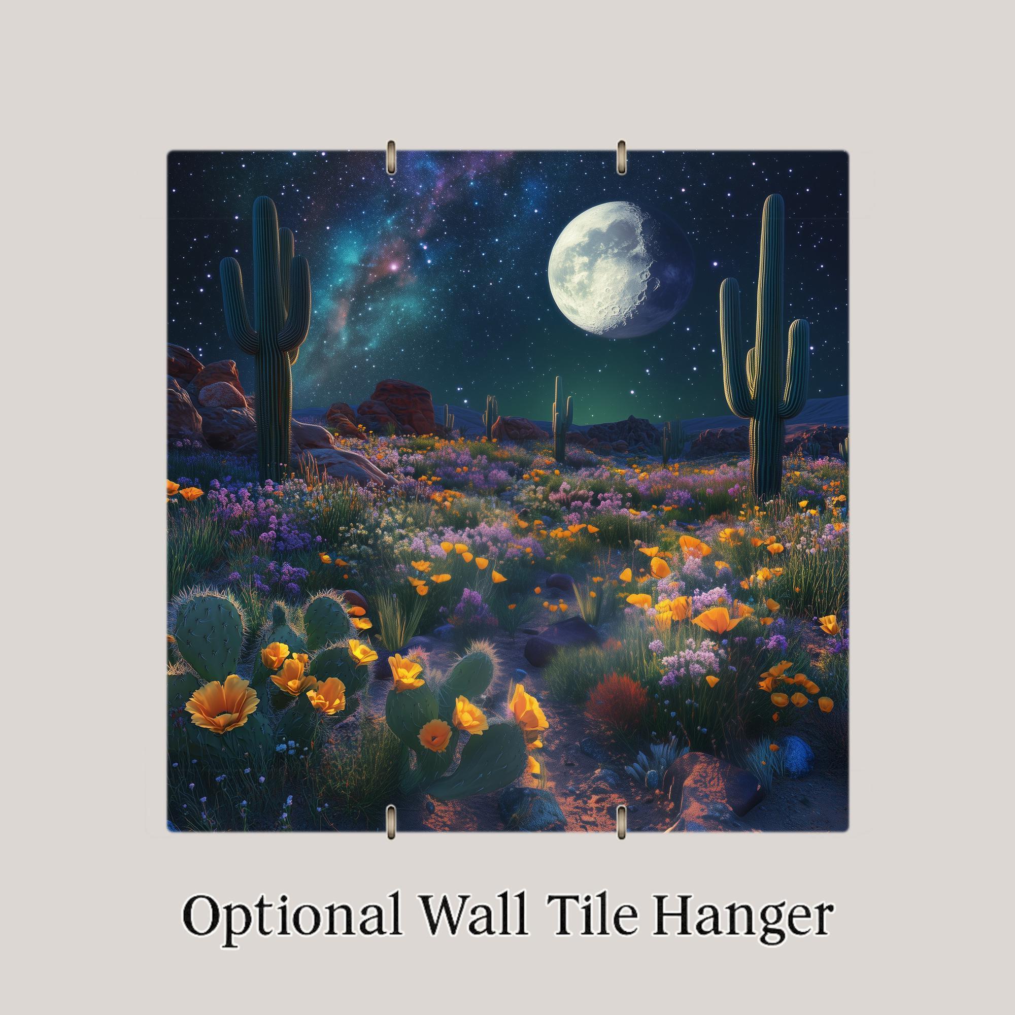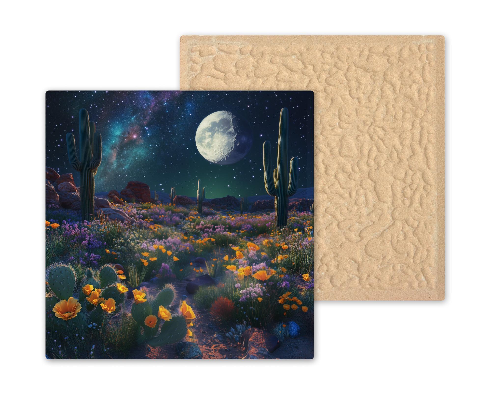 This Southwestern moonlit ceramic tile showcases a surreal desert landscape blanketed in wildflowers under a glowing night sky. Cacti reach upward toward a brilliant full moon as golden blossoms and lavender brush fill the foreground with dreamlike color. A shimmering galaxy arches across the sky, infusing the entire scene with serenity and wonder.