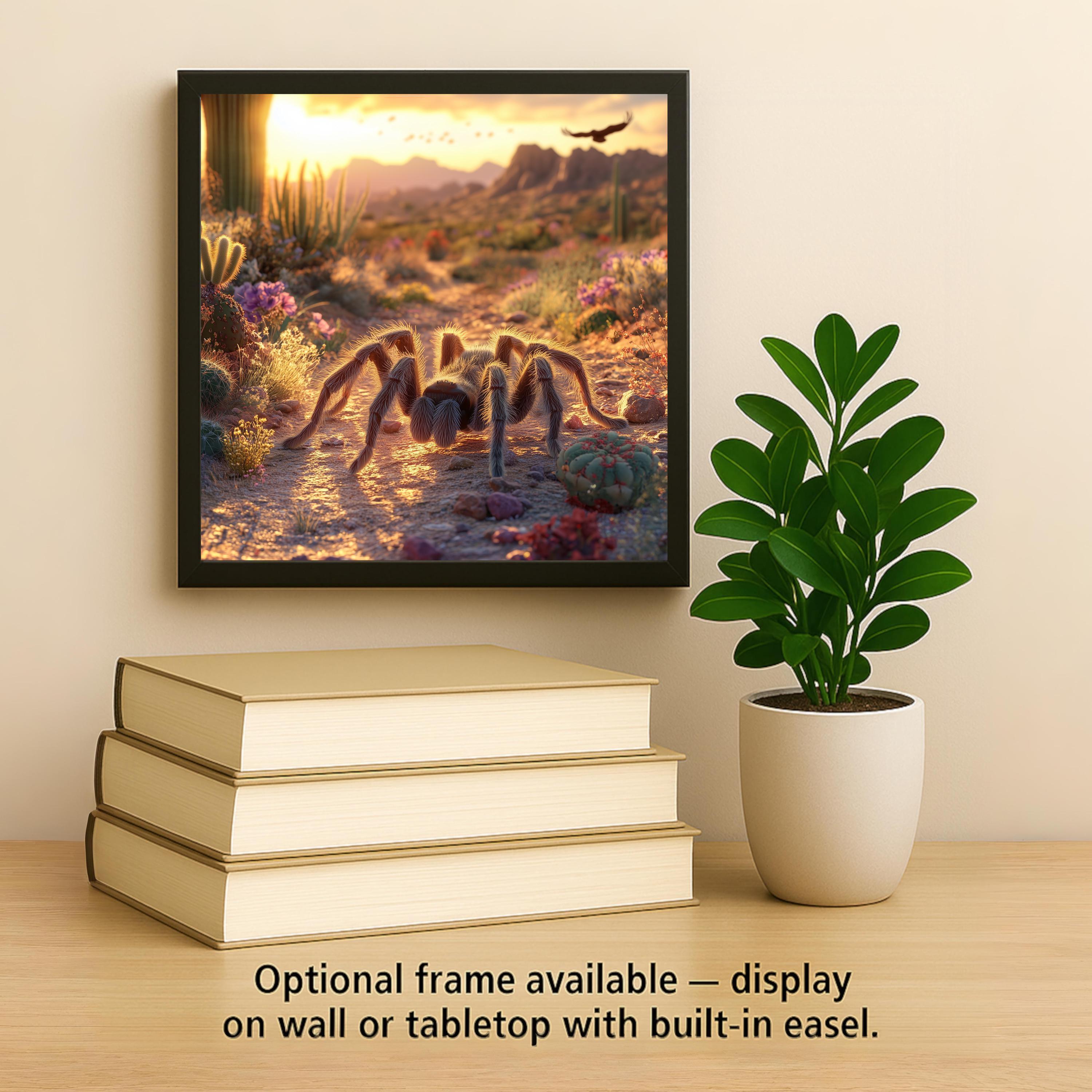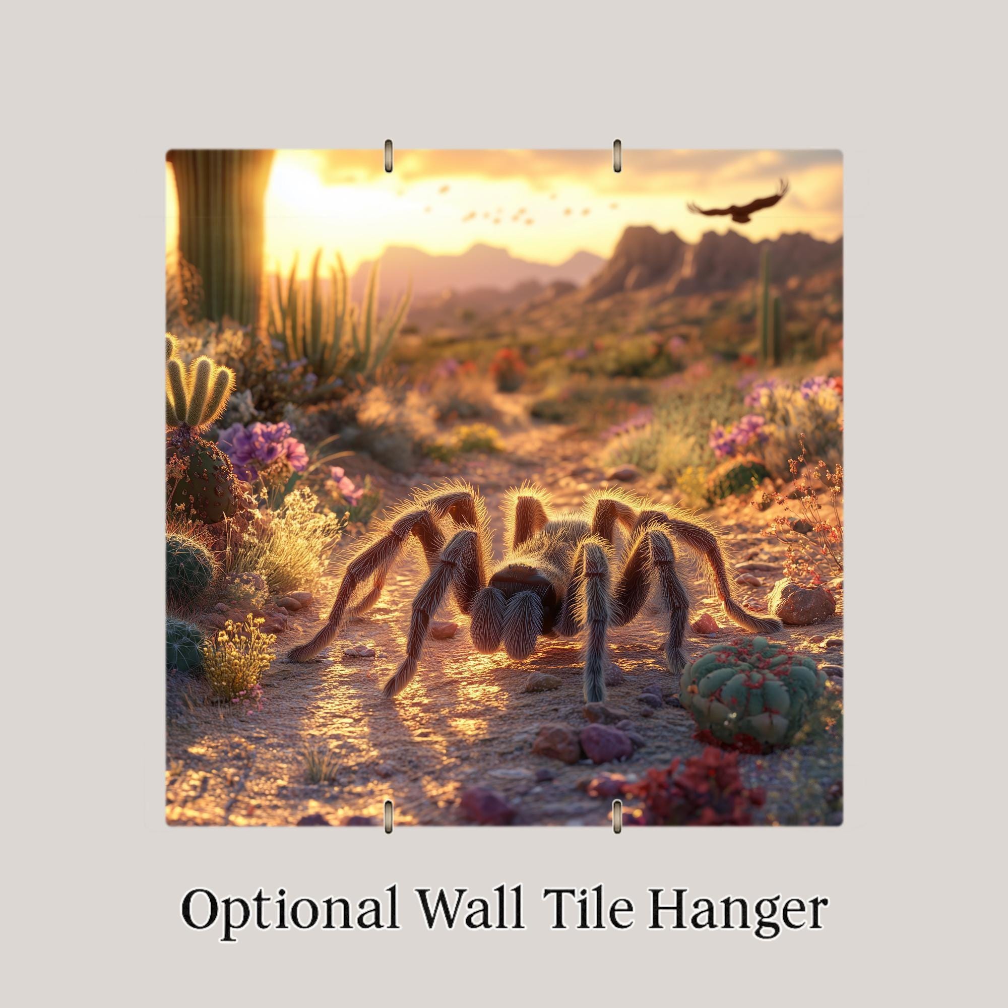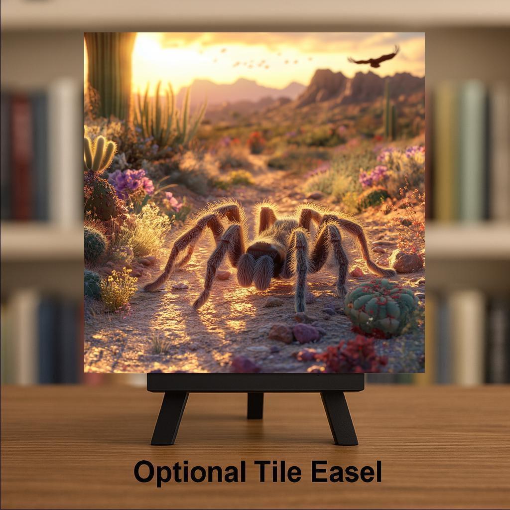 If you love all things wild and weird, this desert tarantula ceramic tile is a must-have. A hairy tarantula is front and center, creeping across a desert trail as the sunset bathes the scene in golden light. Surrounded by cactus blooms and rugged terrain, the composition feels like a still shot from a nature documentary.