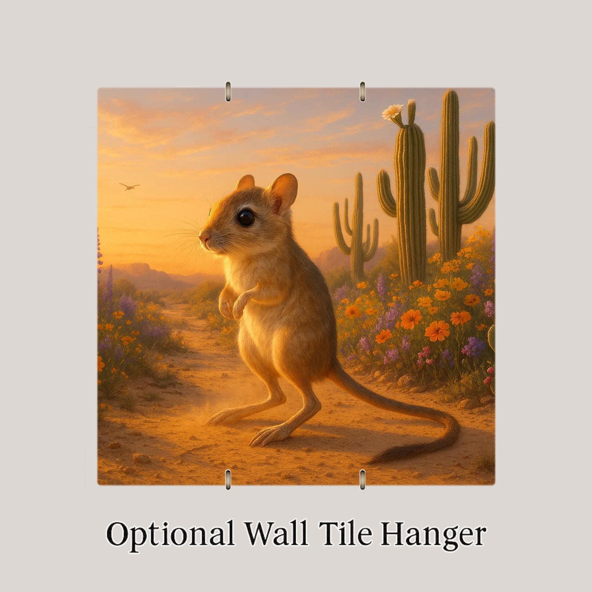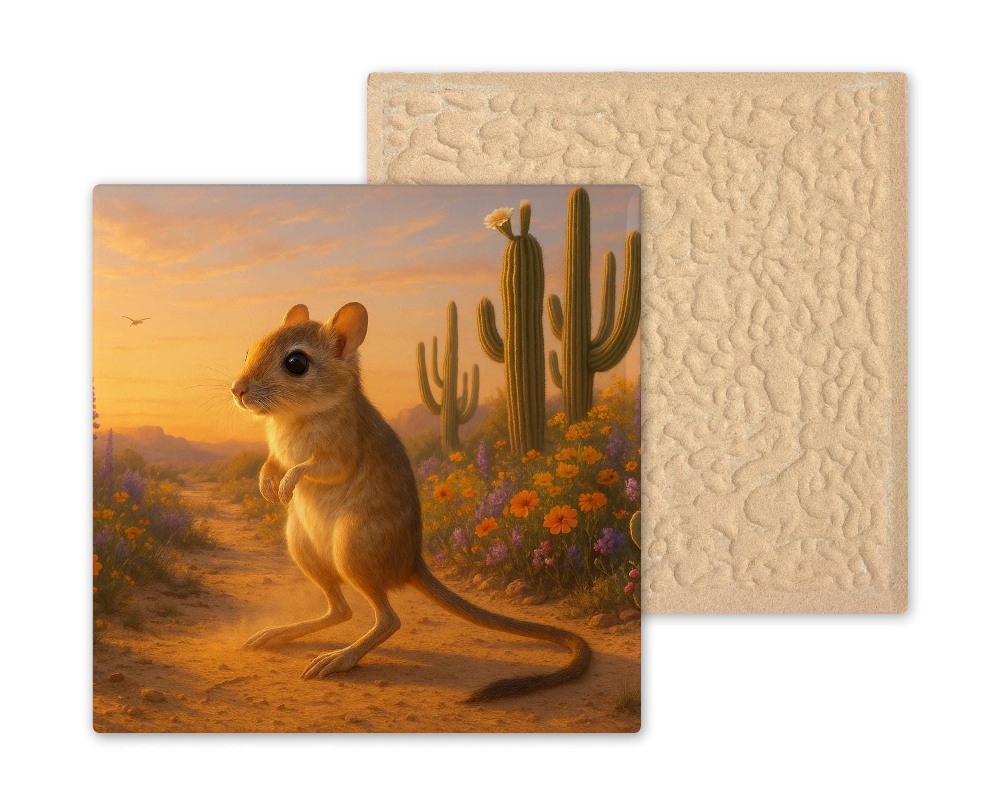 Celebrate the beauty of desert life with this charming Kangaroo Rat ceramic tile. Set against a glowing Southwestern backdrop, a curious kangaroo rat pauses on a sandy trail surrounded by wildflowers and cacti. The warm sunset sky and earthy tones create a peaceful, golden-hour scene that brings the desert’s quiet magic to your home.