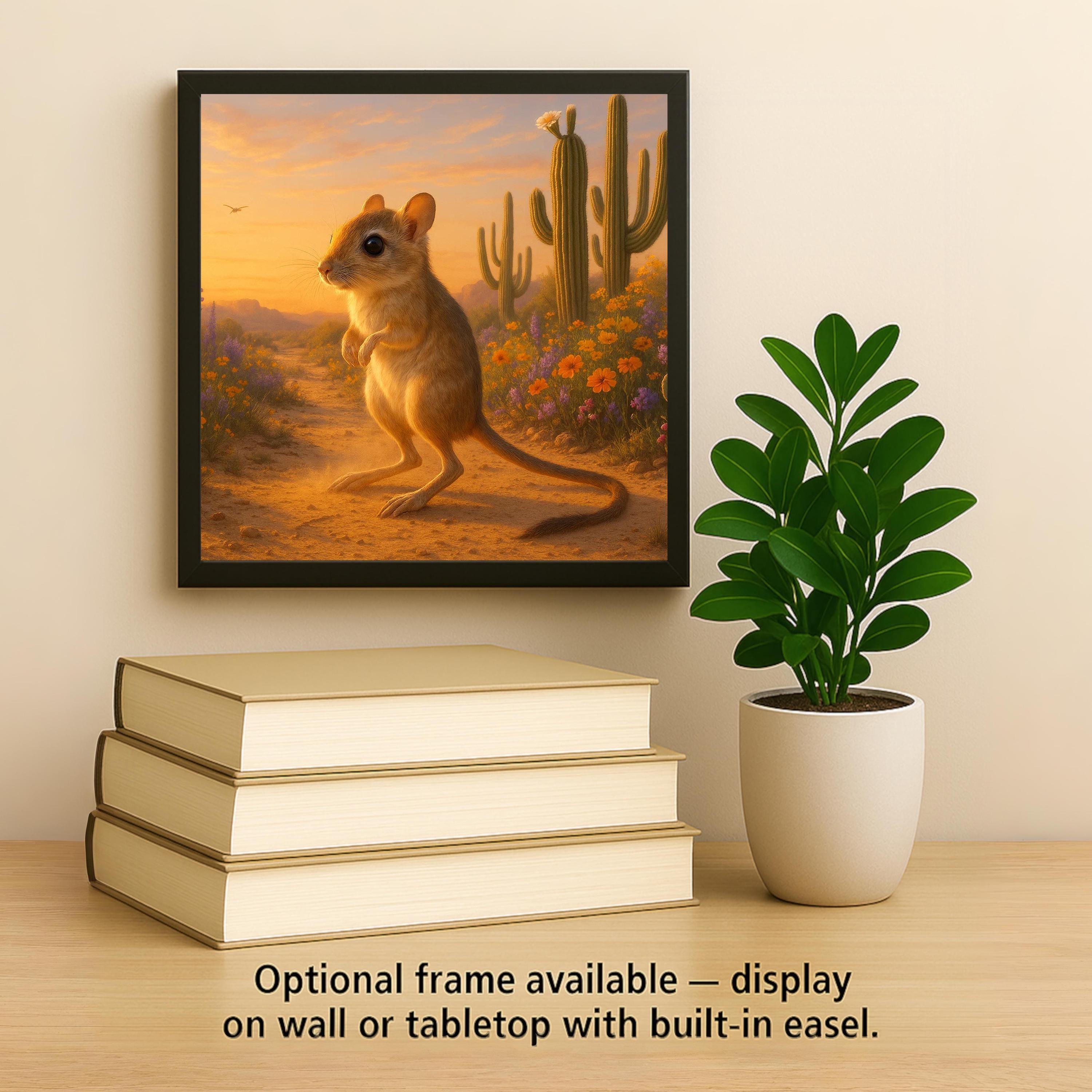 This artwork is perfect for lovers of desert wildlife and Southwestern decor. The kangaroo rat’s expressive eyes and tiny stance are full of personality, while the detailed landscape evokes the Arizona or New Mexico high desert in full spring bloom. Pops of orange, purple, and green give the tile vibrant contrast against the sandy browns and golden light.