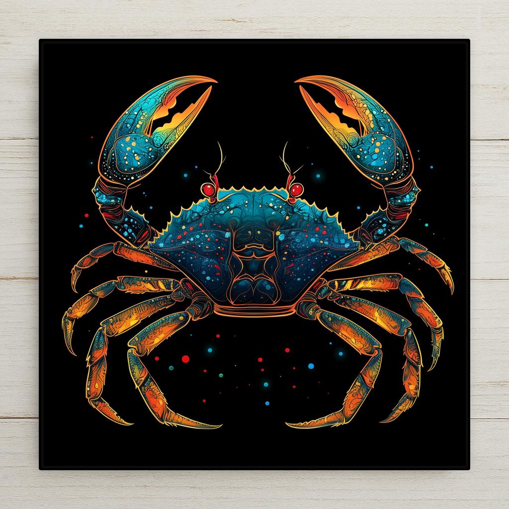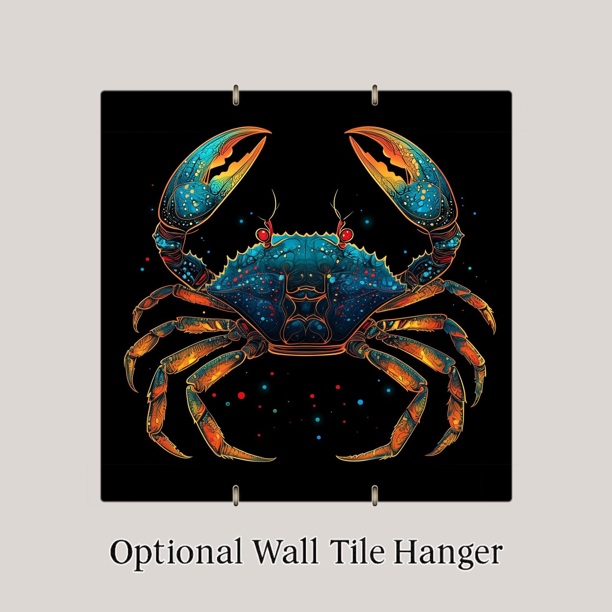 Channel the cosmic power of the Cancer zodiac with this neon crab ceramic tile. This bold, high-contrast design features an electrified crab glowing with celestial energy, surrounded by scattered stars and space-like dots on a black background. The vibrant blues and oranges give it a modern, energetic vibe that’s perfect for astrology lovers and celestial home decor.