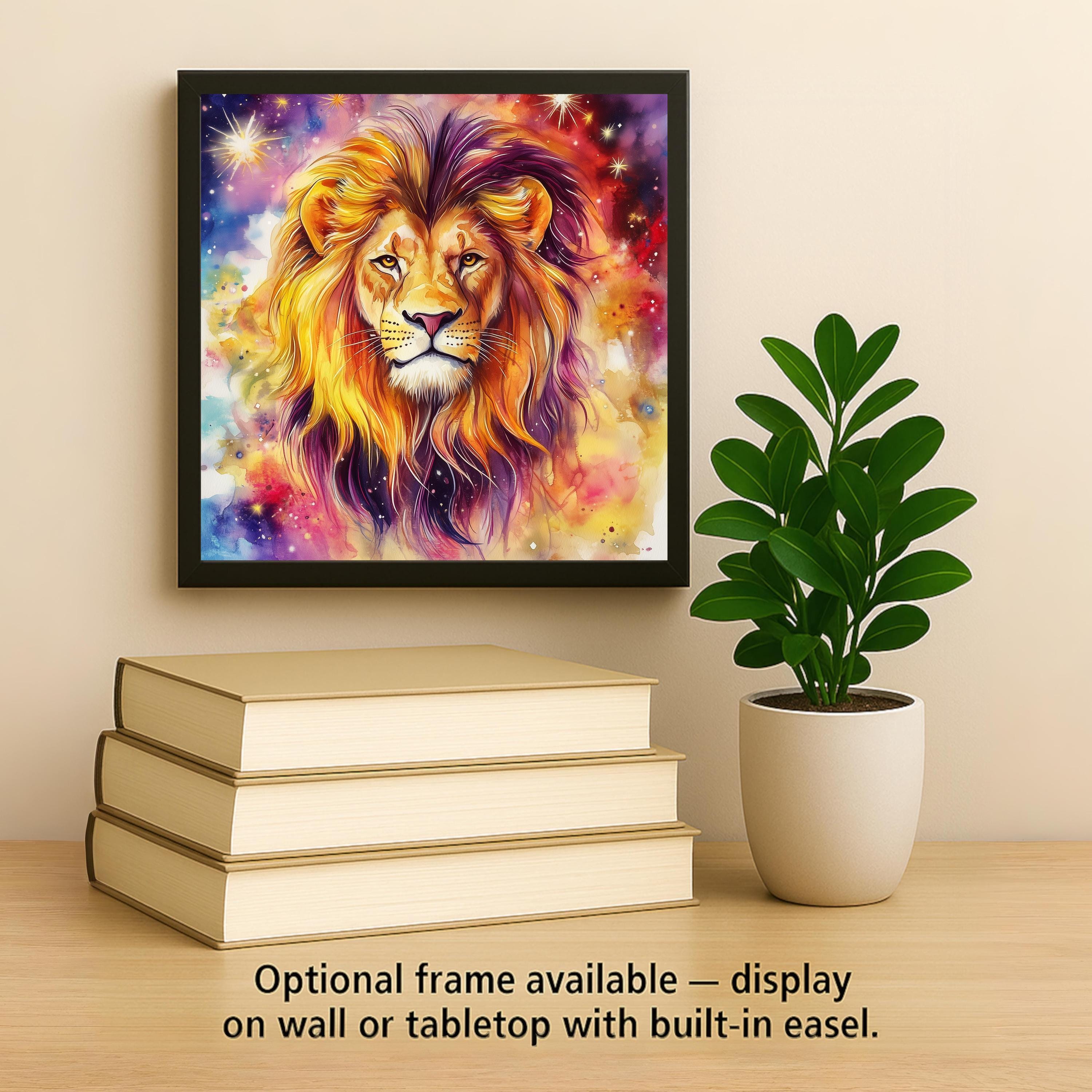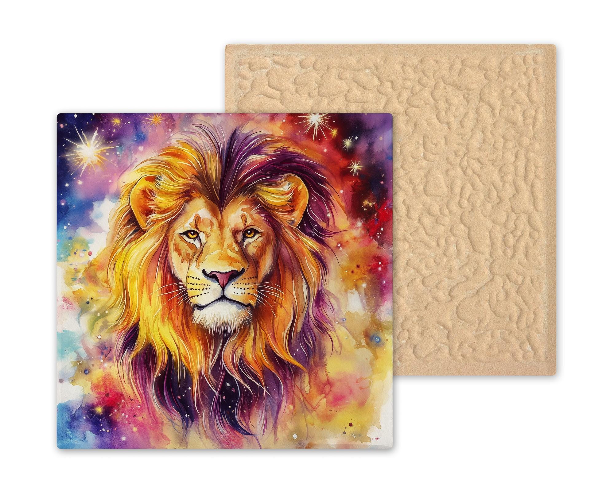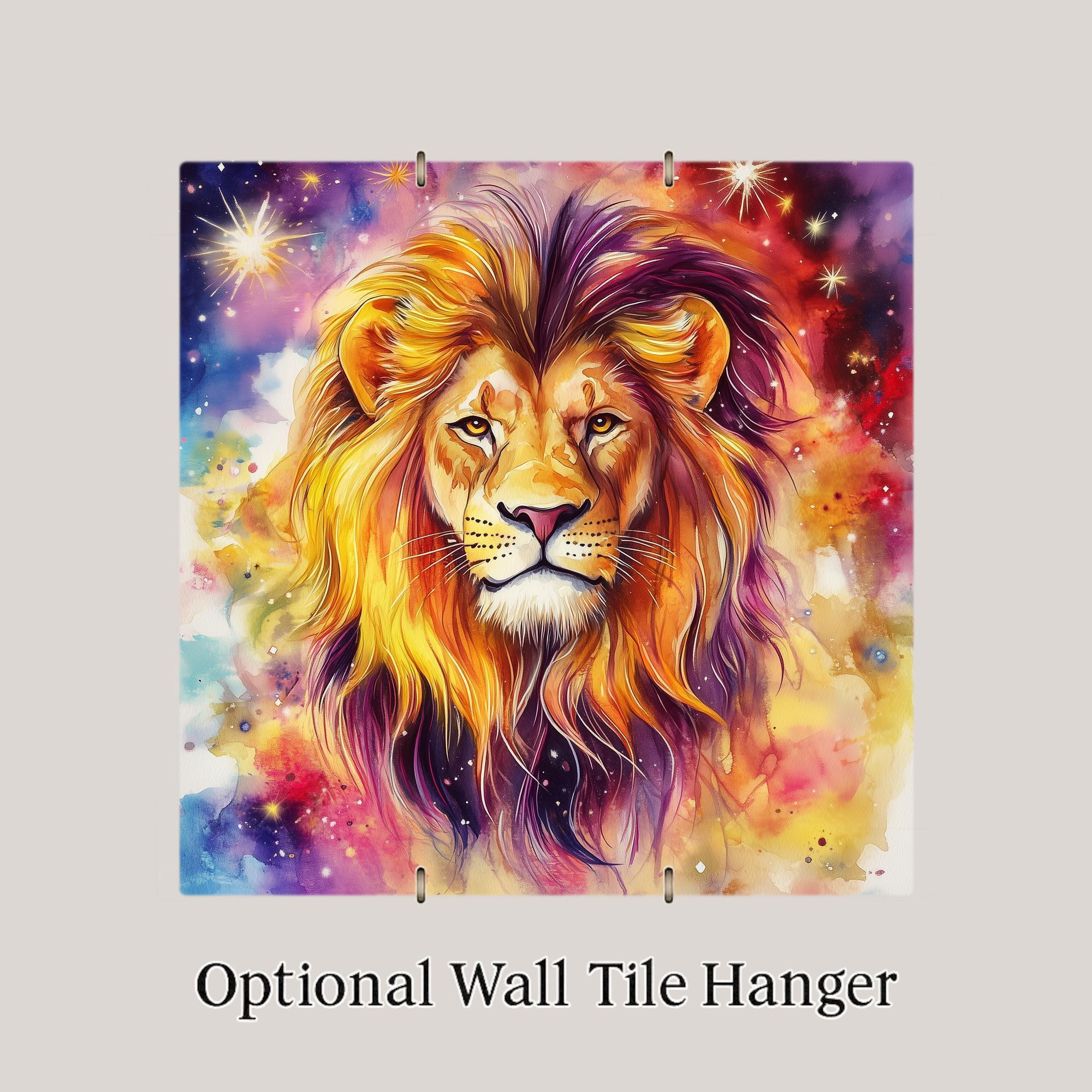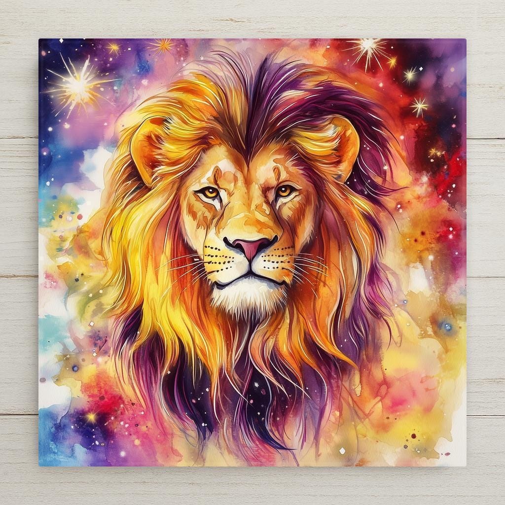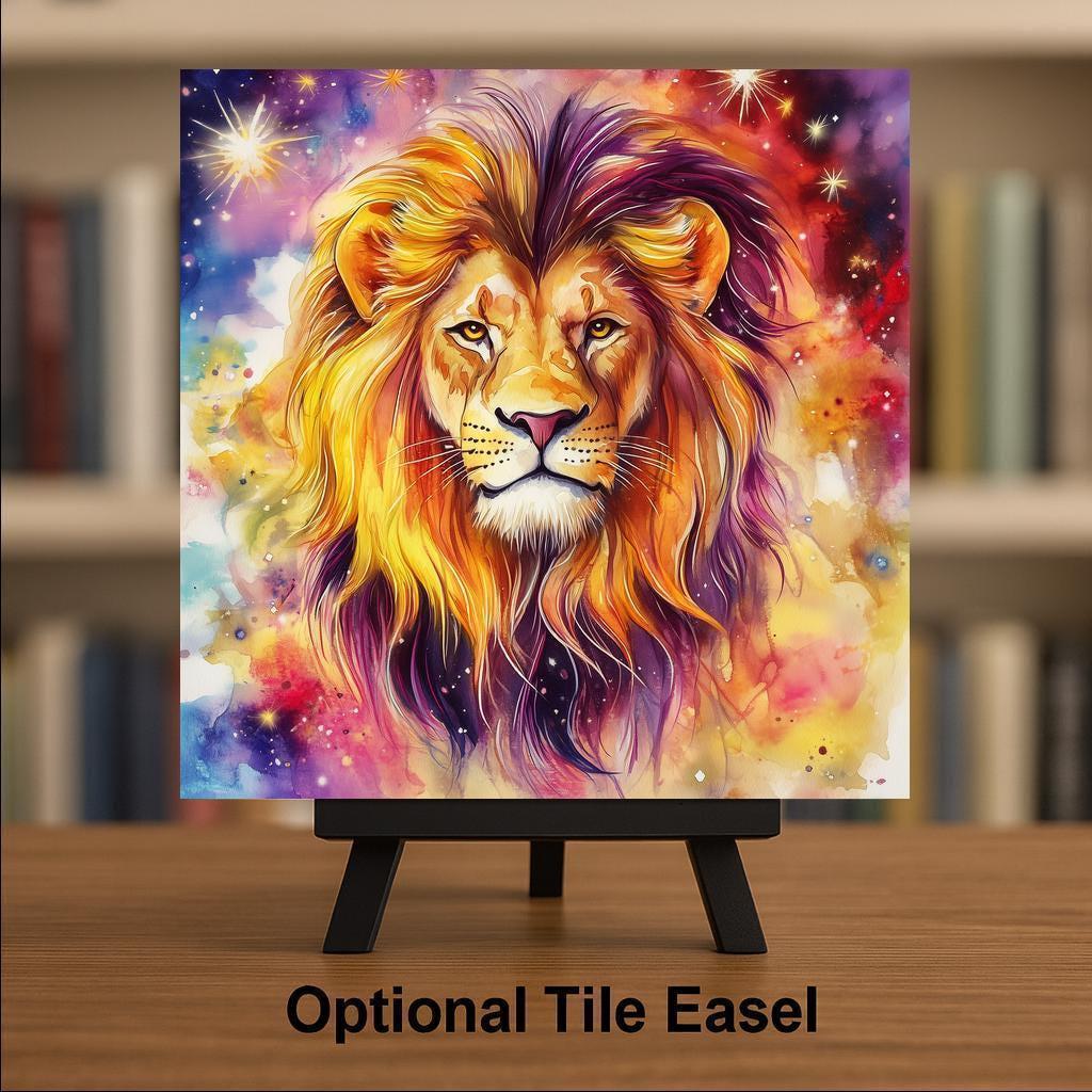 This Leo lion tile is a perfect blend of celestial wonder and astrological power. The lion, symbol of the Leo zodiac sign, stands proudly at the center, surrounded by colorful swirls that evoke cosmic energy and solar fire. Designed in a watercolor style, the vibrant shades of gold, purple, and red mirror Leo’s bold personality. It’s an ideal gift for astrology lovers or anyone who identifies with the fiery spirit of this sign.