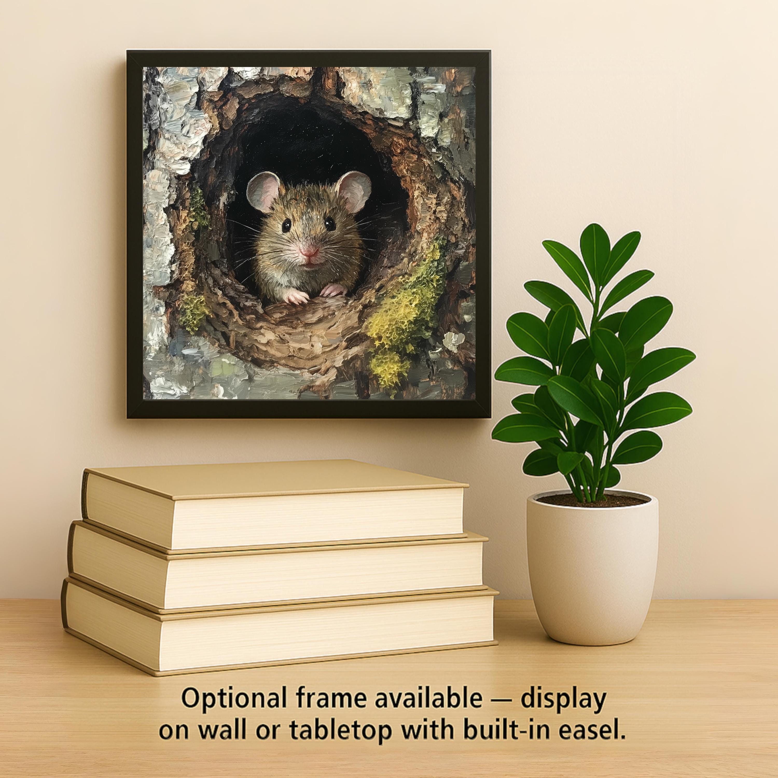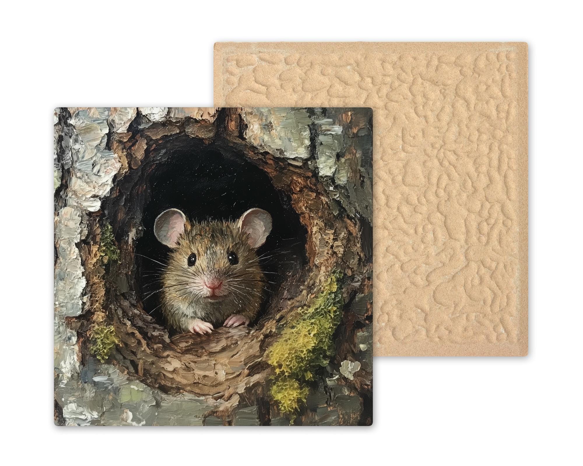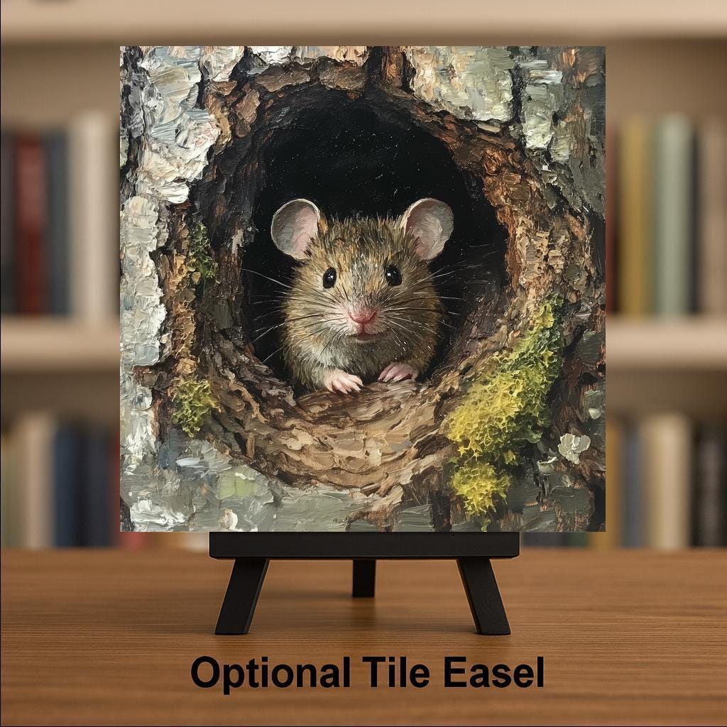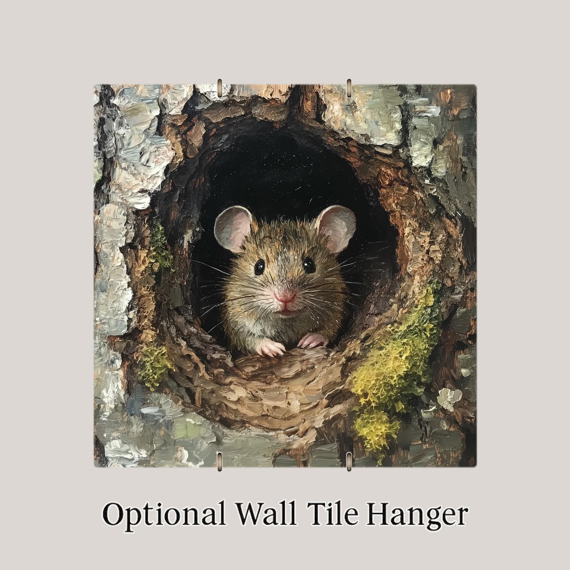 Made from quality ceramic, the artwork is vibrant and long-lasting with a glossy finish. Perfect as forest decor, animal art, or even a cottagecore gift idea, this tile can be displayed on the wall or tabletop with an optional wall hanger, cork backing, or easel stand. Each detail—from the mouse’s curious eyes to the hand-painted bark—feels inviting and gentle.