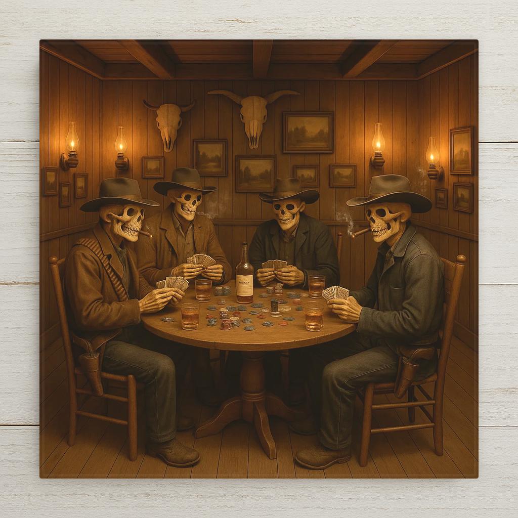 With every skeleton wearing a cowboy hat and clutching cards with bony fingers, this tile is full of charm and dark detail. Whether you love the macabre or just appreciate a good poker face—even in the afterlife—this piece delivers both laughs and shivers. The warm sepia tones give it an old-timey feel, while the skeletons add a creepy twist.