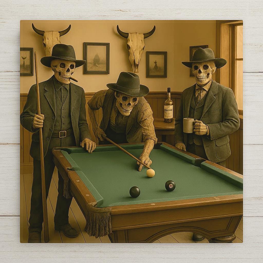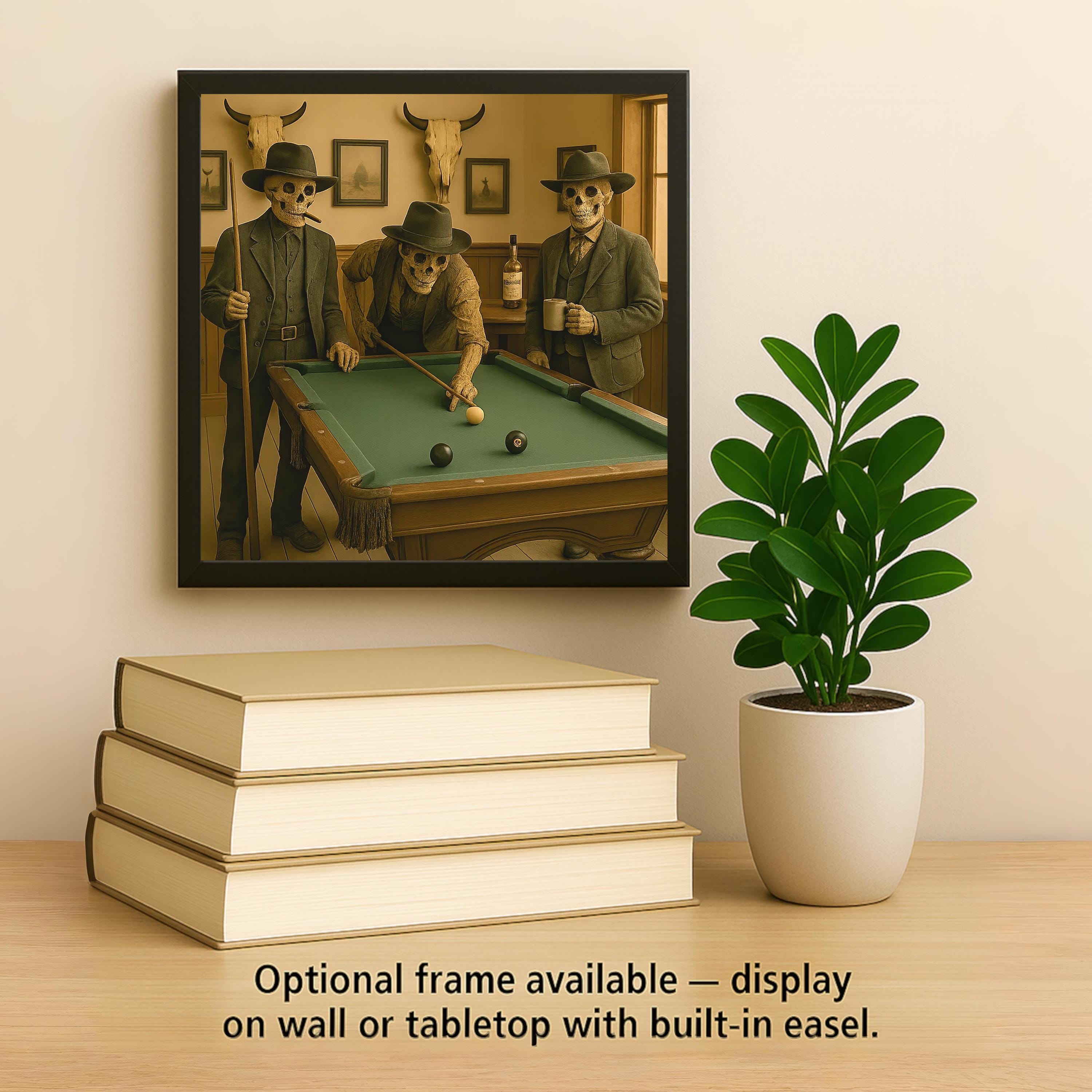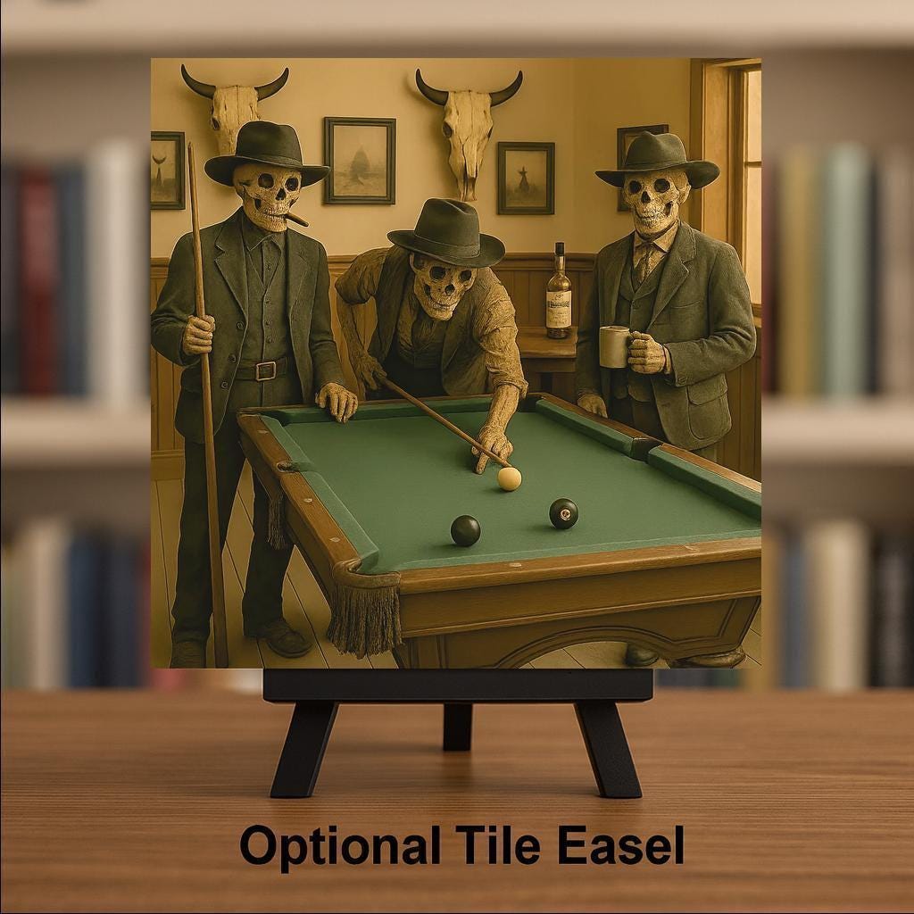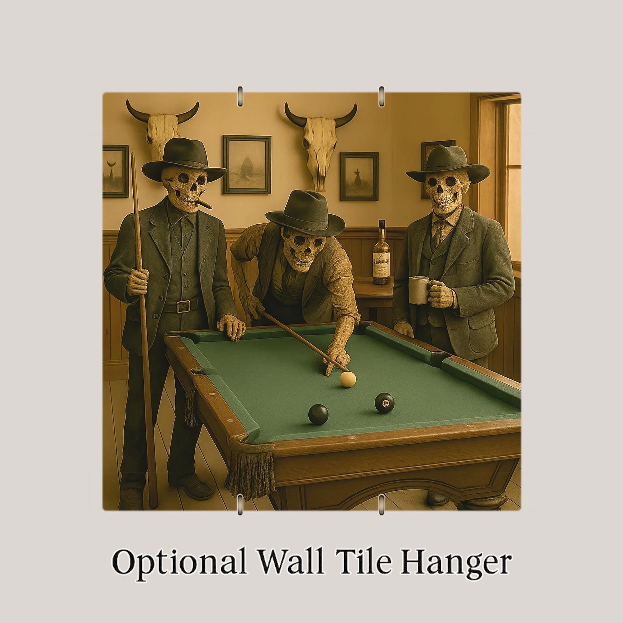 Whether showcased individually or in a themed gallery, this Skeleton Cowboy Pool Hall tile brings eerie charm, warm color, and dark humor to your home decor.