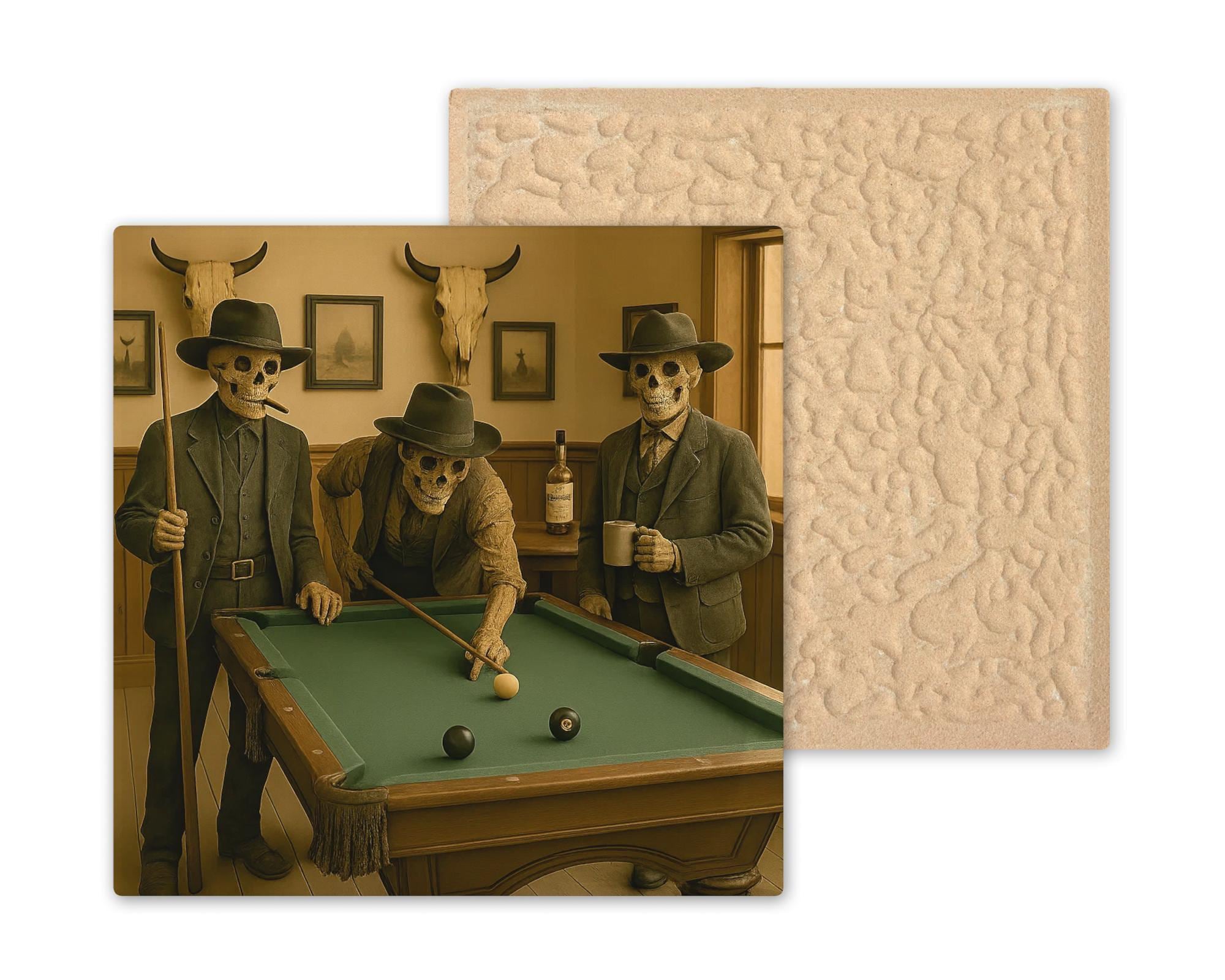 This tile makes a memorable gift for fans of Halloween, Westerns, pool halls, macabre humor, and rustic novelty art. Its combination of desert-bar atmosphere, skeletal characters, and quirky storytelling creates a striking and amusing focal point for home bars, game rooms, offices, and entertainment spaces.