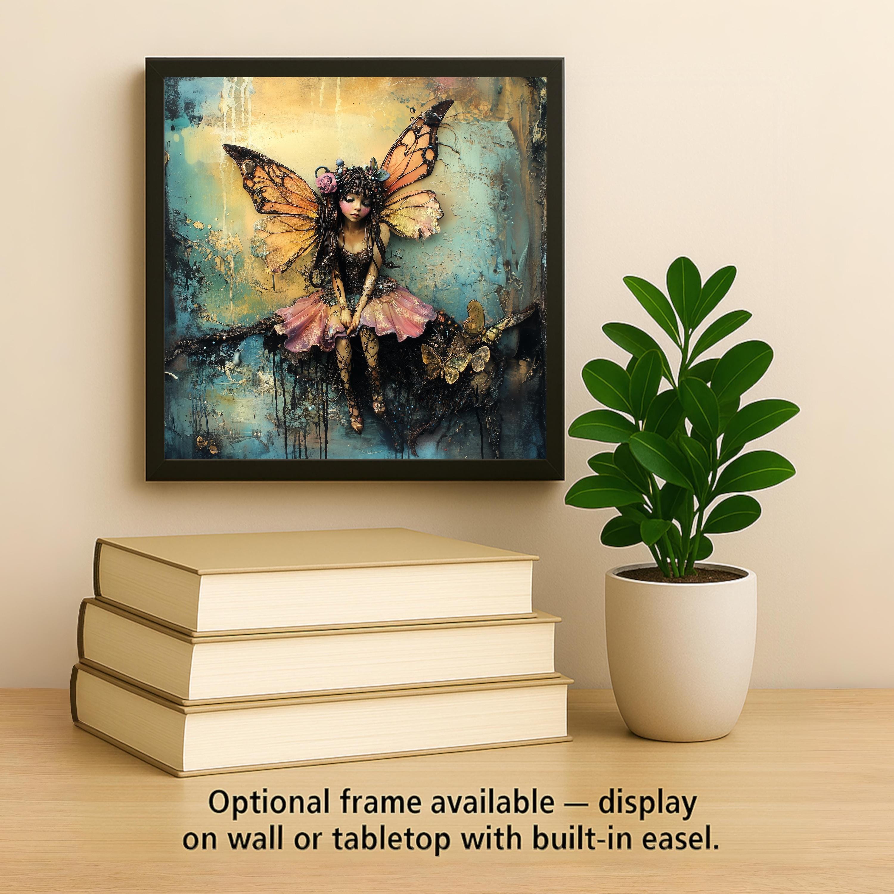 This Enchanting Coquette Fairy Tile captures a charming blend of fantasy style, whimsical color, and delicate emotion. The fairy sits gracefully on a dark, textured branch with her legs crossed, surrounded by metallic gold butterflies. Her butterfly wings glow with warm creams and soft oranges, blending into an atmospheric teal and yellow background. Her pink skirt, floral crown, and expressive eyes give her a sweet, dreamy personality that fits beautifully with coquette, whimsical, and fairycore aesthetics.