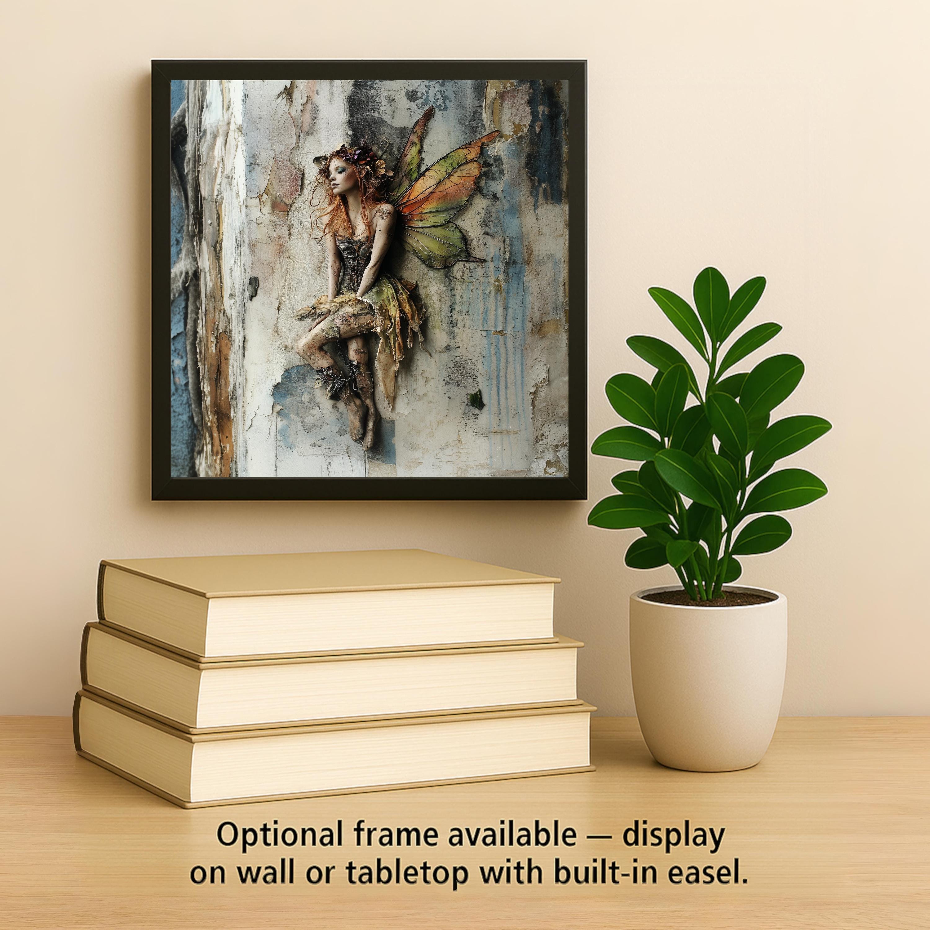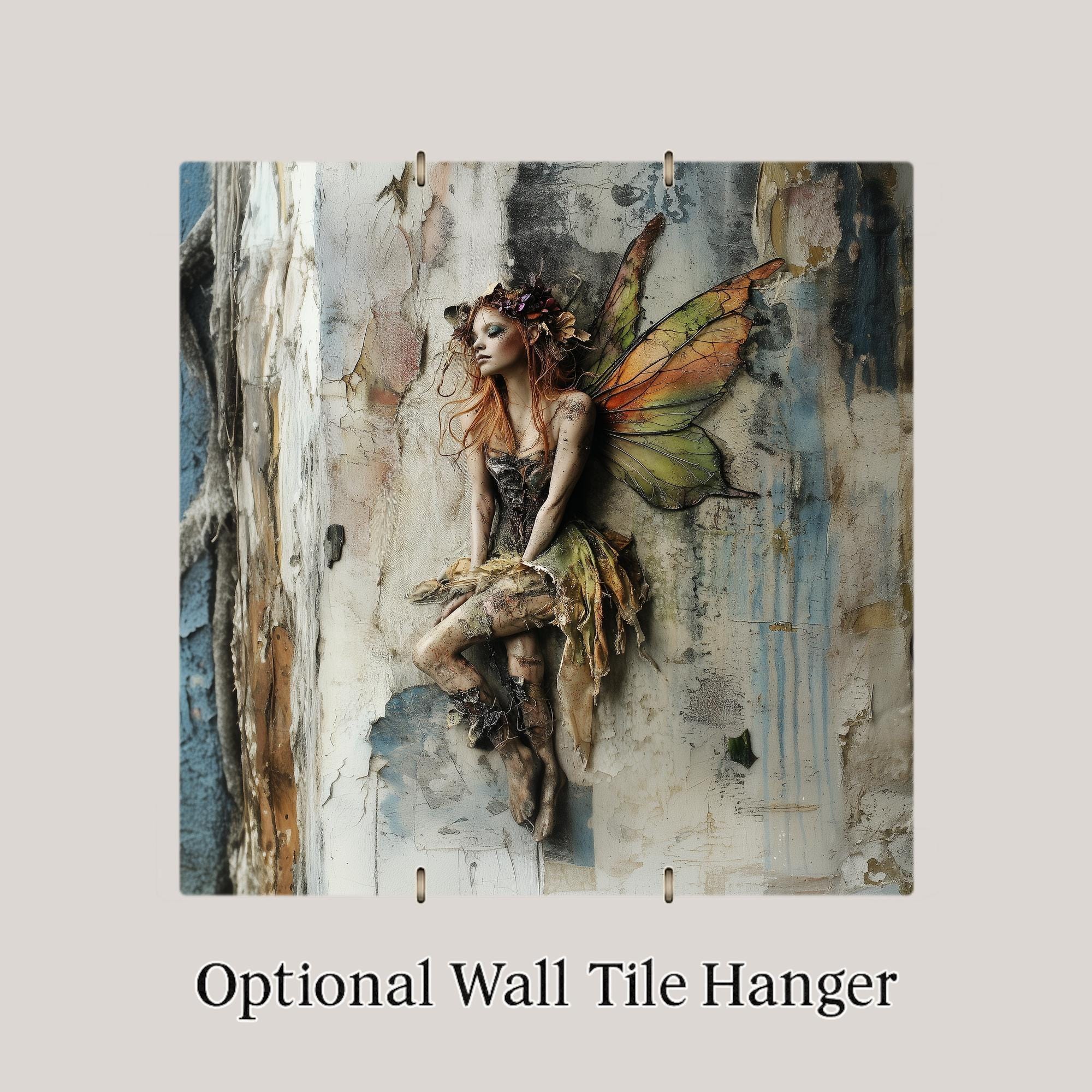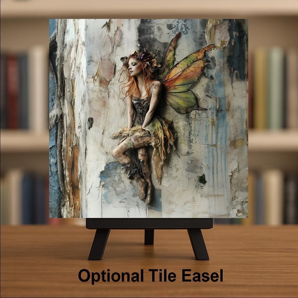 This Woodland Fairy Tile Art captures the delicate beauty of a forest spirit through expressive detail and earthy color. The artwork shows a fairy resting against an aged, textured wall with soft highlights lighting her wings. Her moss-toned dress, floral headpiece, and flowing hair evoke an organic, natural charm that fits seamlessly into woodland fantasy themes. The muted background and gentle shadows create a quiet, contemplative mood reminiscent of storybook illustrations.
