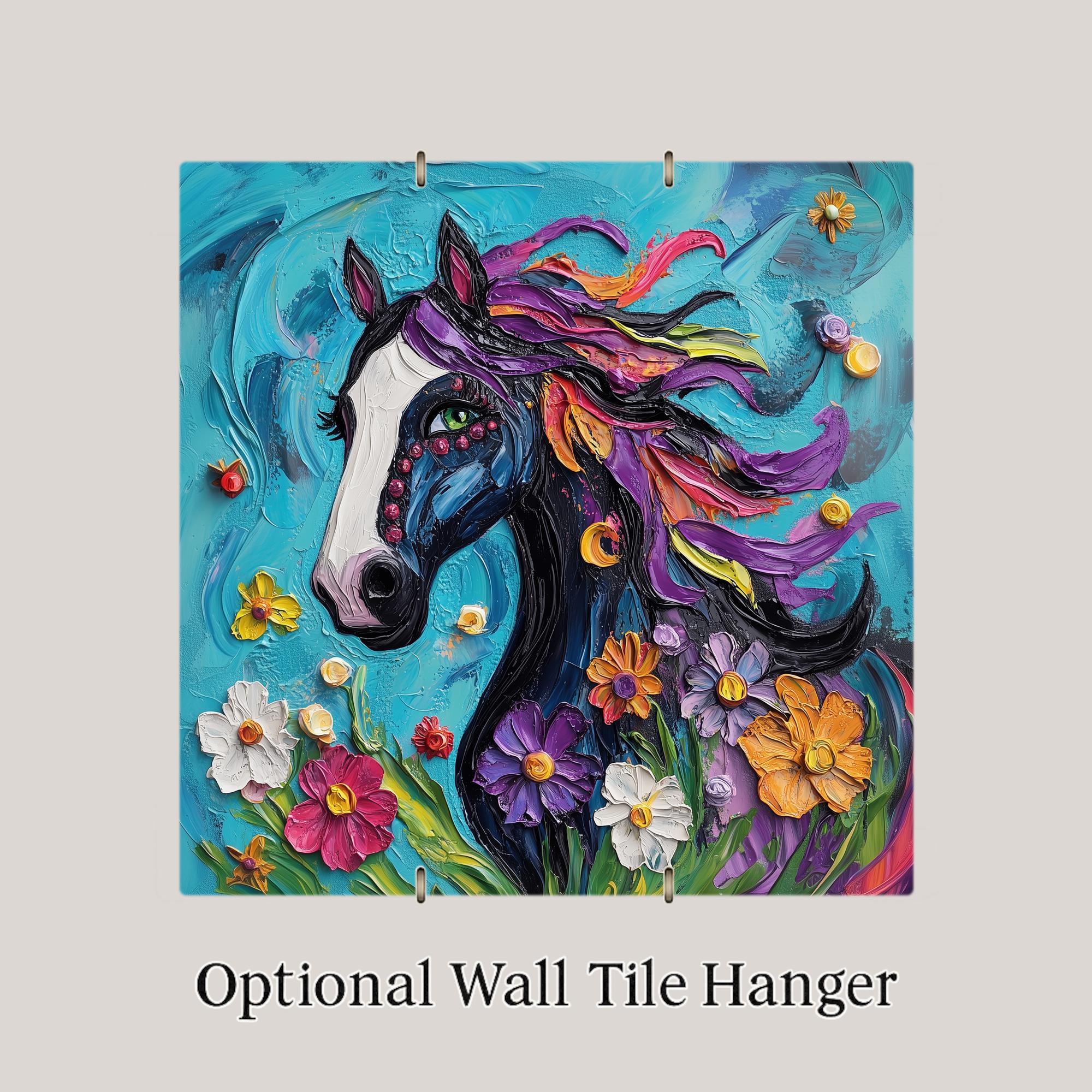 Add a pop of playful color to your space with this whimsical horse ceramic tile. Designed in a vivid, textured style, this boho equestrian tile features a dark horse with a flowing rainbow mane, dotted with wildflowers and bright blossoms. The painterly strokes and cheerful colors give it a joyful, expressive look that horse lovers will adore.