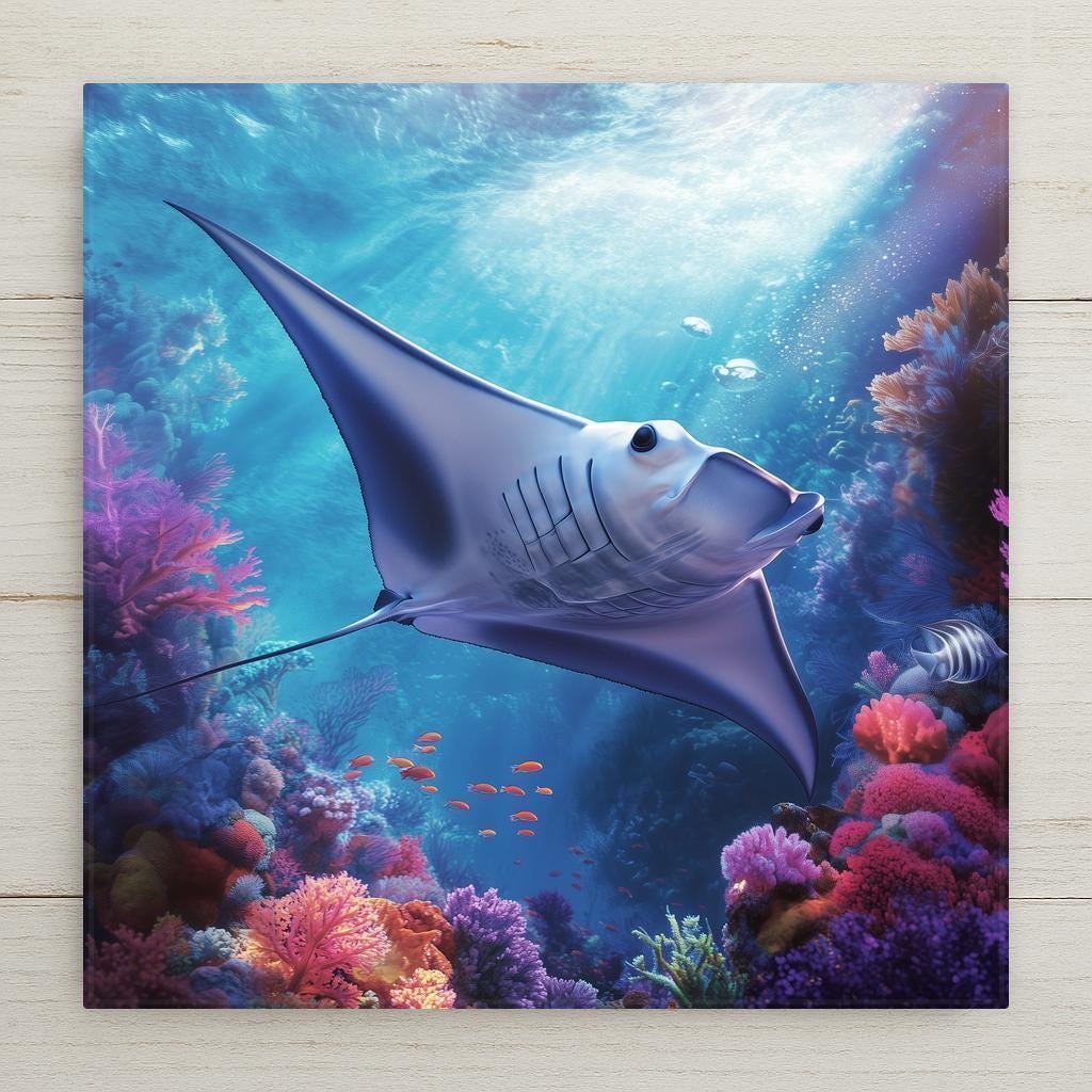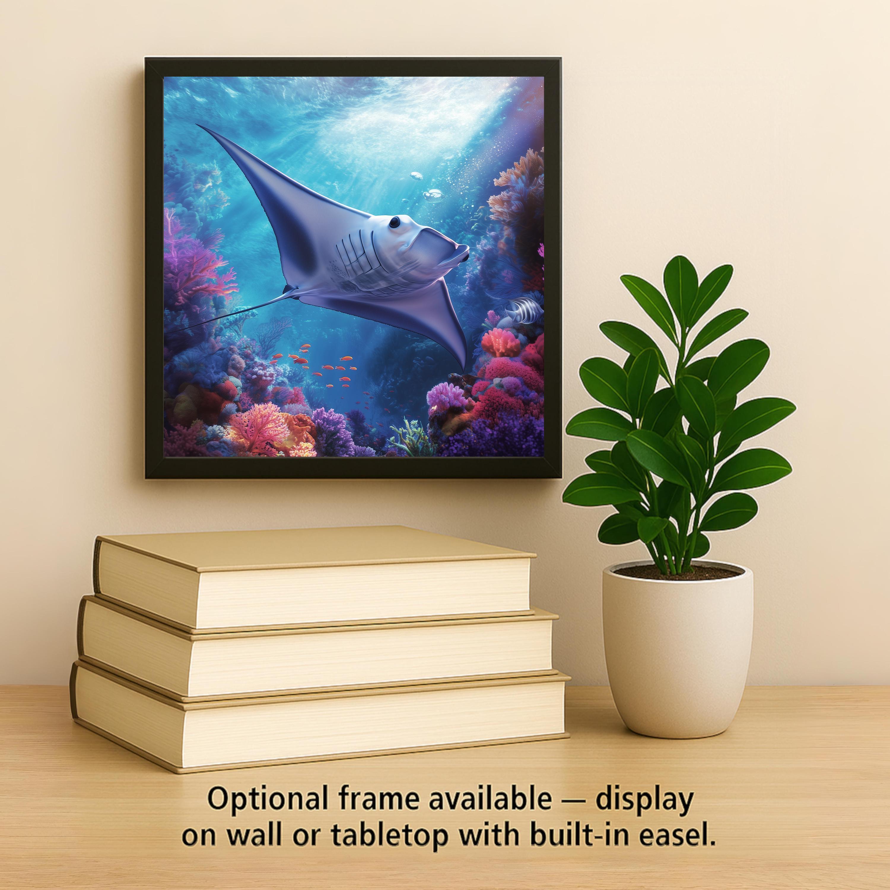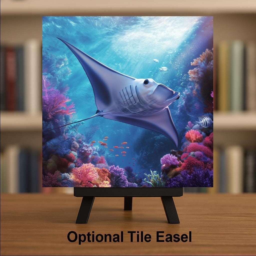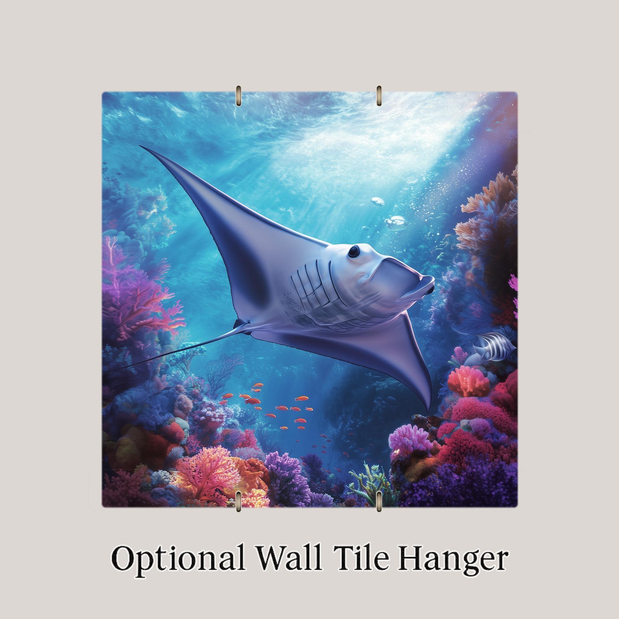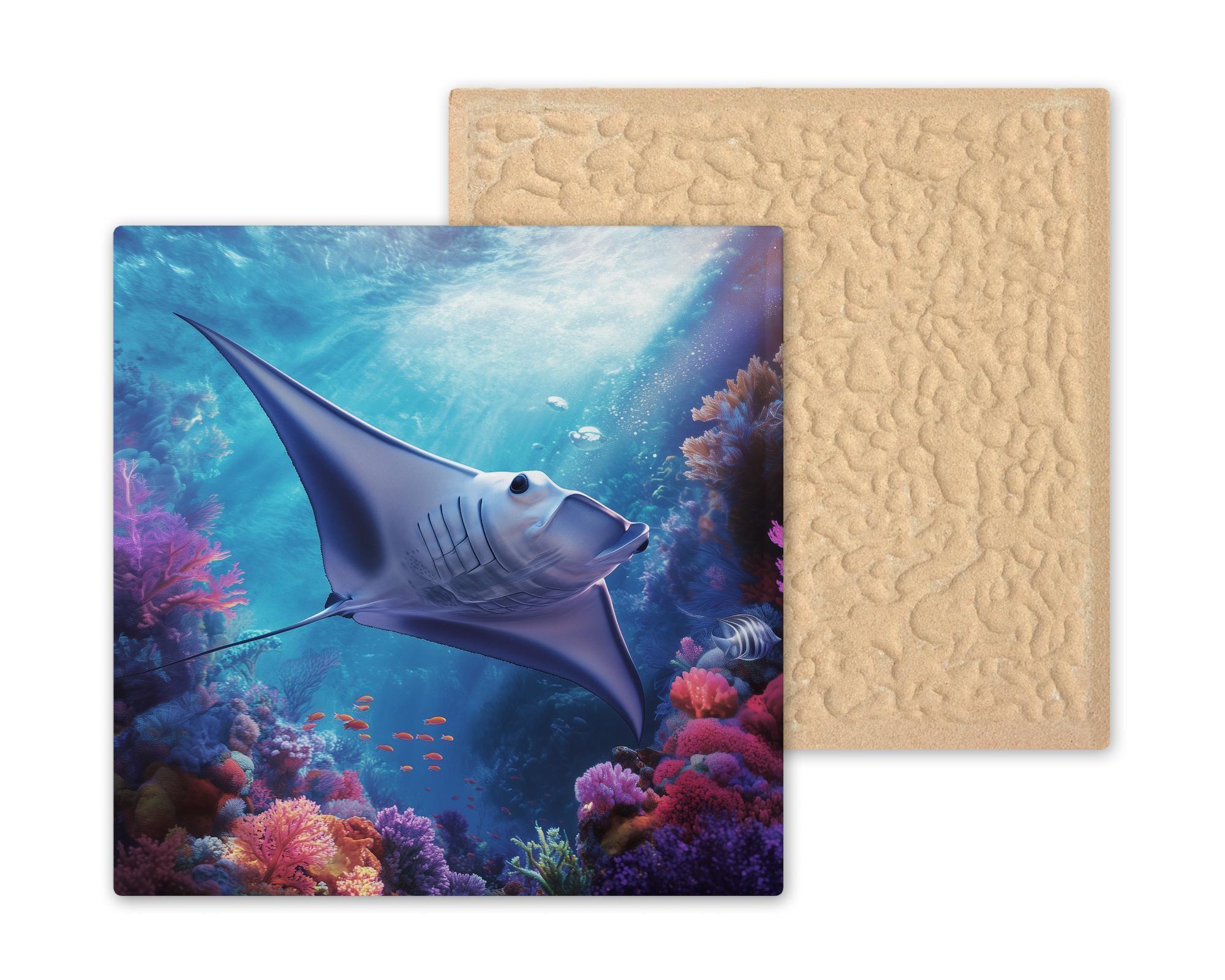 This manta ray ceramic tile wall art brings the magic of the ocean into your space. A majestic manta ray glides effortlessly over a vibrant coral reef, surrounded by schools of fish and brilliant undersea colors. The luminous water and delicate light beams create a sense of motion and tranquility, making this piece a standout in any marine-themed décor.