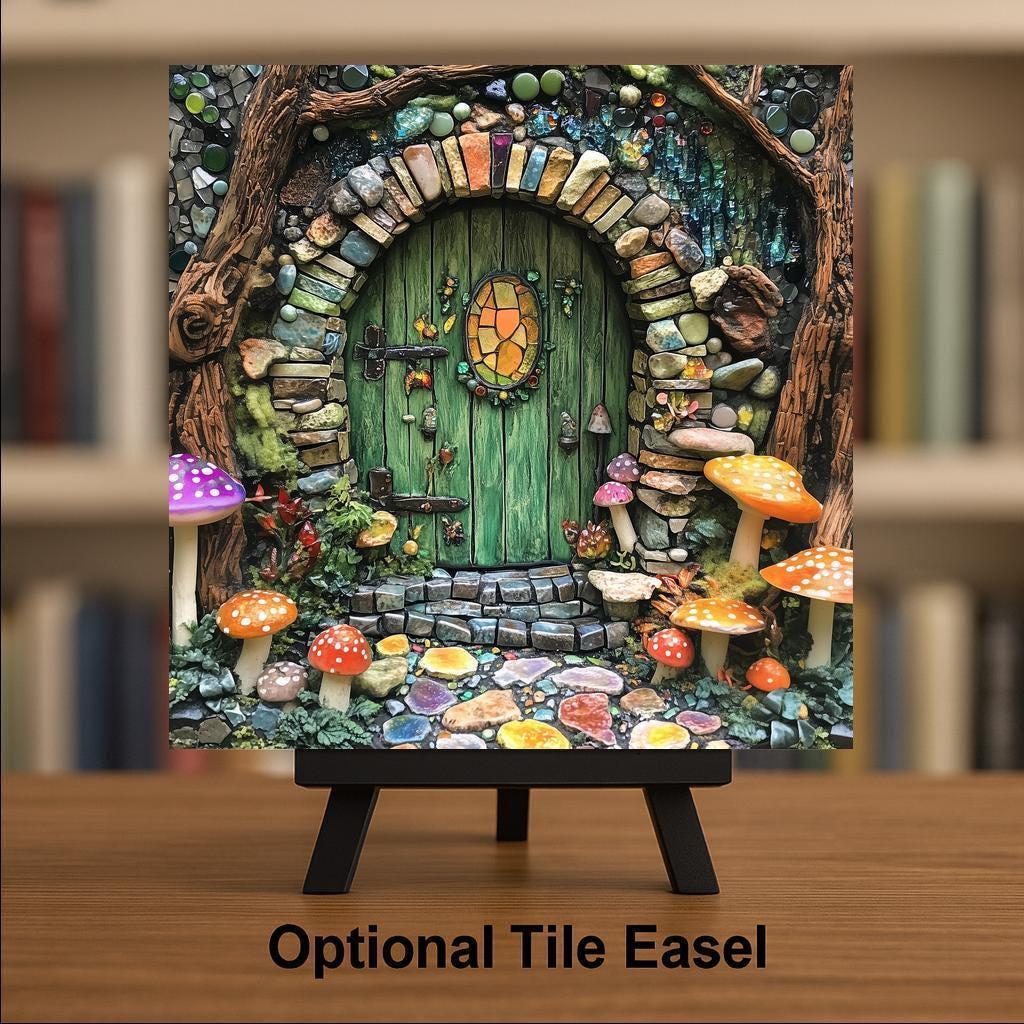 Bring fairytale magic to your walls with this whimsical fairy house mosaic tile. Featuring a mossy green round door set in a colorful stone arch, surrounded by bright toadstools, glassy gems, and rustic roots, this design blends cottagecore charm with fantasy flair. It’s a miniature world full of texture and sparkle, perfect for dreamers and fairy enthusiasts.