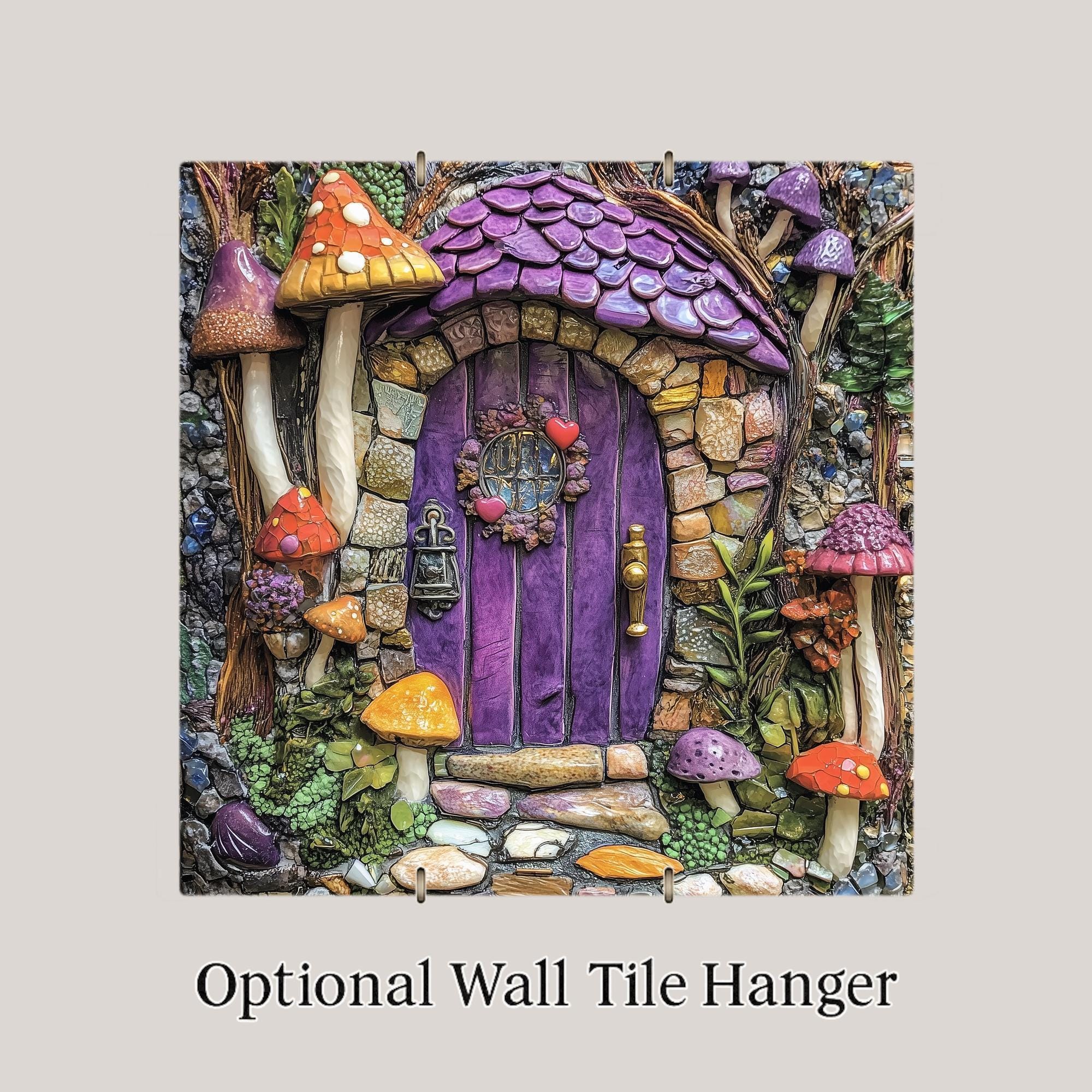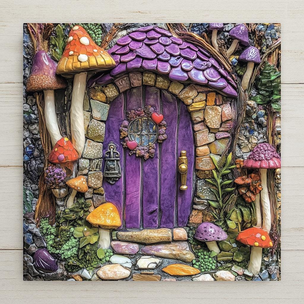 This Whimsical Fairy House Ceramic Tile brings fairy-tale magic right to your wall. Styled like a detailed mosaic, the piece features a vivid purple door surrounded by colorful stones, mushrooms, vines, and woodland textures. The tile’s playful design evokes a hidden cottage in an enchanted forest—ideal for fantasy lovers, nature dreamers, and anyone who finds joy in whimsy.