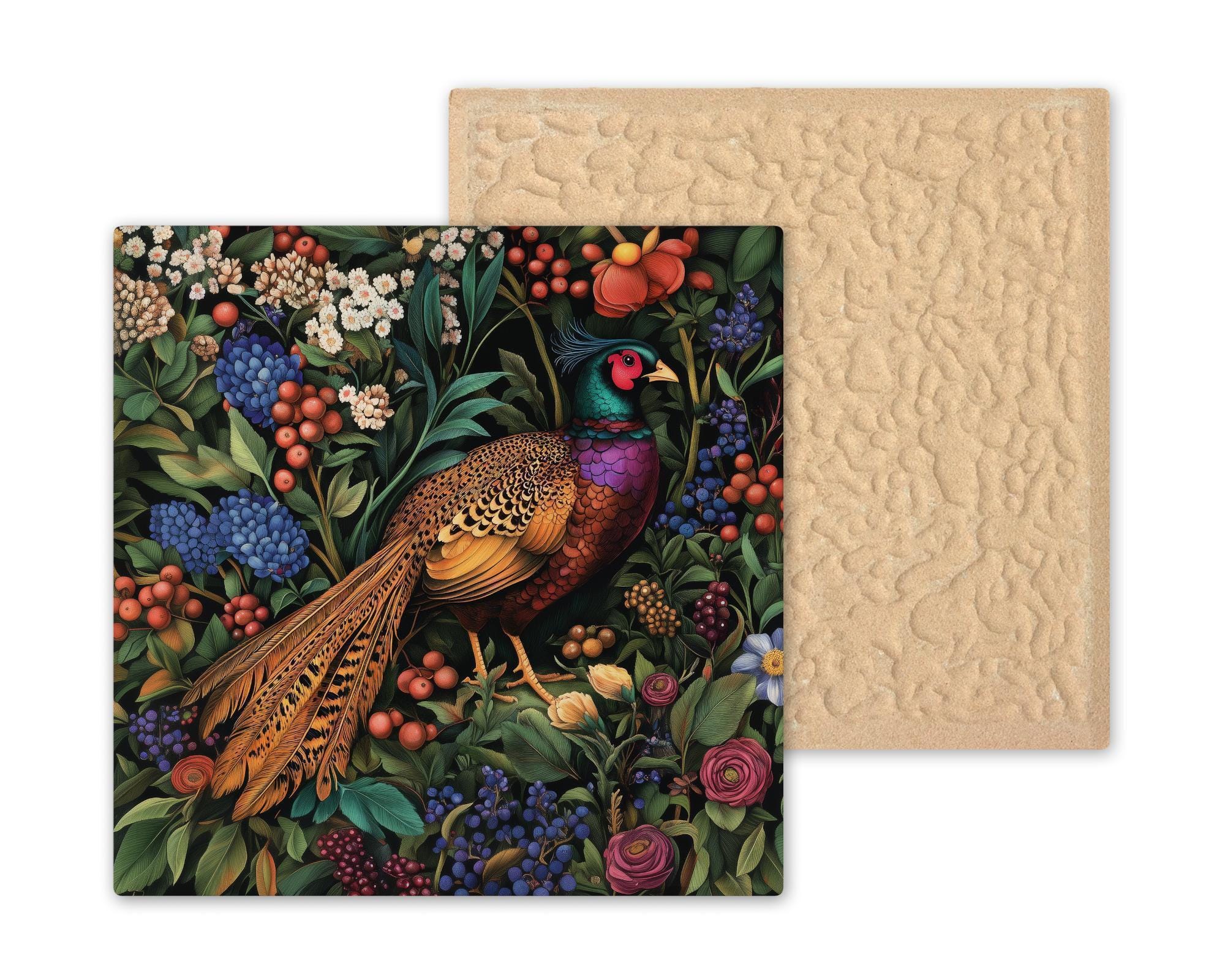 While it looks like a vintage botanical illustration or textile panel, this is a permanently printed ceramic tile—not painted or embroidered. The glossy finish ensures the artwork remains bold and clear for years to come. The pheasant’s golden feathers and vivid background pop against dark greens and deep blues, creating a dramatic and timeless decor piece.