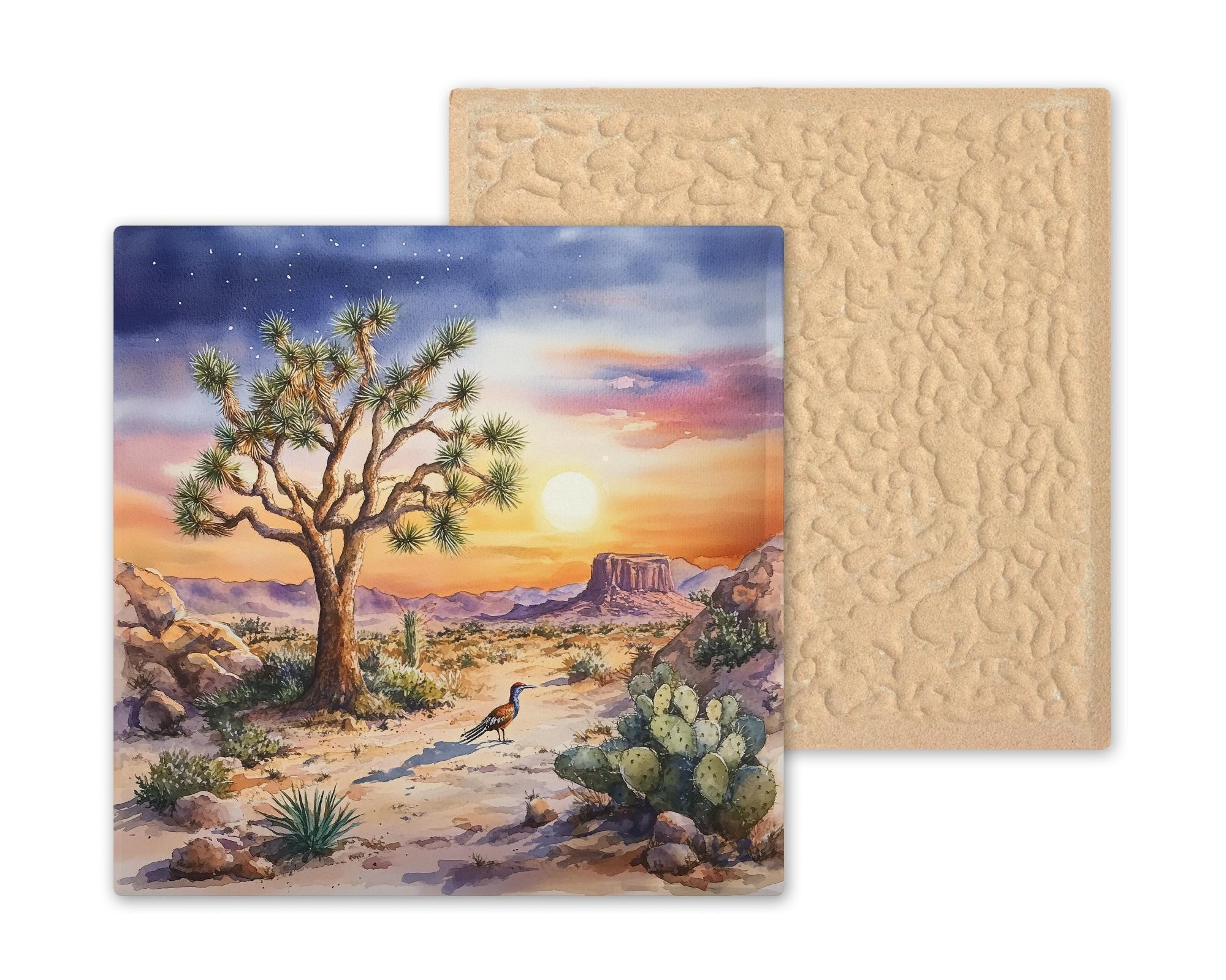 Although it has the look of stained glass, the artwork is permanently infused into the tile surface, creating a smooth finish with vivid color and fine desert detail.