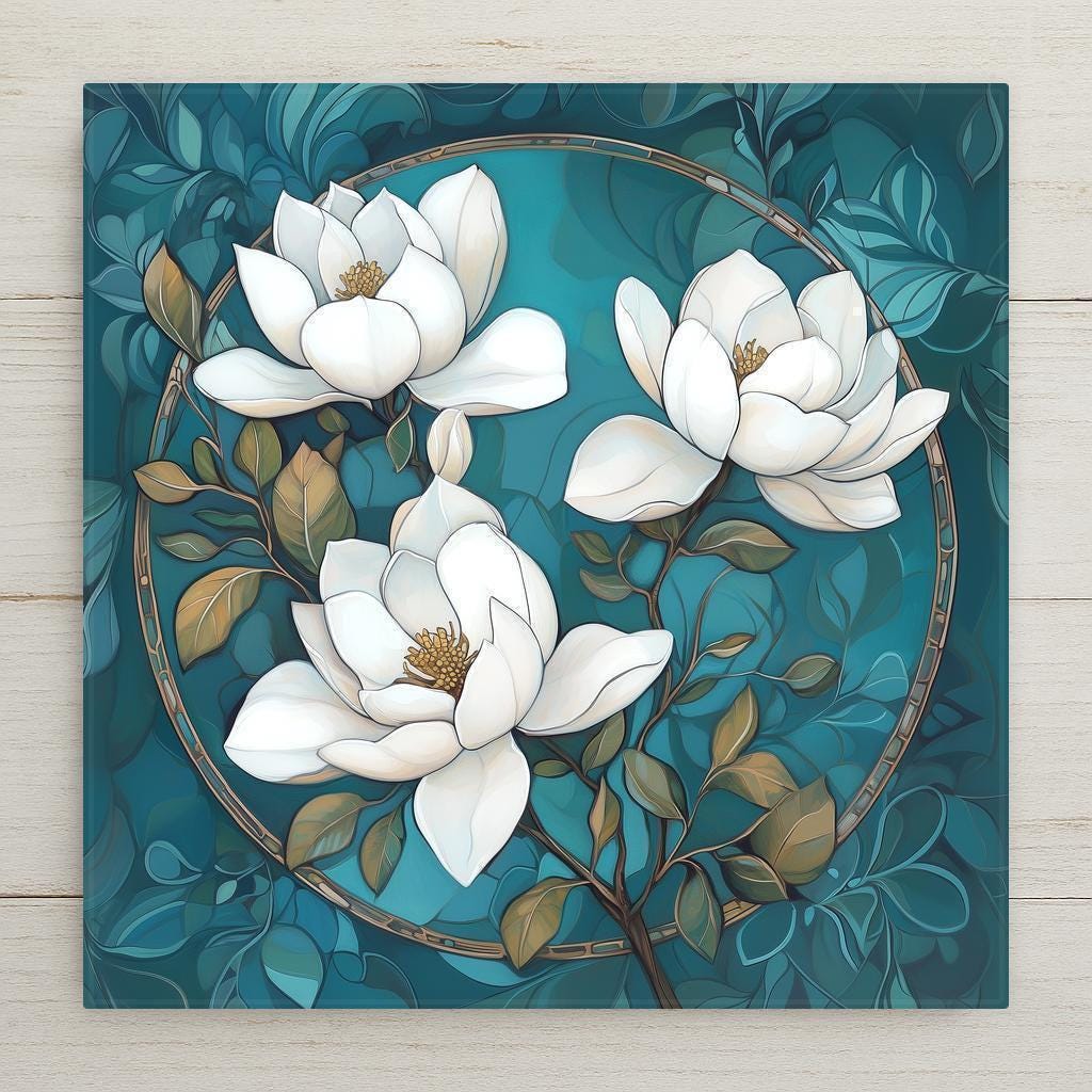 Add timeless floral elegance to your home with this handmade ceramic tile featuring a trio of white magnolia flowers. Inspired by Art Nouveau style, this piece blends curving lines, vintage botanical motifs, and a rich teal background for a peaceful and refined accent. It’s perfect for wall art lovers, flower collectors, and anyone who appreciates fine decorative pieces with natural inspiration.