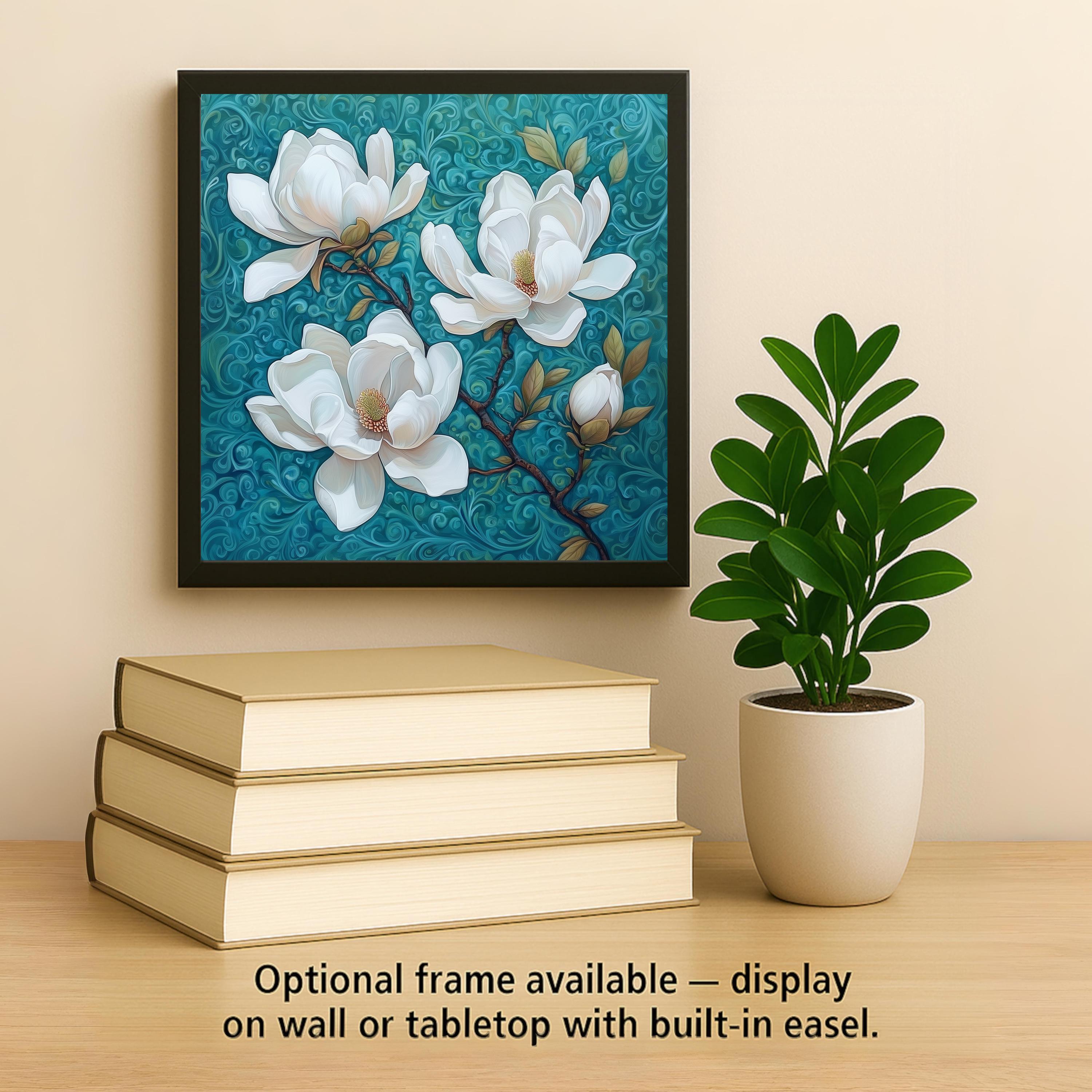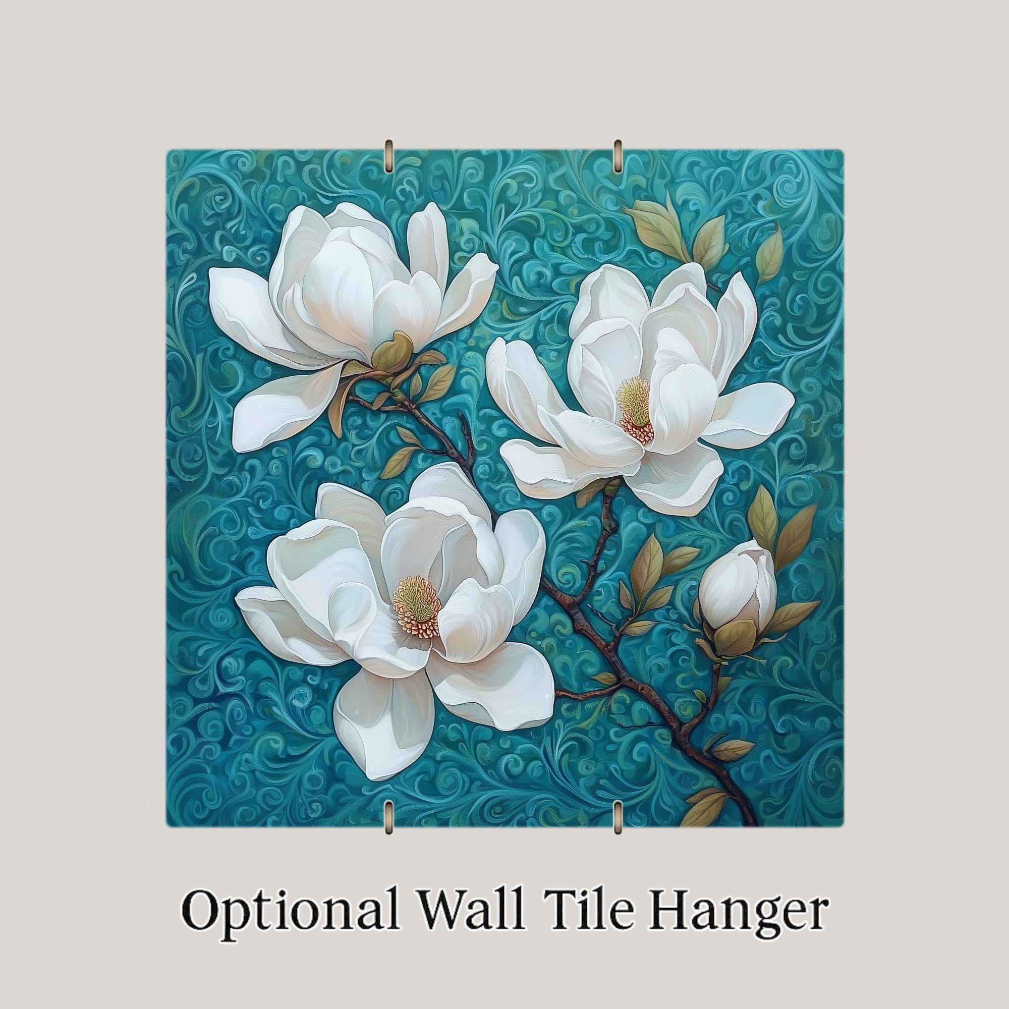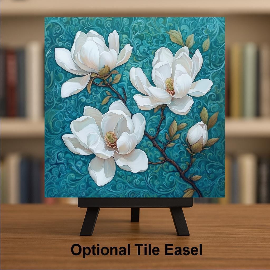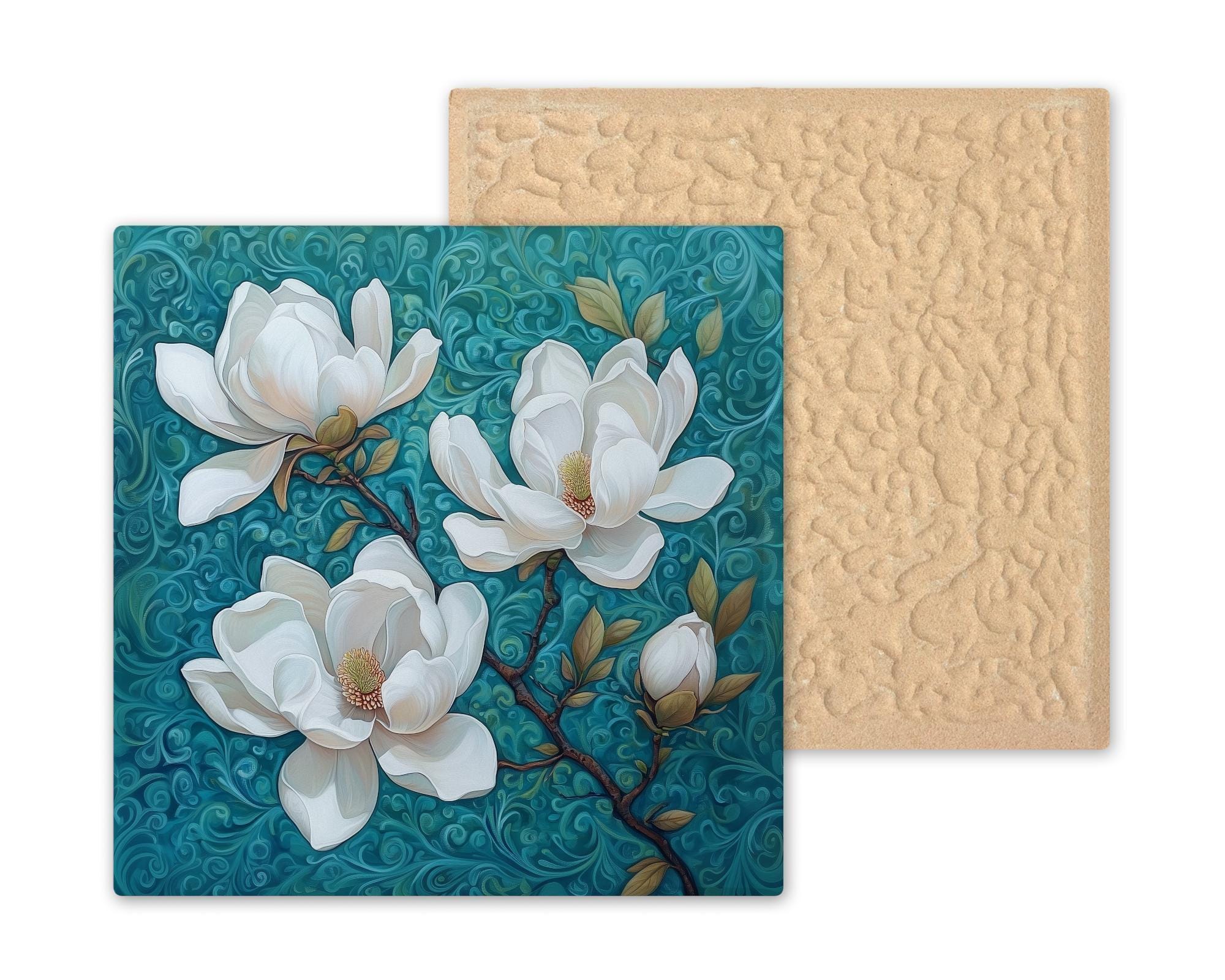 This white magnolia ceramic tile captures the gentle beauty of spring in bloom. Three magnolia blossoms open wide on a swirling teal backdrop, their creamy petals and golden centers offering a sense of calm and renewal. The hand-detailed design is both modern and timeless, making this floral wall tile perfect for brightening up any corner of your home.