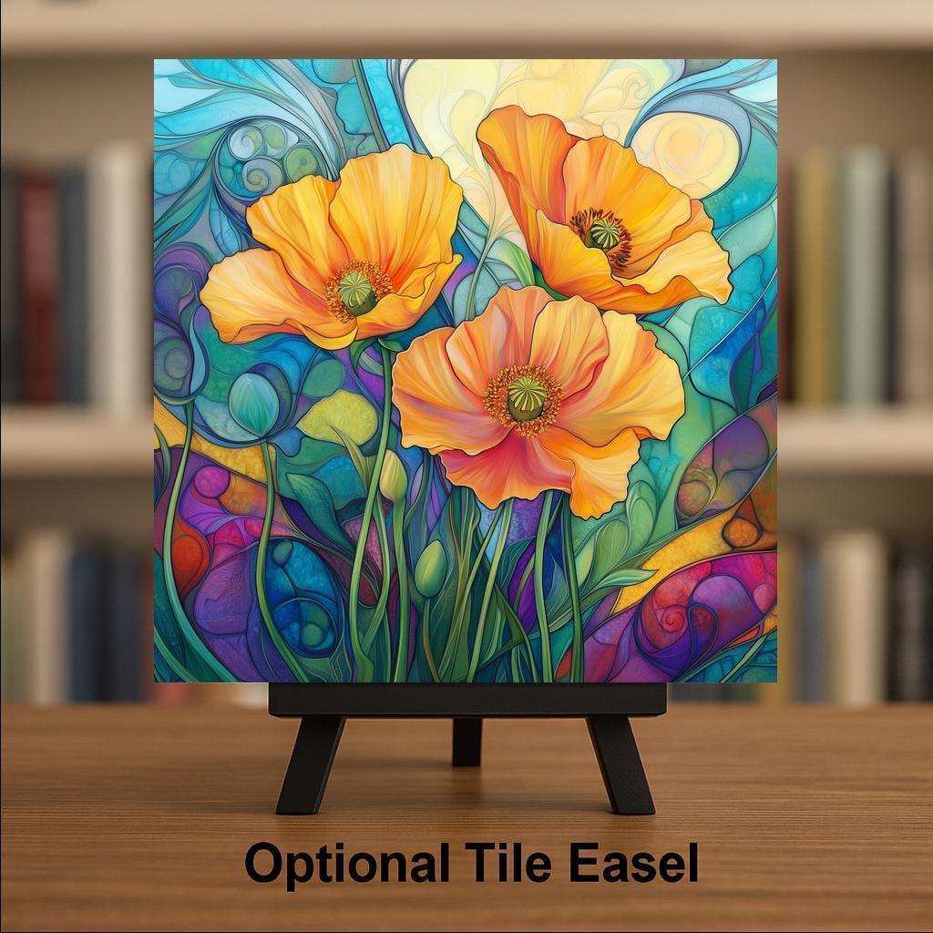 Infuse your home with the cheerful energy of wildflowers with this handcrafted California poppies ceramic tile. Designed in a stained glass style, this vibrant artwork features poppies in lush orange and red tones blooming across a serene landscape. The floral pattern radiates warmth and joy, bringing a splash of botanical beauty to any decor.