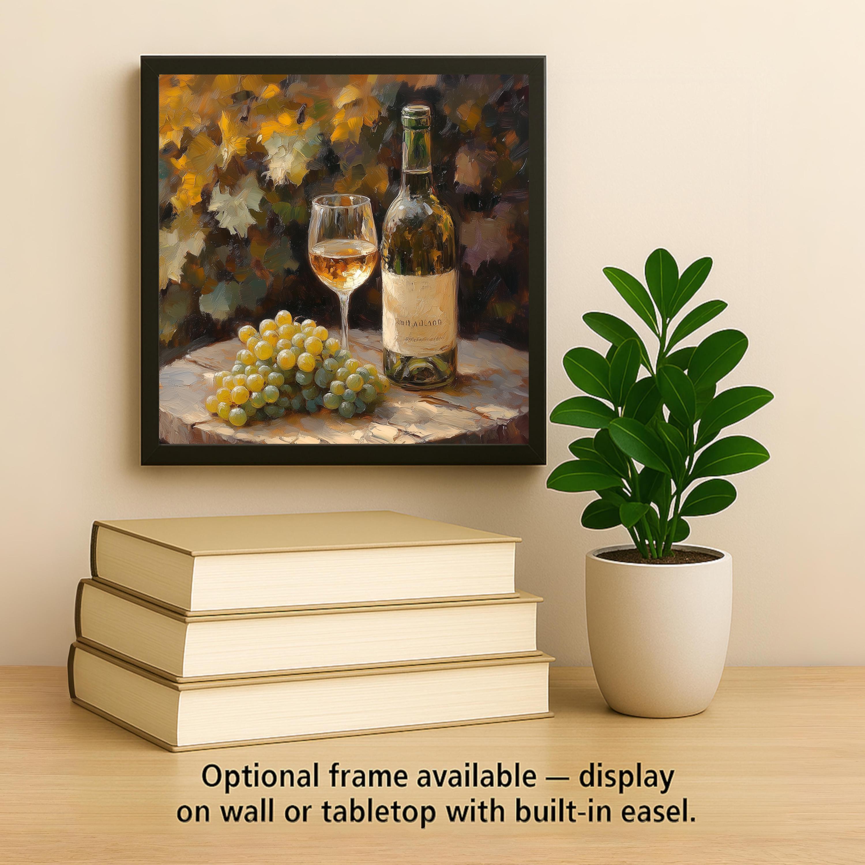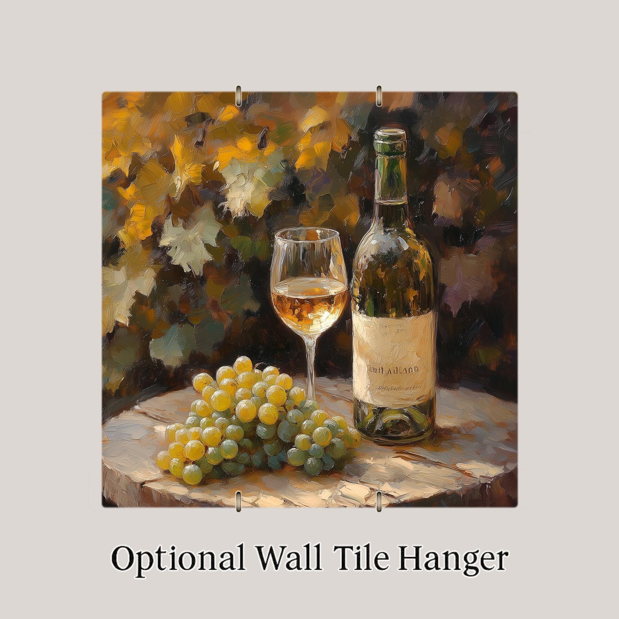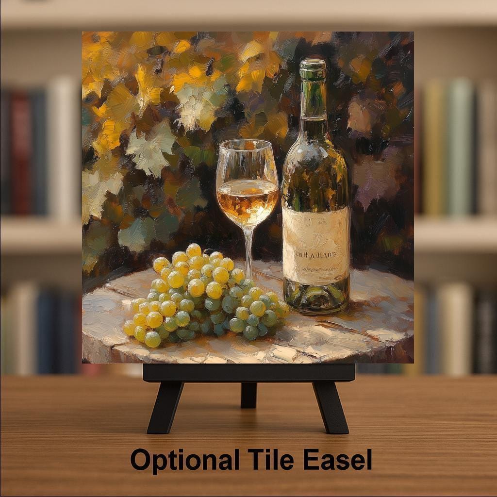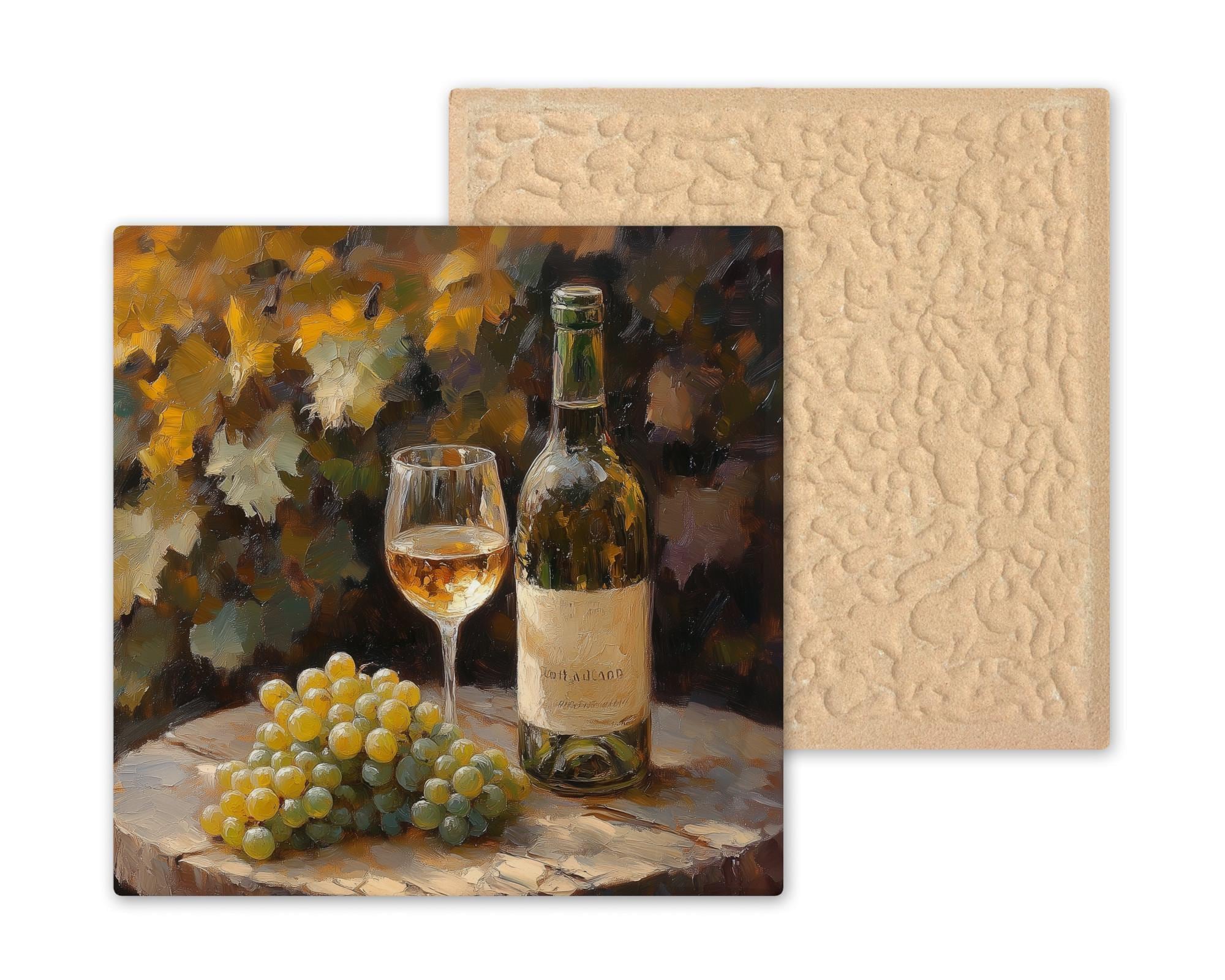 Add a touch of Tuscan-inspired charm to your kitchen with this rustic white wine ceramic tile. Featuring a detailed still life of a wine bottle, filled glass, and fresh grape cluster set on an aged wood table, the artwork glows with golden warmth and textured brushstrokes. It’s like a quiet afternoon in the vineyard, captured in ceramic.