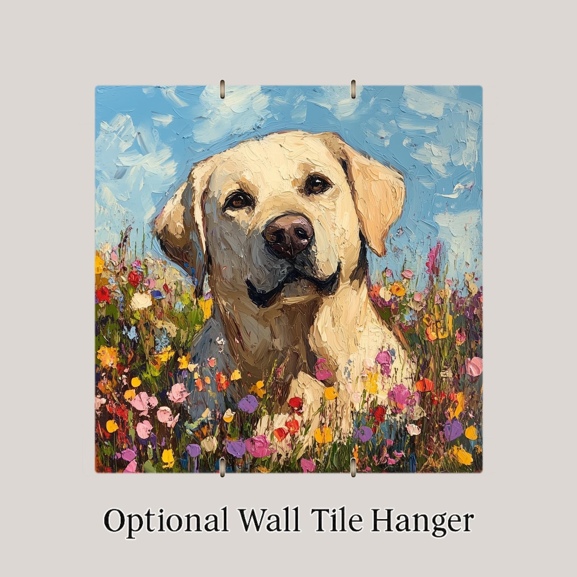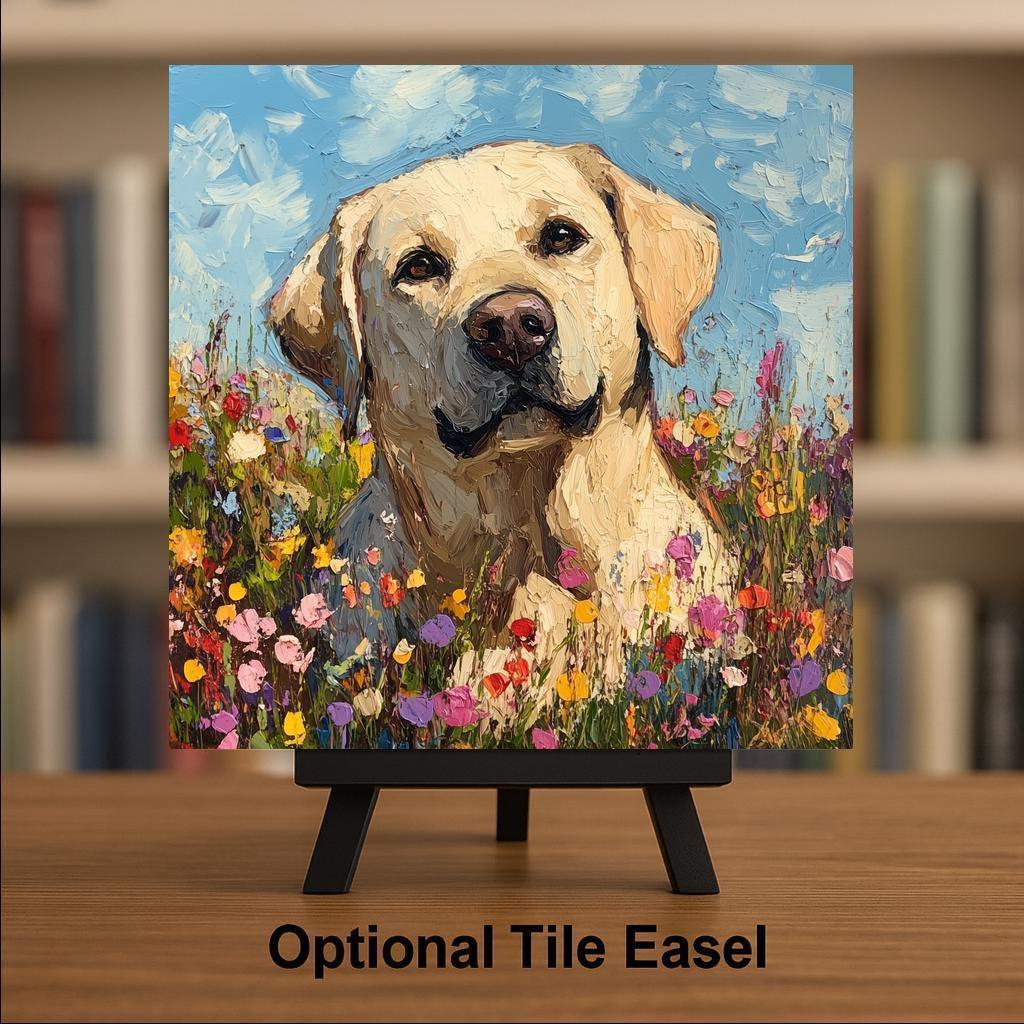 The expressive brush strokes and vibrant wildflowers create a joyful atmosphere that reflects the playful spirit and loving companionship Labradors bring to their families. The composition balances soft natural tones with lively color, making it both eye-catching and welcoming.
