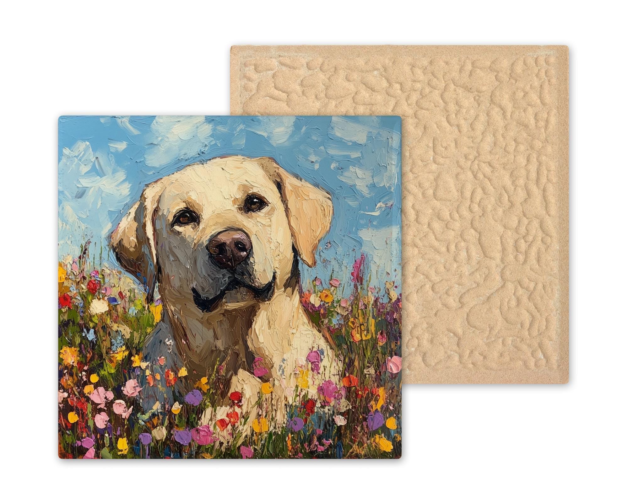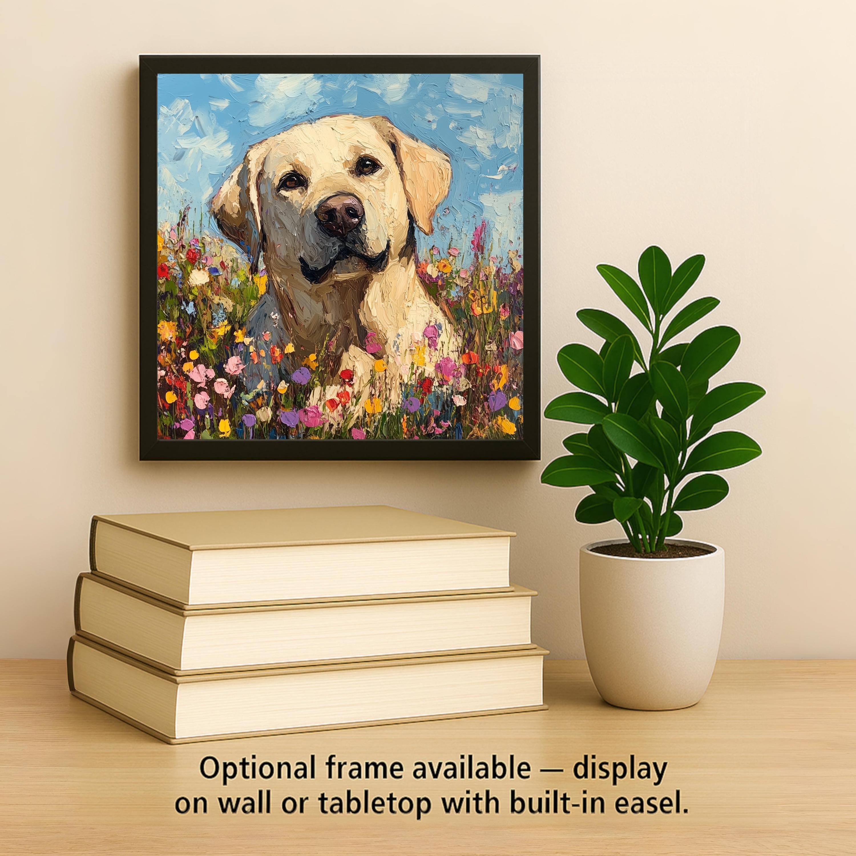 Labrador Retrievers are known for their loyalty, intelligence, and affectionate personalities. This artwork captures that gentle nature in a bright meadow scene filled with colorful flowers and open sky.