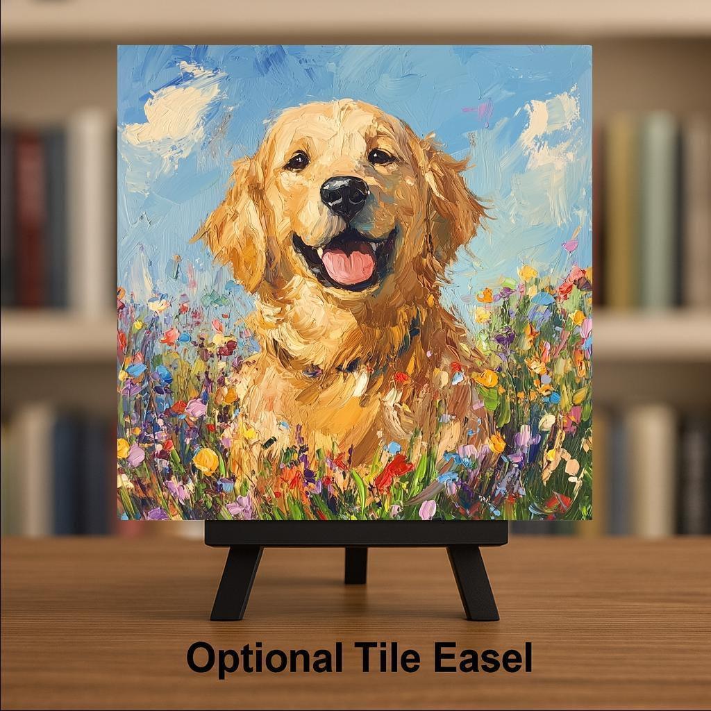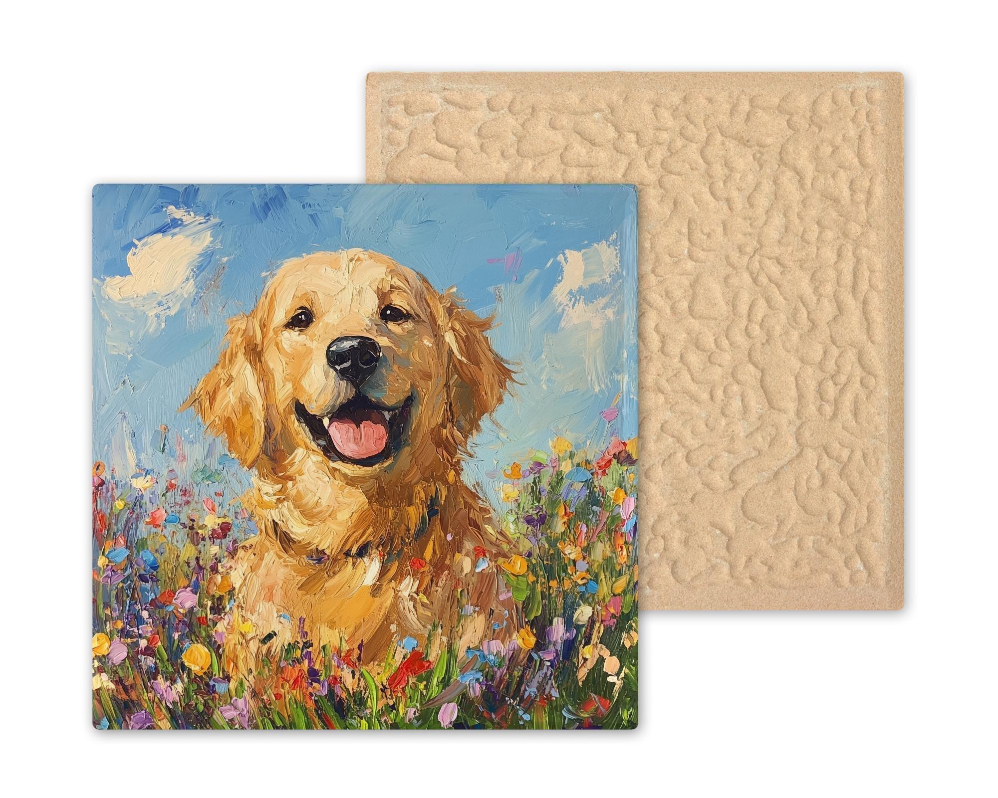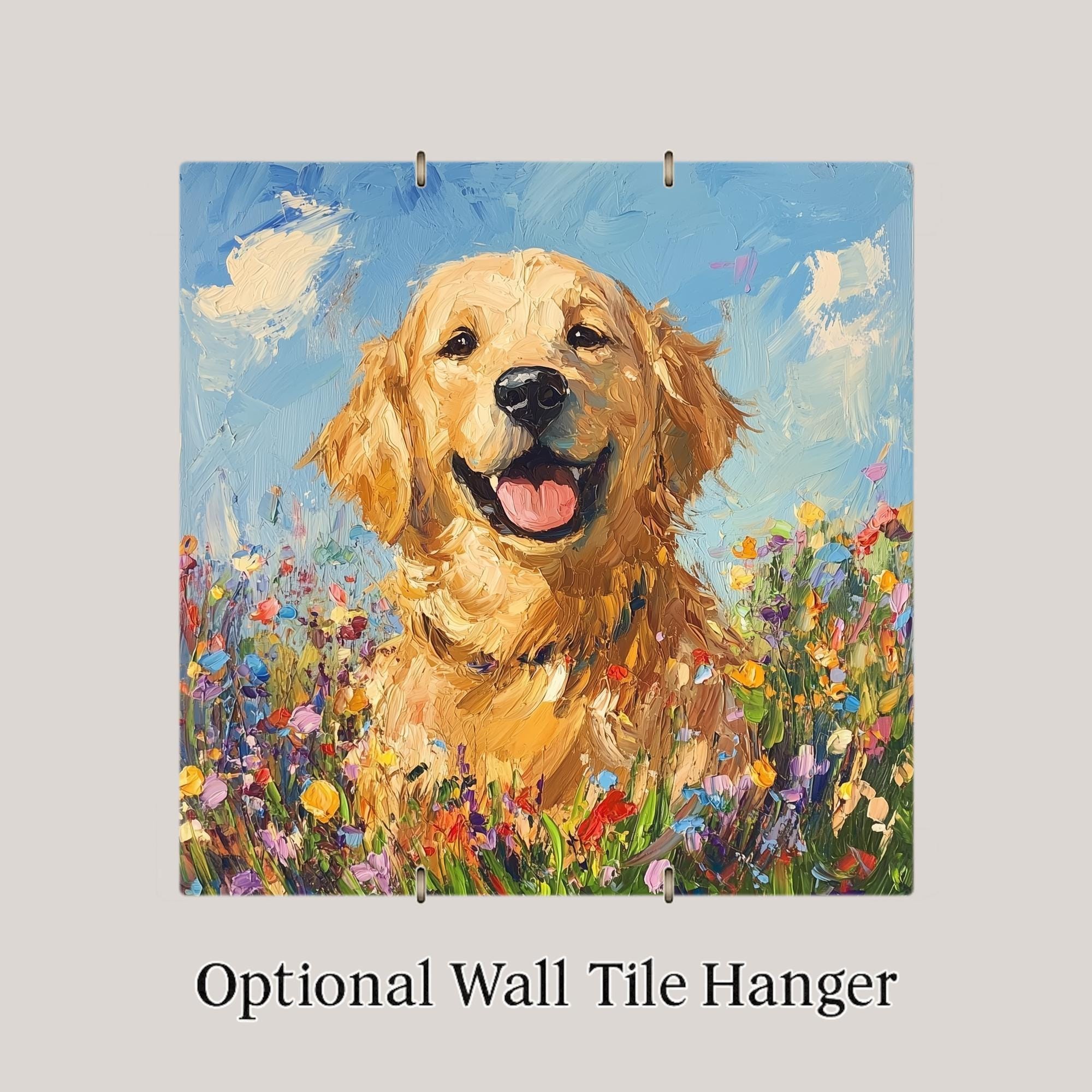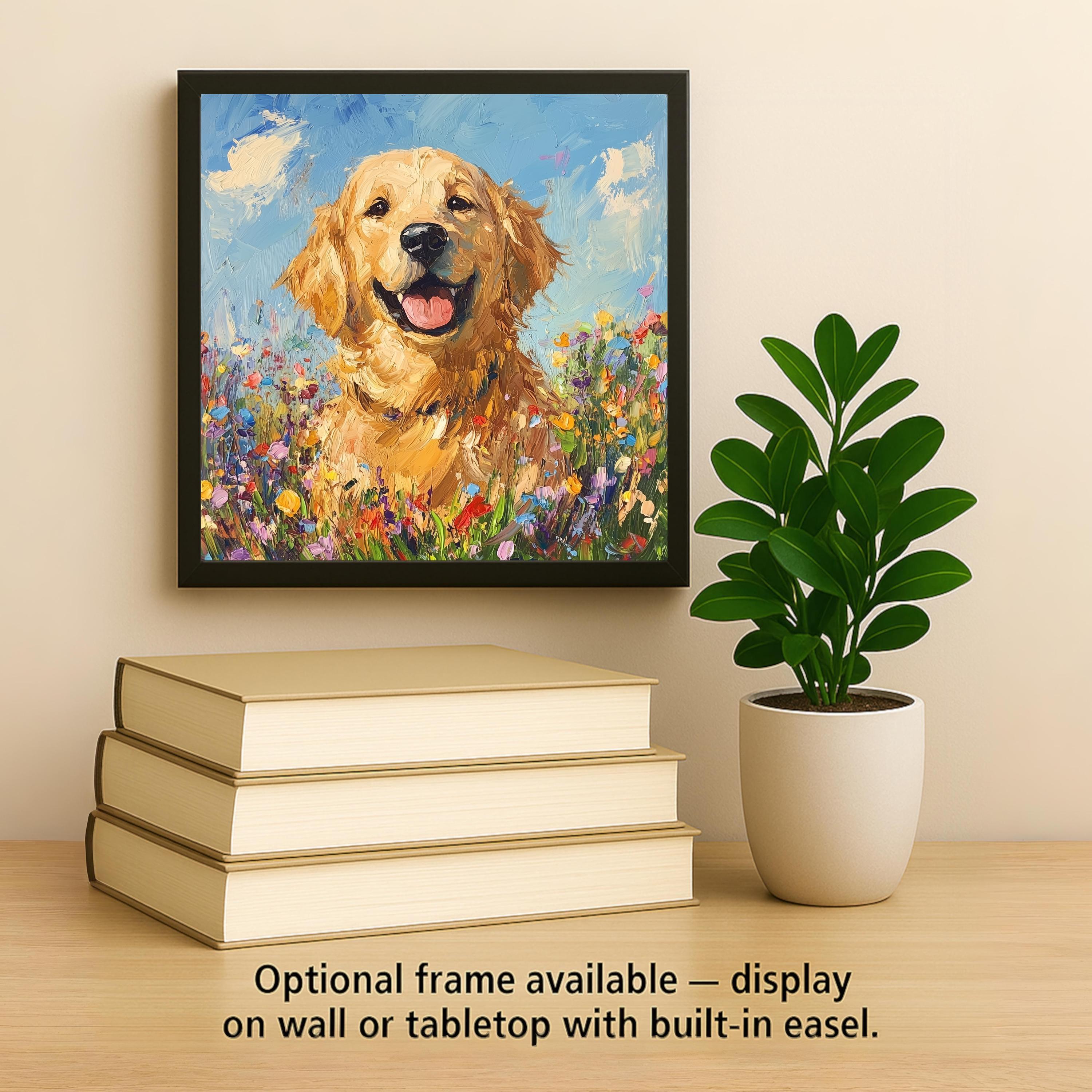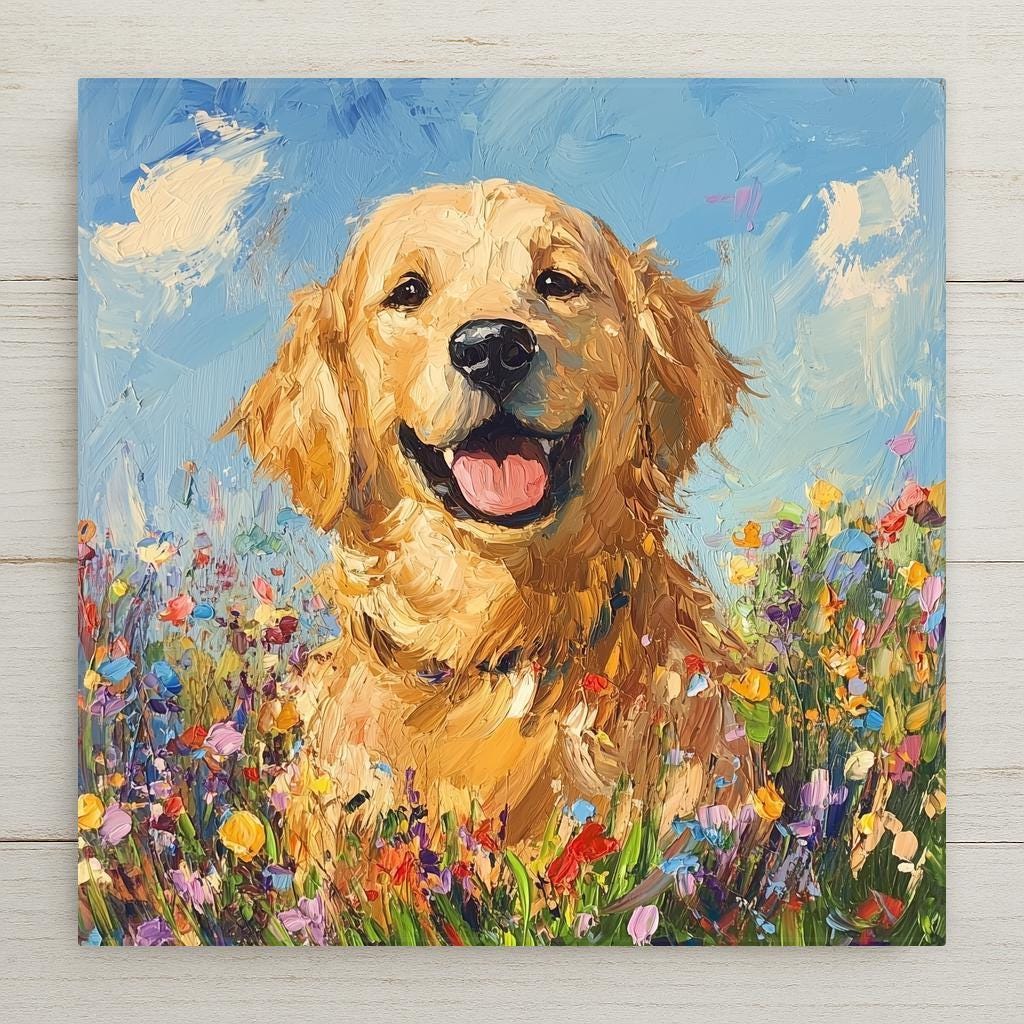 Golden Retrievers are beloved for their gentle nature, intelligence, and unwavering loyalty. This artwork captures that joyful personality in a bright meadow scene filled with colorful wildflowers and open sky.