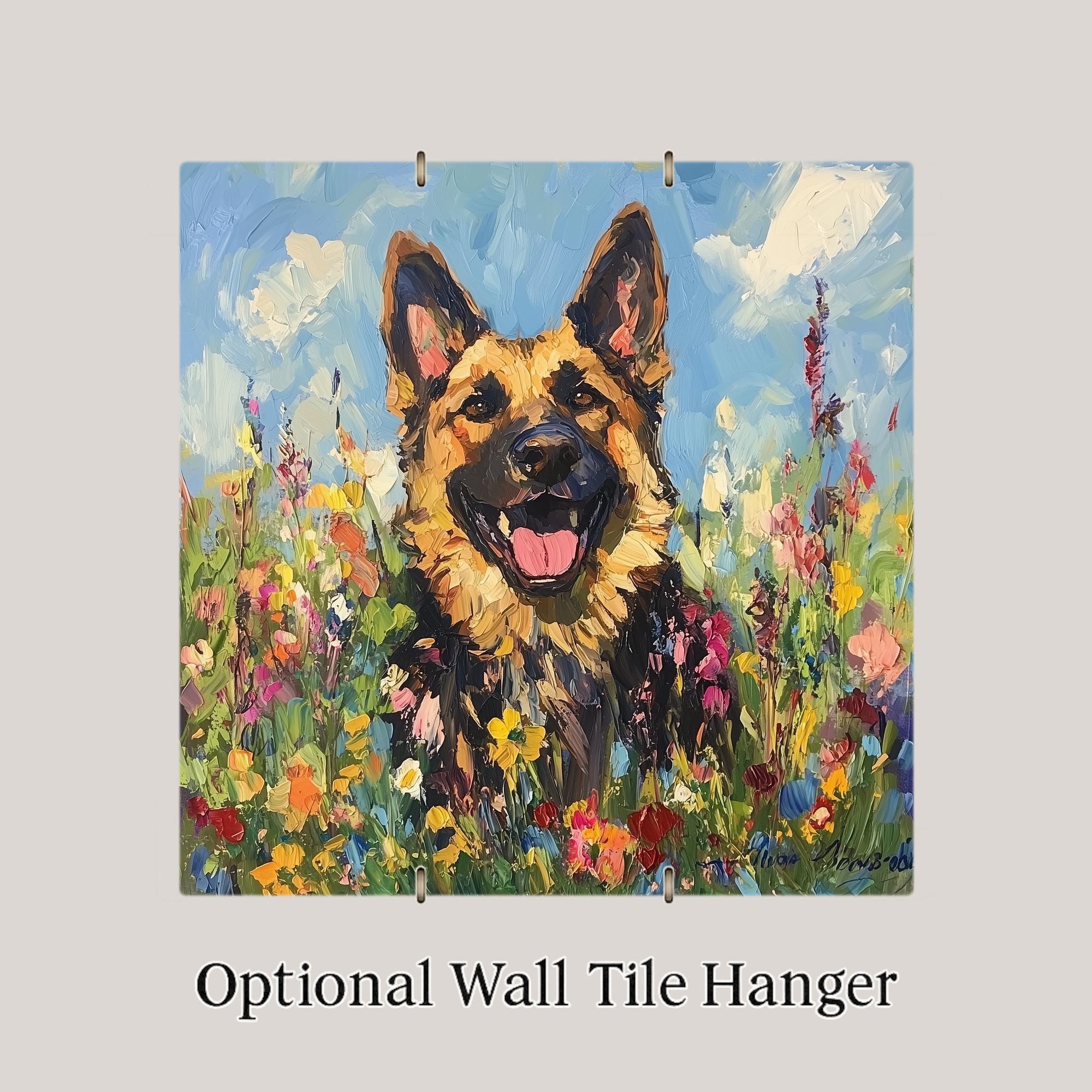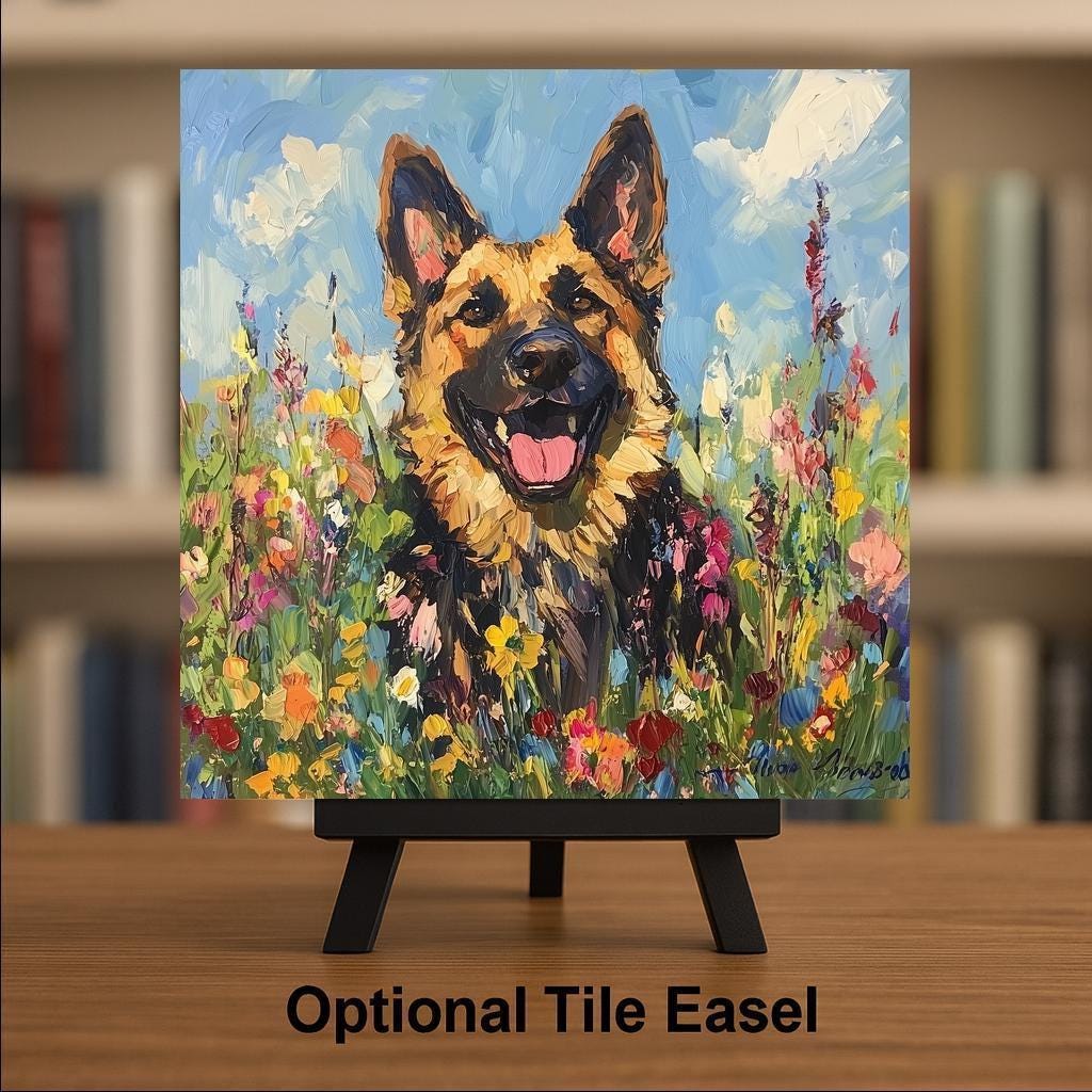 This German shepherd portrait ceramic tile was designed for the buyer who loves the breed's aesthetic as much as its character — who sees the shepherd as a genuinely beautiful animal and wants that beauty on their wall in a form that does it justice. The stained glass treatment amplifies the breed's natural drama: the alert stance, the rich coat colors, the intensity of the gaze.