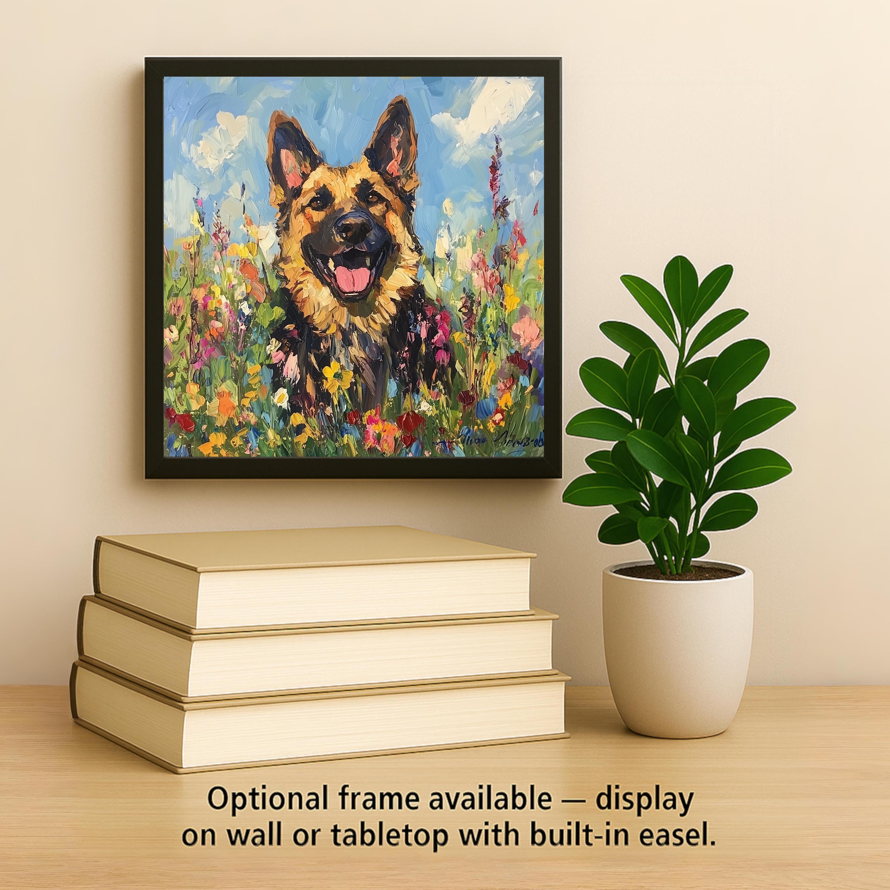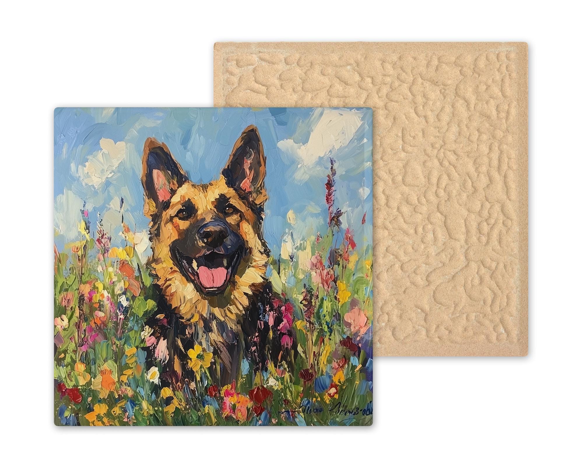 It pairs naturally with the companion German shepherd memorial tile for a two-tile gallery that captures both the beauty and the bond of life with a GSD.