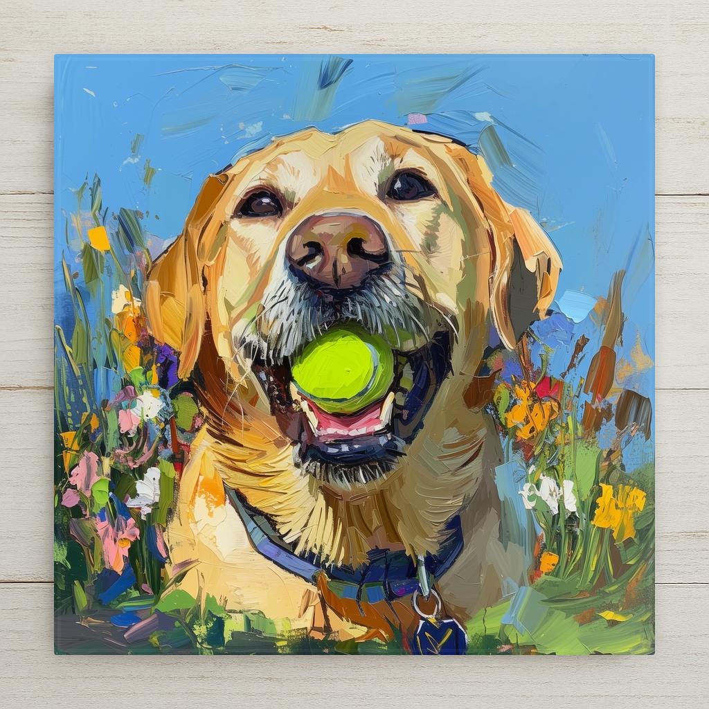 This Yellow Lab Ceramic Tile captures the infectious happiness of a Labrador Retriever enjoying its favorite game. With a tennis ball in its mouth and bright wildflowers in the background, this impasto-style artwork exudes energy, loyalty, and the lovable enthusiasm Labs are known for.