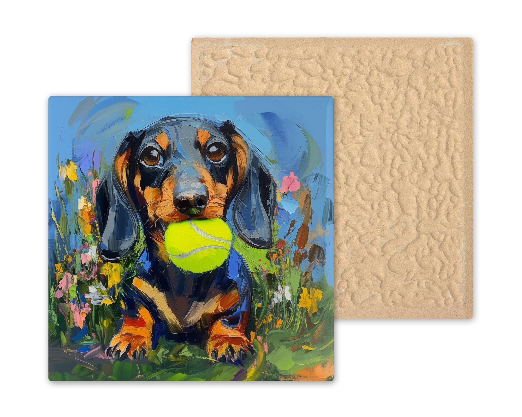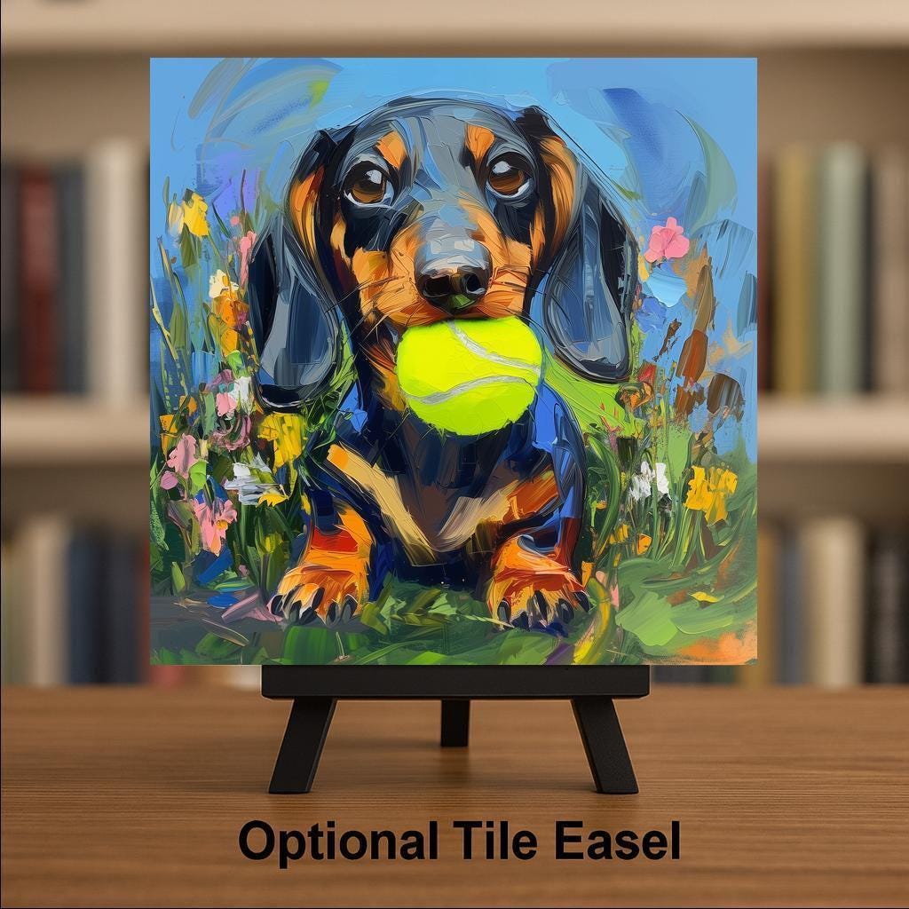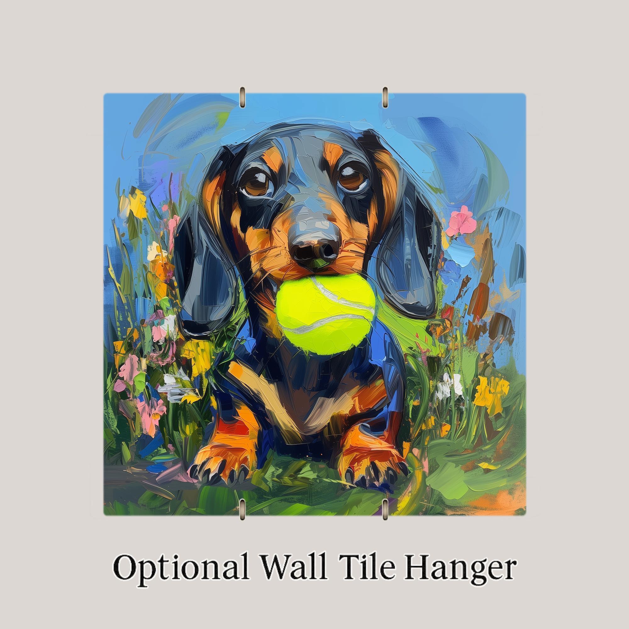 The dachshund may be small in size, but their personality is famously larger than life. This playful dachshund wall art ceramic tile celebrates that spirited character with a joyful illustration of a curious wiener dog proudly holding a bright tennis ball. Surrounded by colorful flowers and painted with lively expressive brushstrokes, the design captures a moment every dog owner knows well — the hopeful look that says, “Throw it again!”