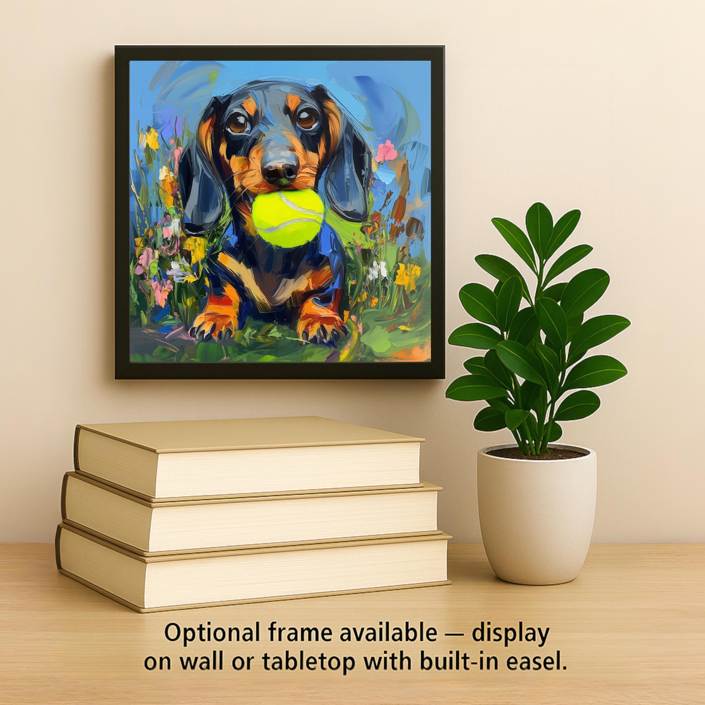 The vibrant artwork blends cheerful colors with a painterly style that brings movement and warmth to the image. The dachshund’s long ears, soulful eyes, and oversized tennis ball create a fun focal point that instantly brightens a room. Whether displayed in a living room, hallway, office, or dog-themed gallery wall, it adds a friendly and lighthearted presence to your décor.