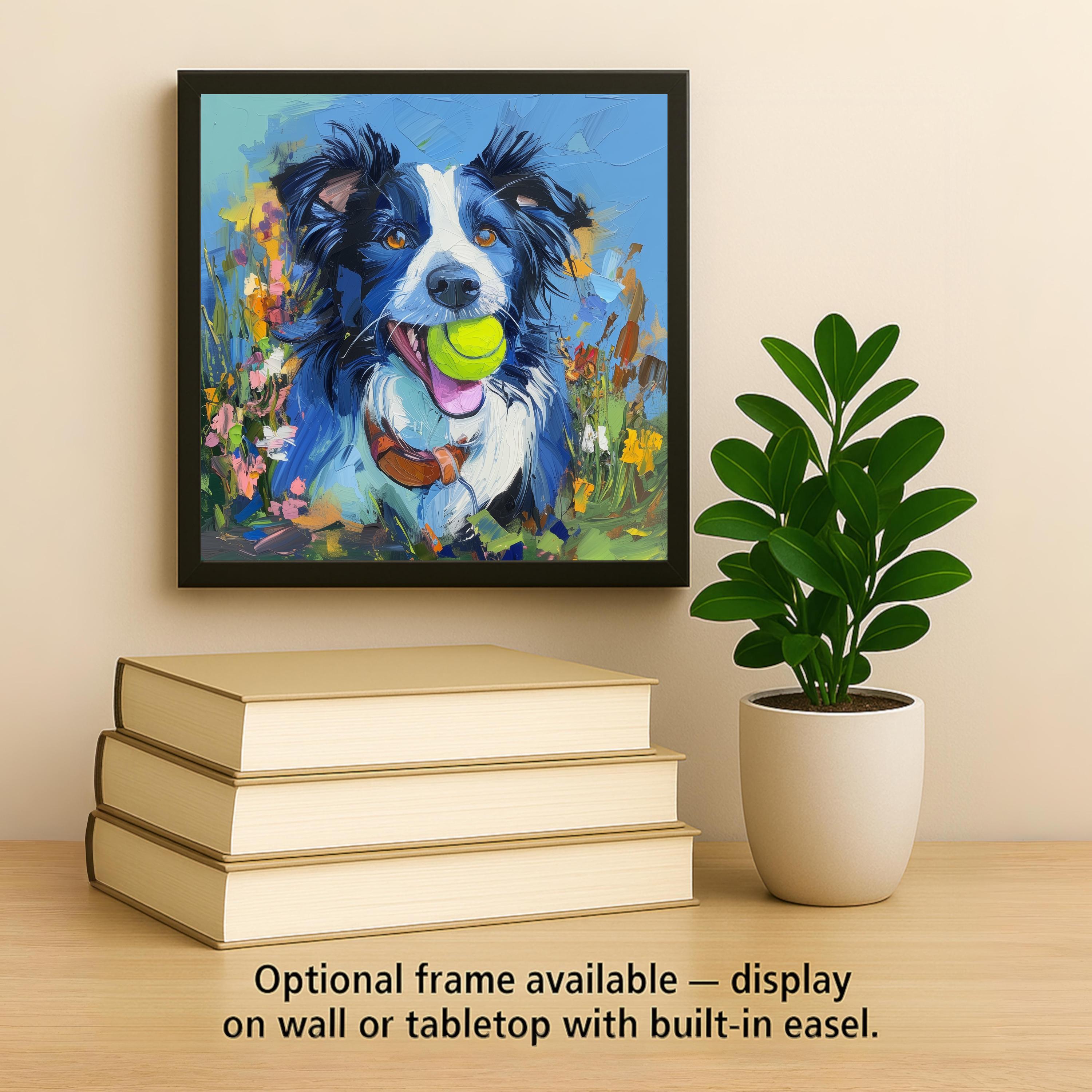 Bring home the unstoppable spirit of a border collie with this Playful Dog Portrait Ceramic Tile, showcasing a black-and-white collie beaming with a bright yellow tennis ball. Surrounded by wildflowers and painterly color splashes, this energetic piece captures the loyalty, drive, and joy that defines this remarkable breed.