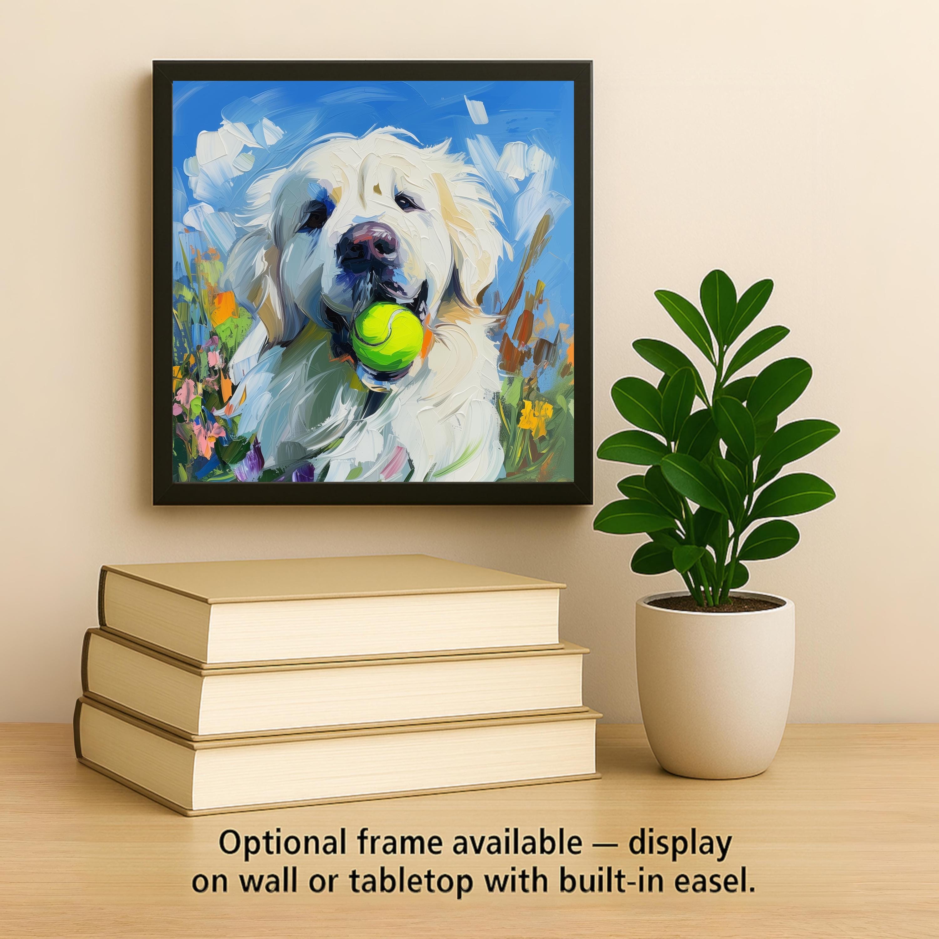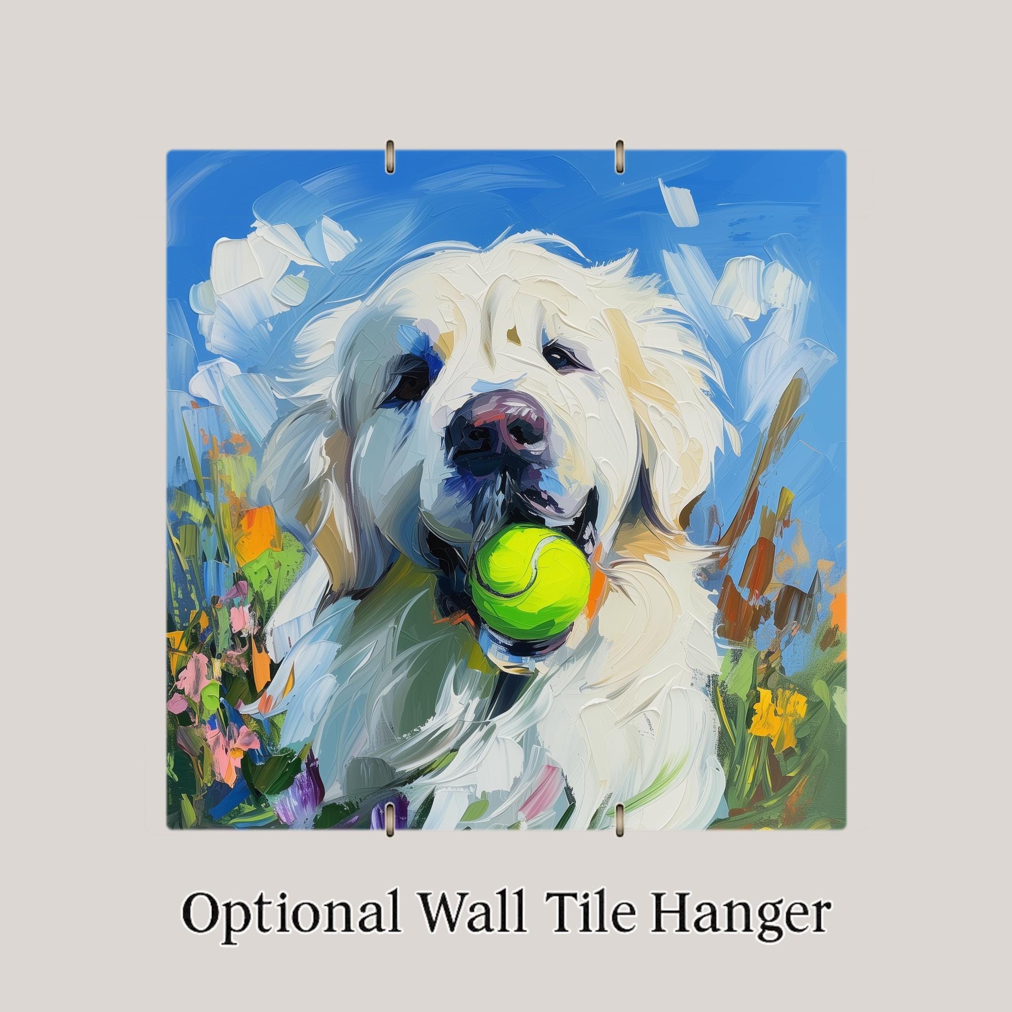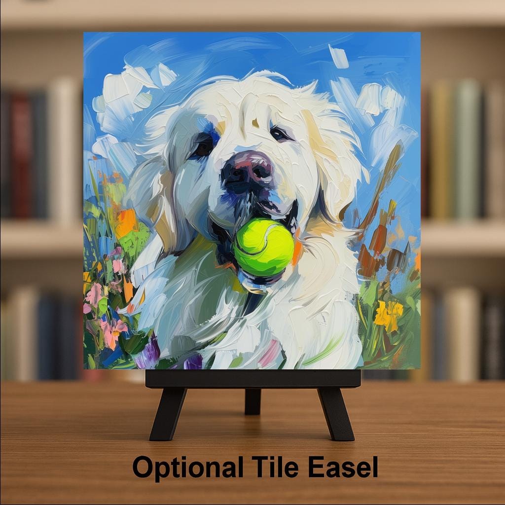 This Great Pyrenees Ceramic Tile brings the peaceful power of this majestic breed into your home in a colorful and joyful way. With a tennis ball tucked happily in its mouth and surrounded by blooming wildflowers, this fluffy white pup stands against a clear blue sky in an impasto-style portrait full of warmth and texture.