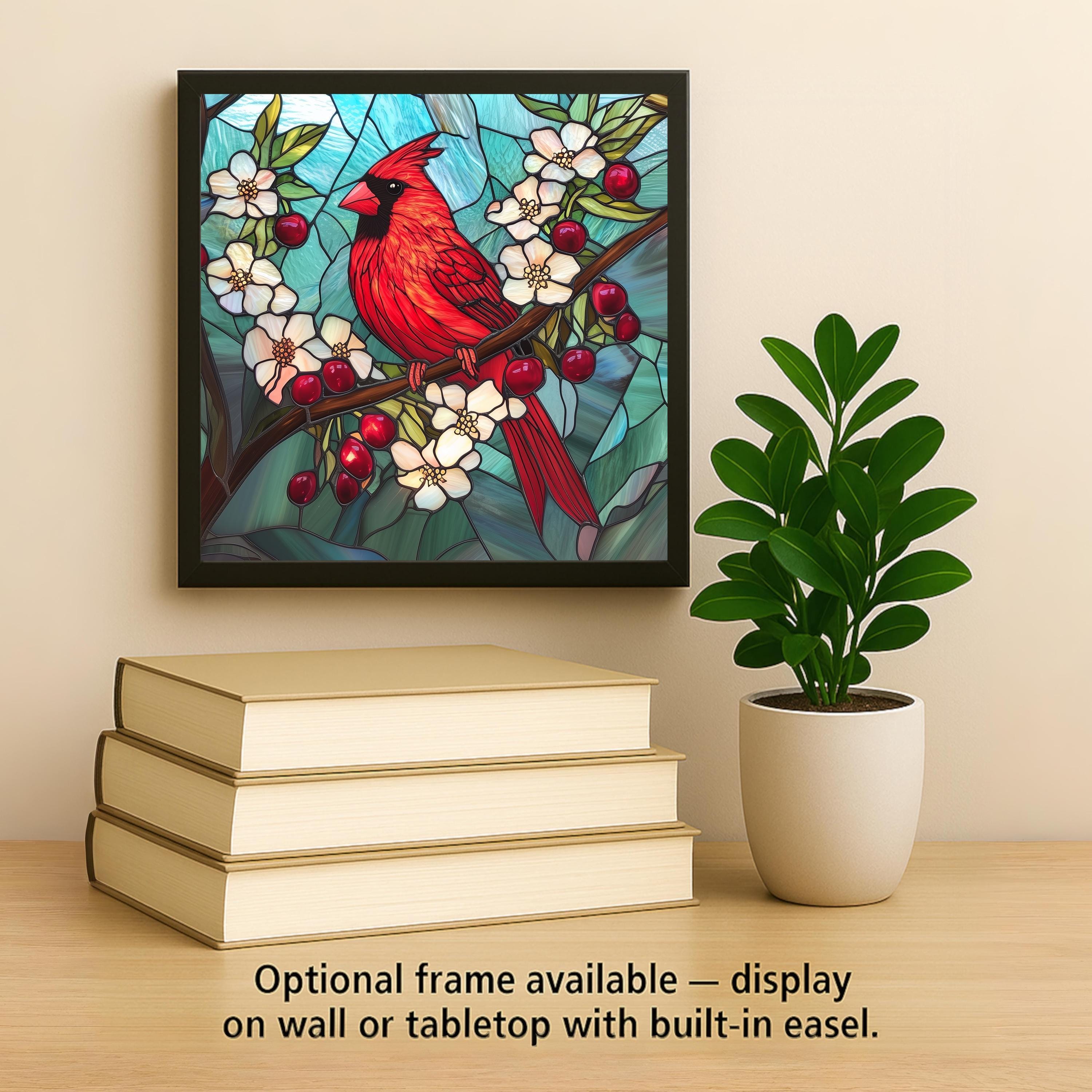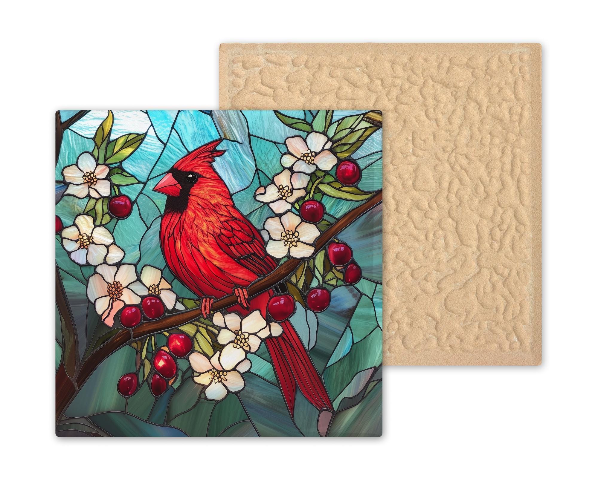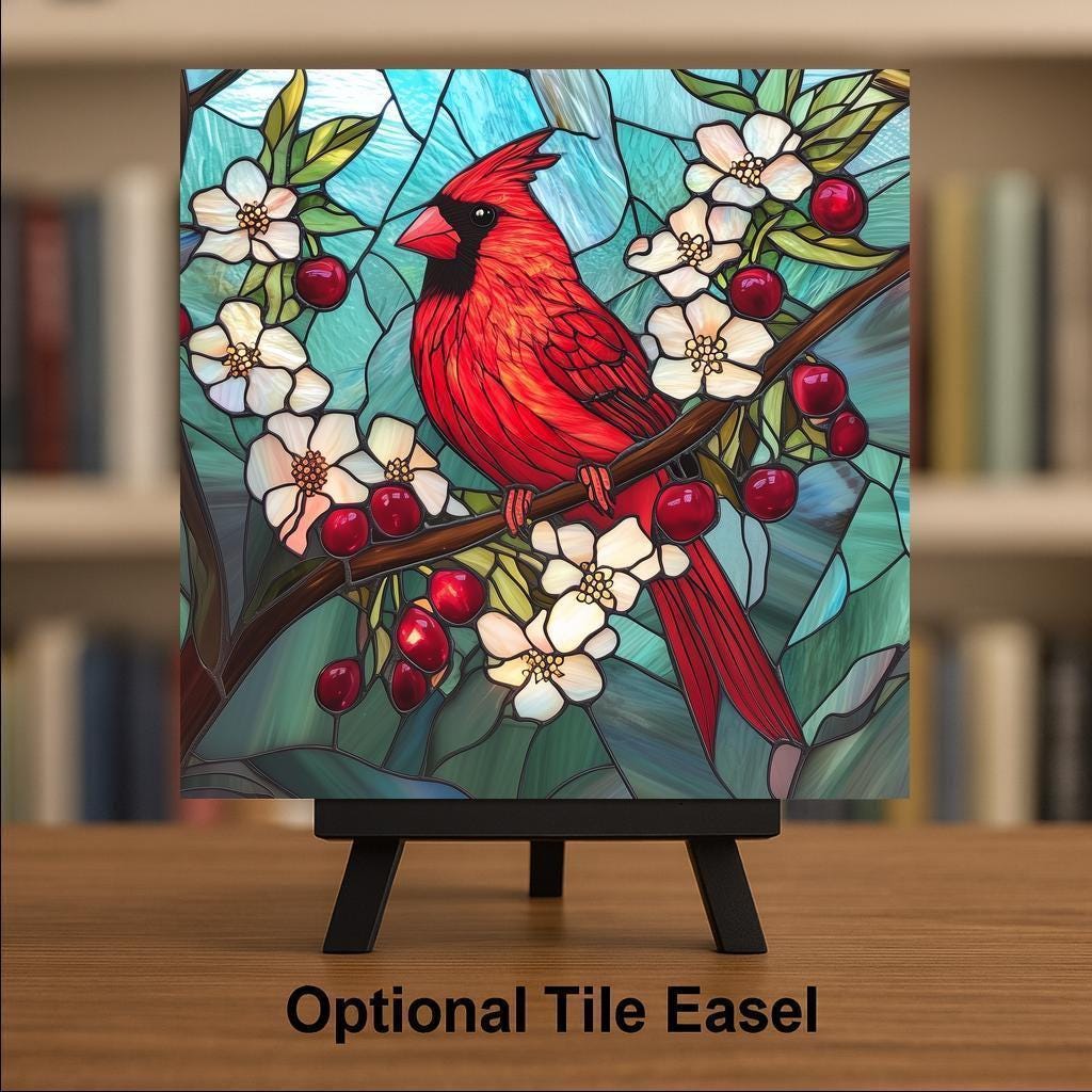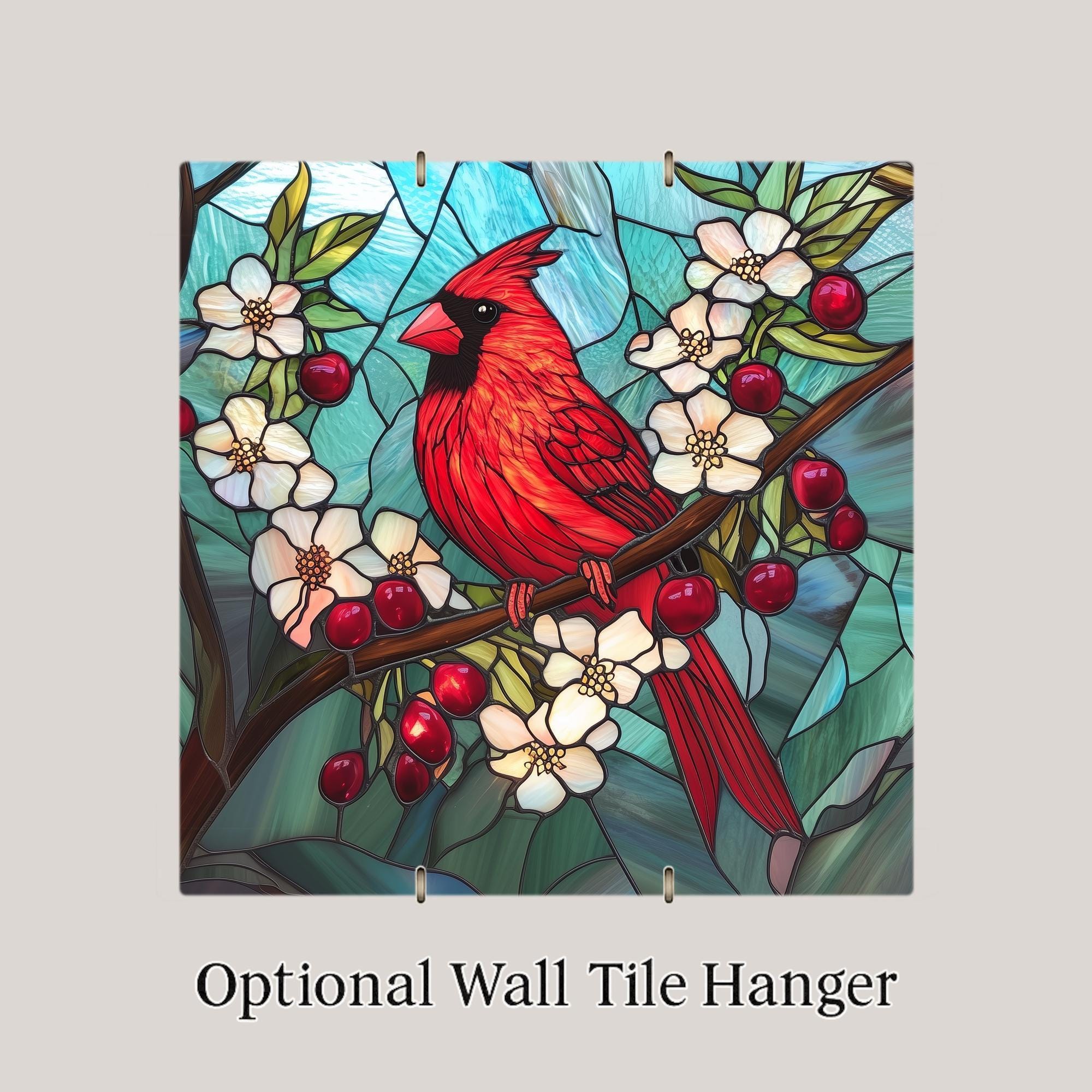 This Stained Glass Style Cardinal Ceramic Tile brings warmth, remembrance, and vivid color to your space. A brilliant red cardinal rests among white dogwood blooms and berries, symbolizing hope and spiritual connection. With a stained glass look that glows with rich jewel tones, this tile offers a heartfelt addition to memorial displays, holiday decor, or nature-themed walls.