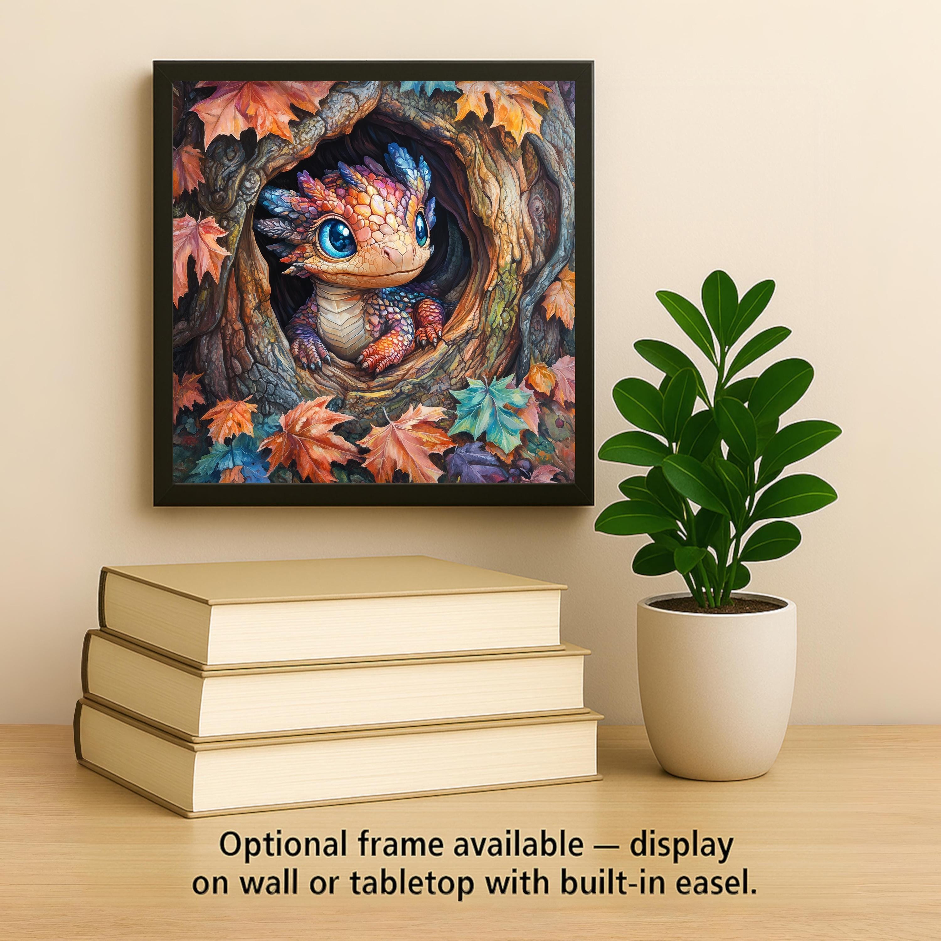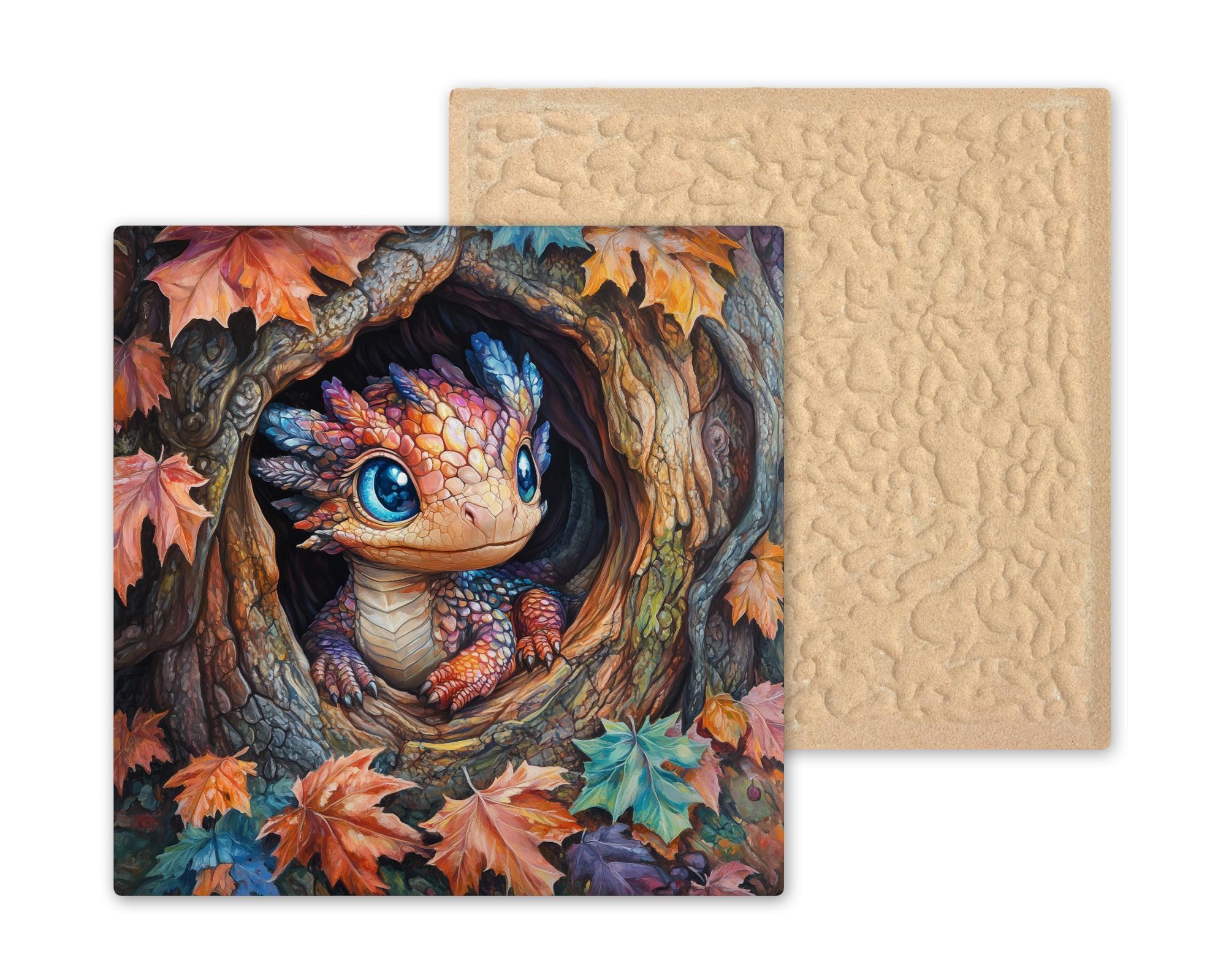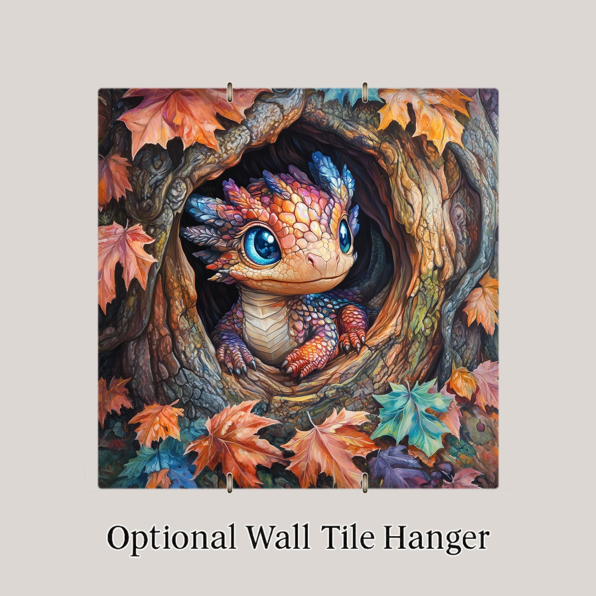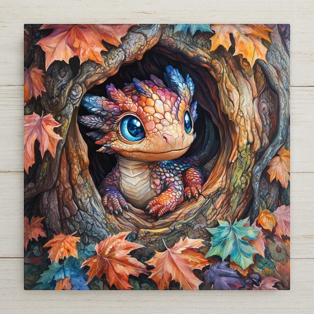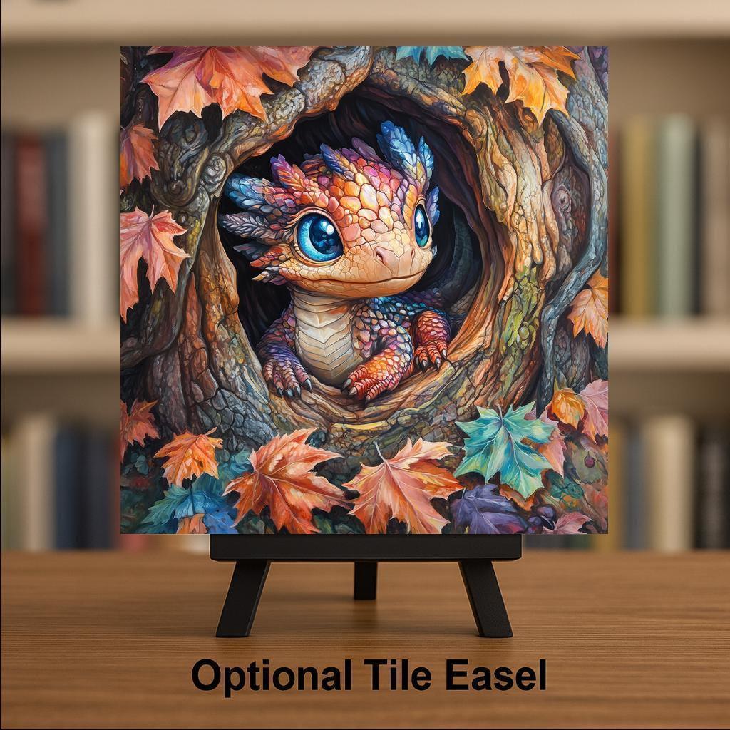This Autumn Baby Dragon Tile Art is perfect for anyone who loves whimsical wall art, fantasy creatures, and warm seasonal home decor. The artwork showcases a tiny dragon peeking out of a hollow tree, framed with richly colored fall leaves and textured bark. The dragon’s big blue eyes and jewel-tone scales give the piece a playful personality that appeals to children, adults, and fantasy fans alike. The gentle painterly strokes and soft highlights create a comforting, storybook feel that makes the tile ideal for living rooms, bedrooms, nurseries, offices, and cozy autumn displays.