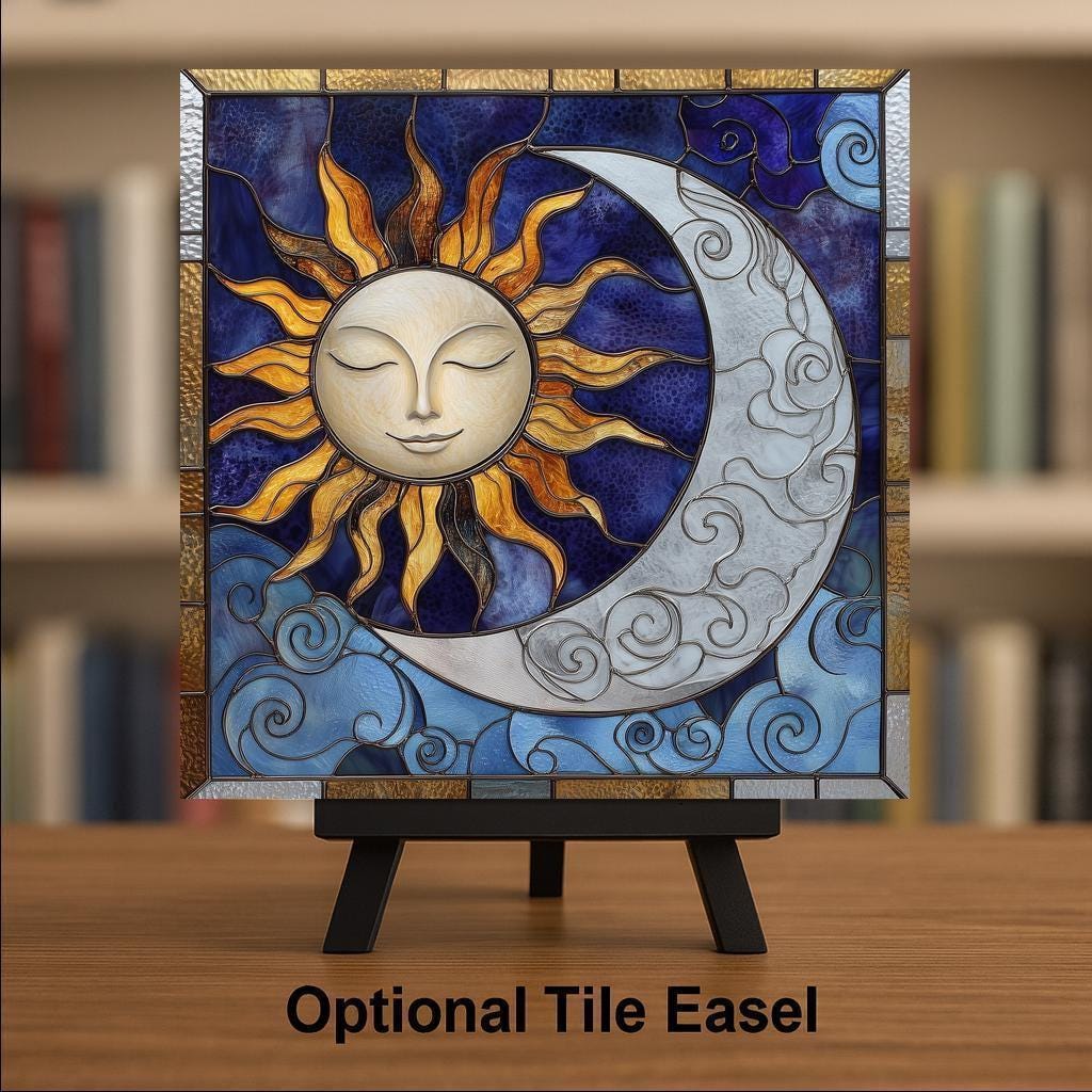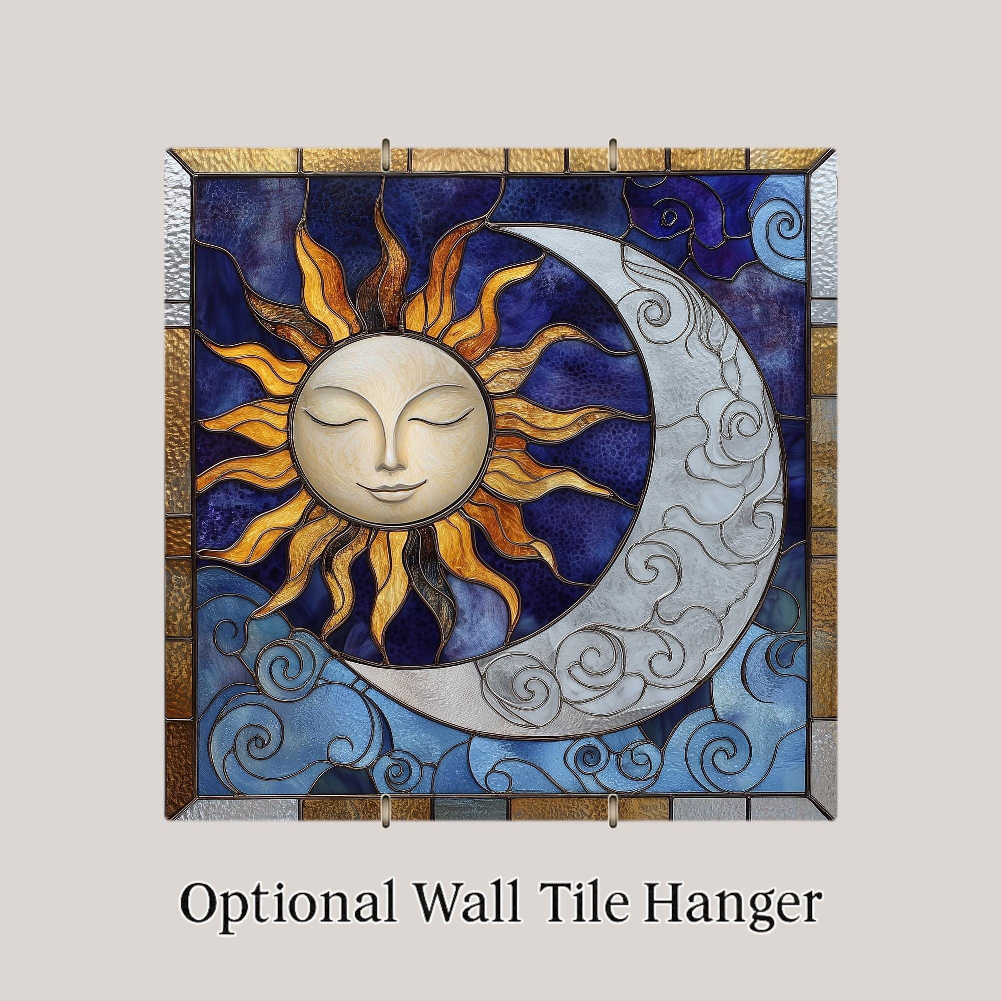 This Celestial Sun and Moon Ceramic Tile brings a touch of cosmic wonder to your home. Featuring a radiant sun with gentle facial features and a swirling crescent moon, this artwork is designed in a luminous stained glass style full of rich blues, golds, and silvers. It’s a captivating piece that reflects both harmony and contrast—ideal for anyone who appreciates astrology, spirituality, or celestial décor.