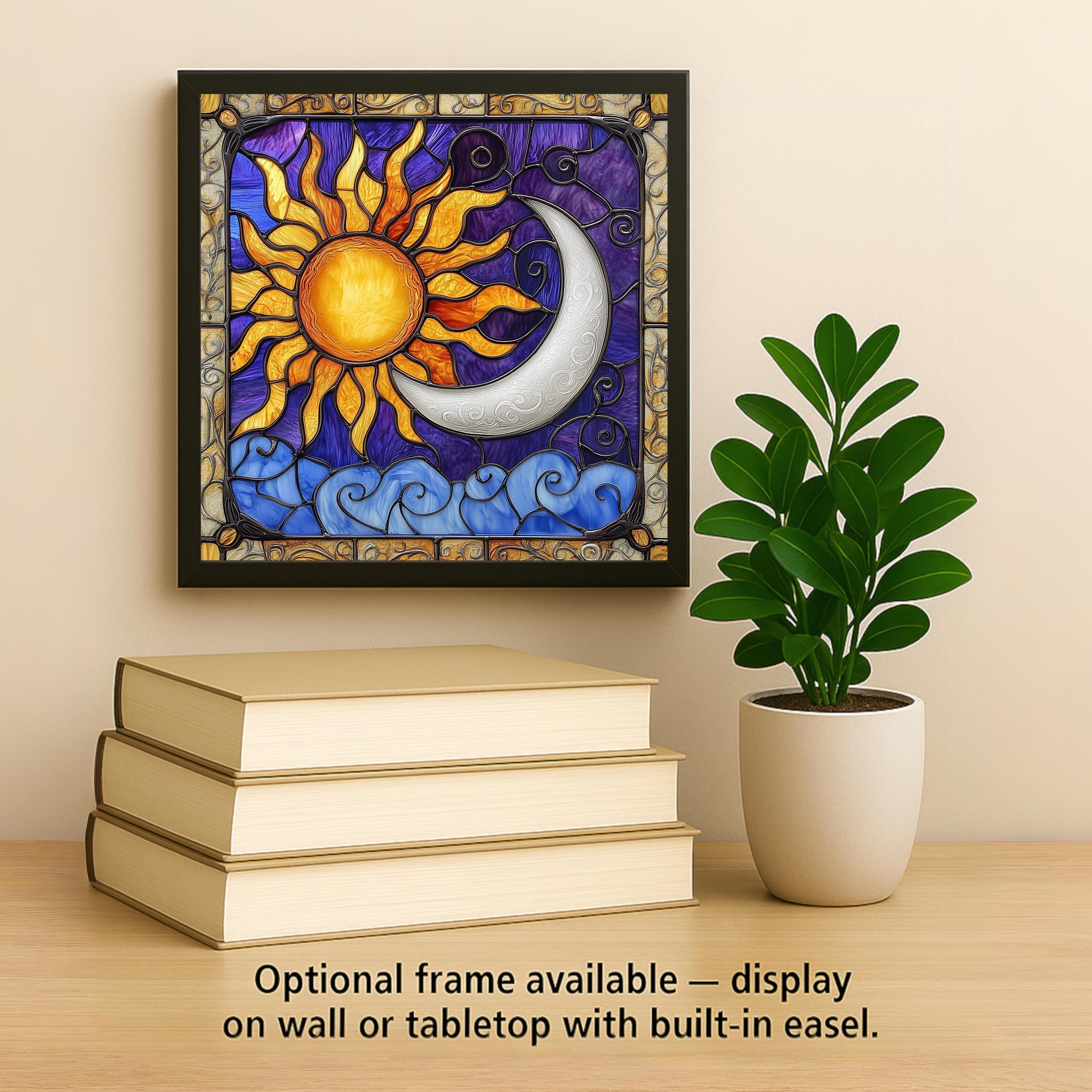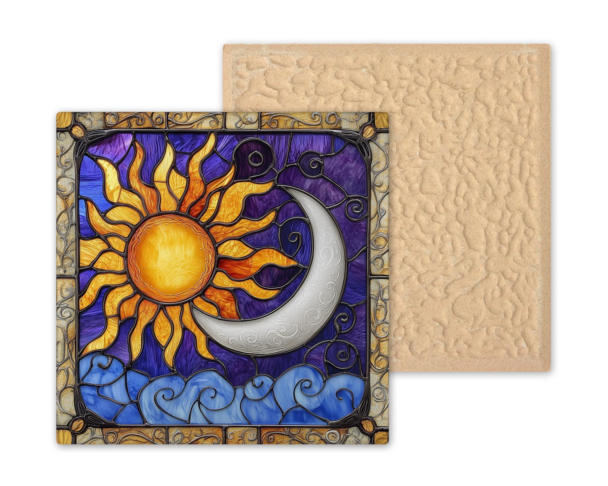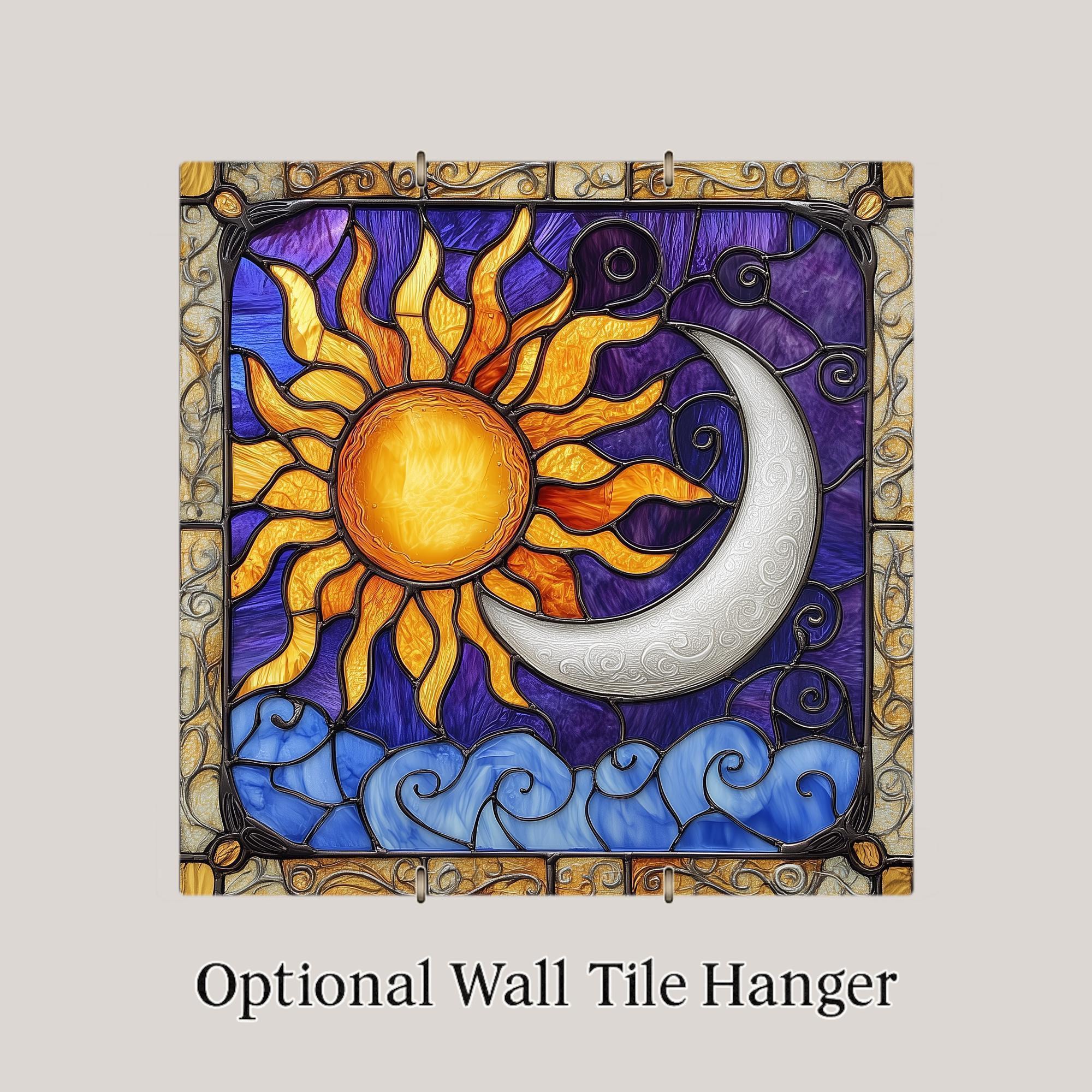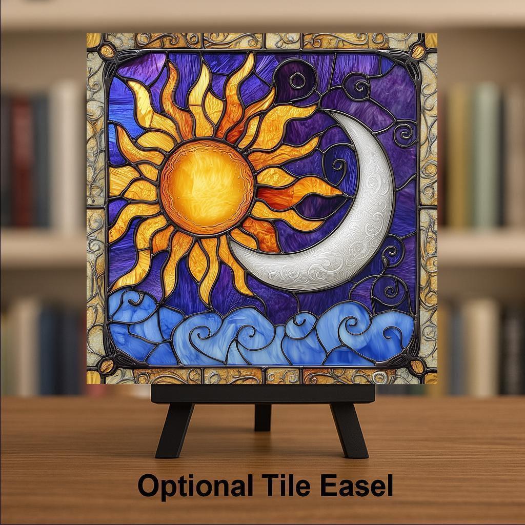 Celebrate cosmic balance with this stunning handcrafted ceramic tile featuring a luminous sun and gentle moon set in a stained glass-style frame. Designed in rich purples, golden yellows, and cool blues, this vibrant wall art evokes the eternal dance of night and day, spirit and earth, fire and water.