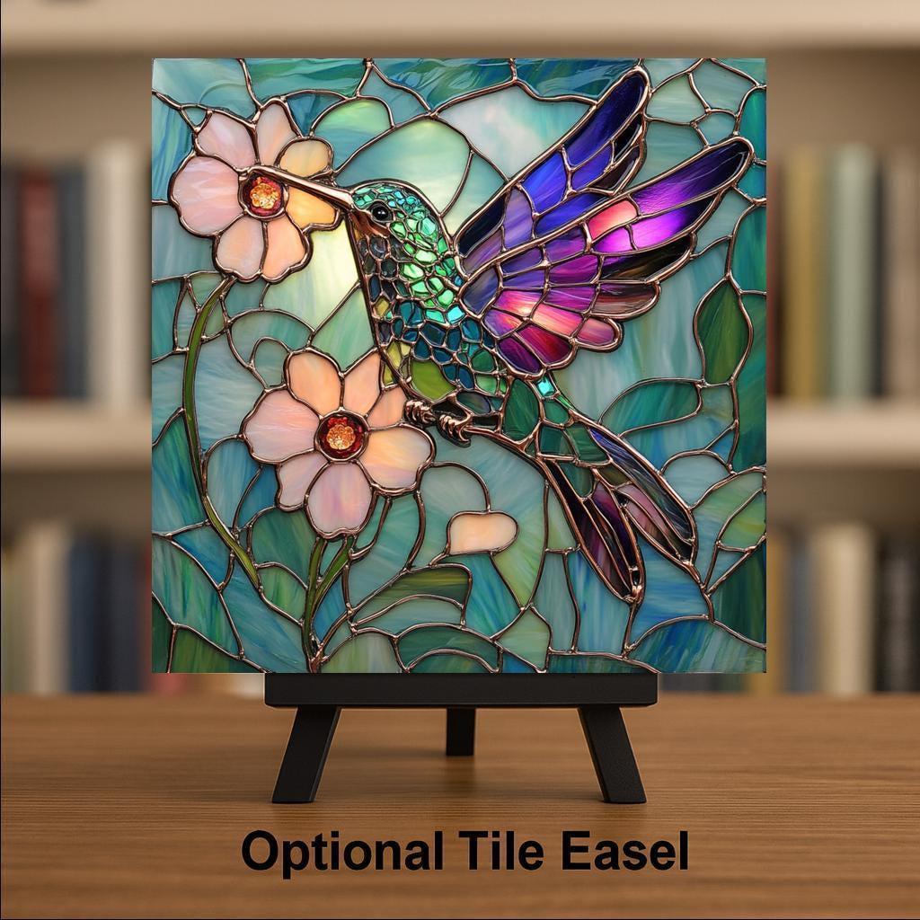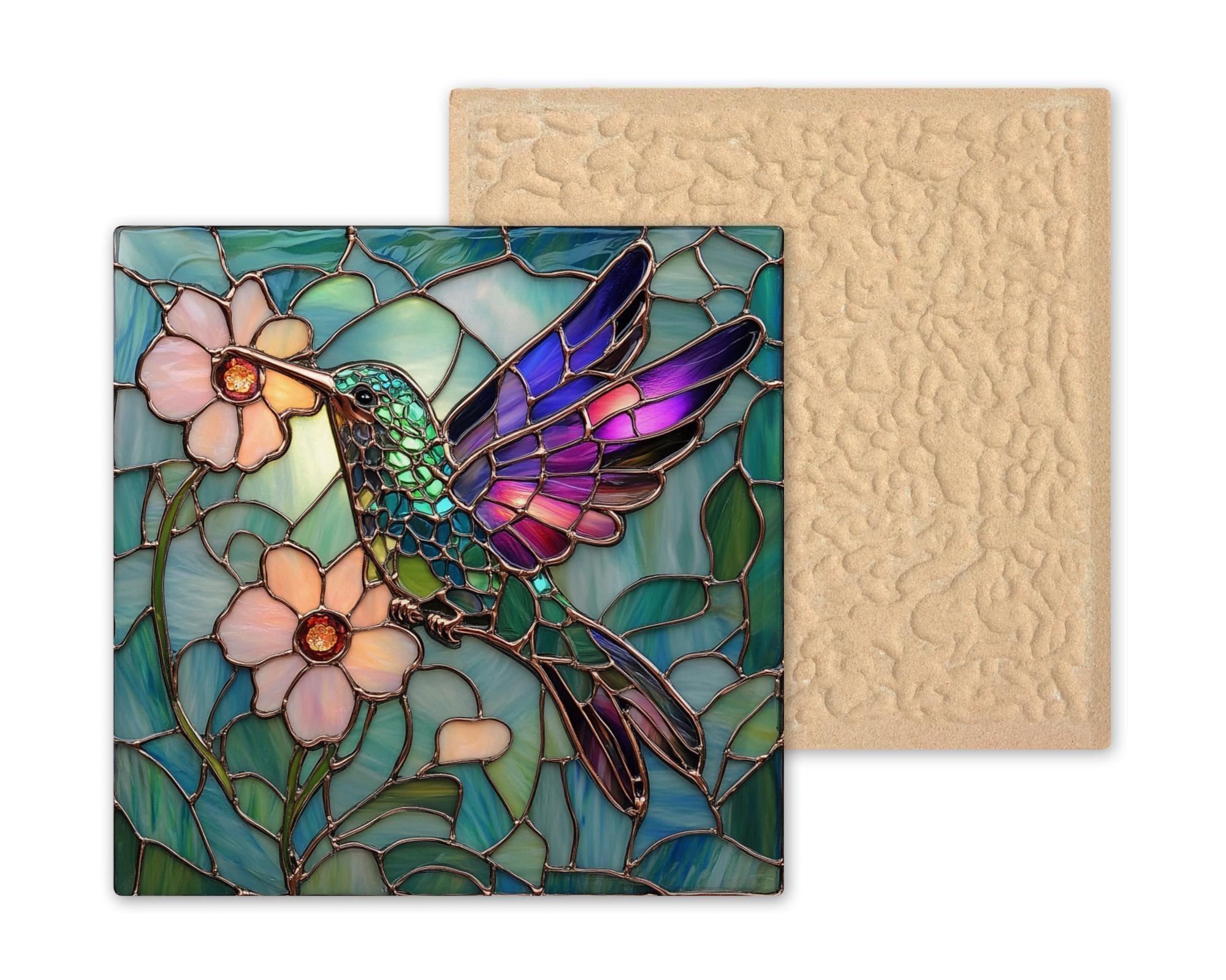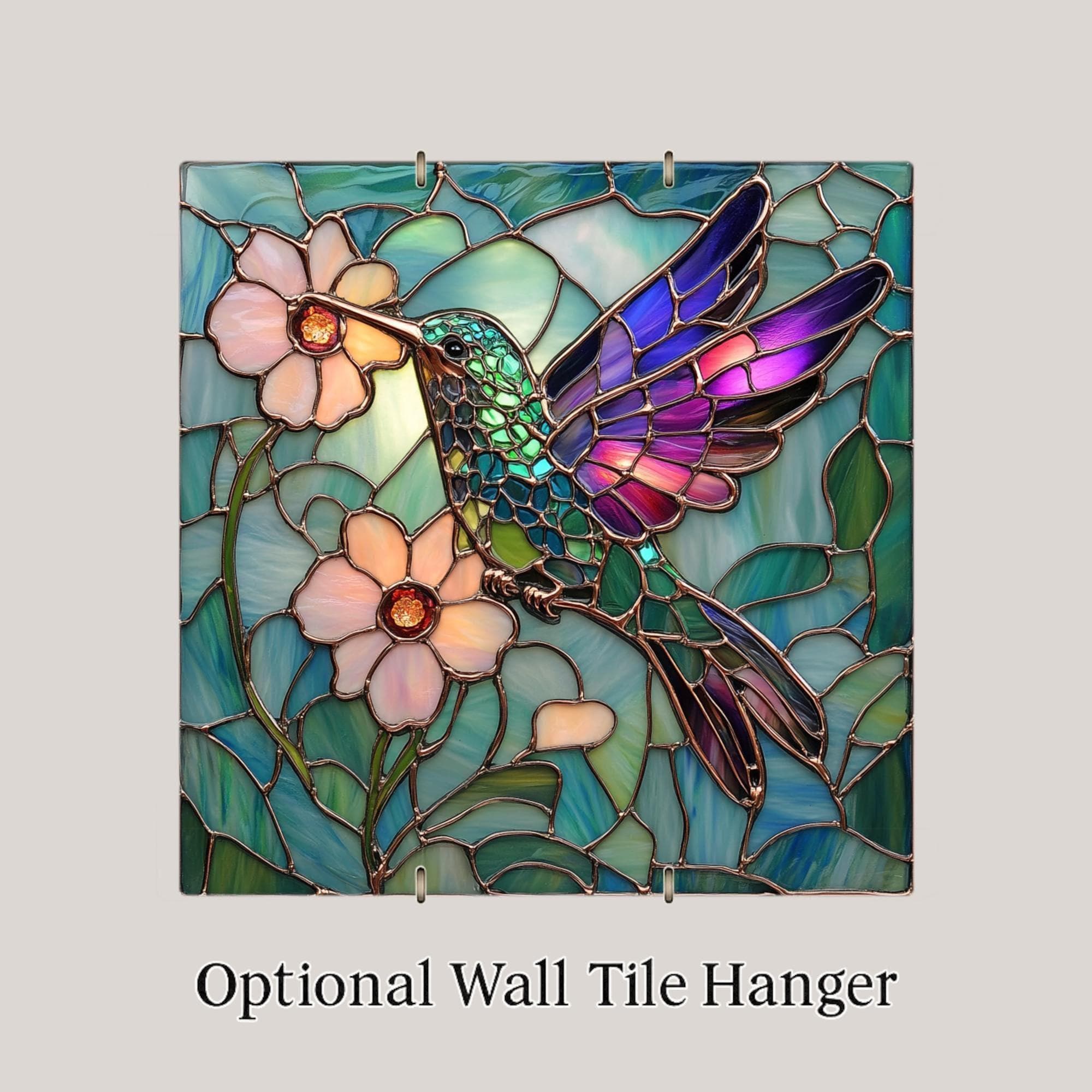 This stained glass hummingbird ceramic tile captures the beauty of nature in luminous detail. A vibrant hummingbird hovers midair, delicately feeding from blooming pastel flowers against a leafy green backdrop. The design’s shimmering glass-like texture and bold outlines give the piece a radiant, window-lit effect, making it a standout in any room.