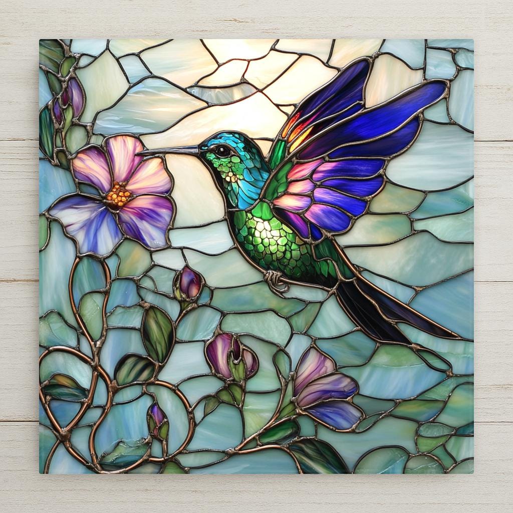 This handmade ceramic tile captures the magic of a hummingbird mid-flight in a stained glass-style design. With rich greens, violets, and soft glass-like textures, the hummingbird flutters beside blooming purple flowers in a scene inspired by garden serenity. This unique wall art adds color and movement to any home, patio, or greenhouse space.