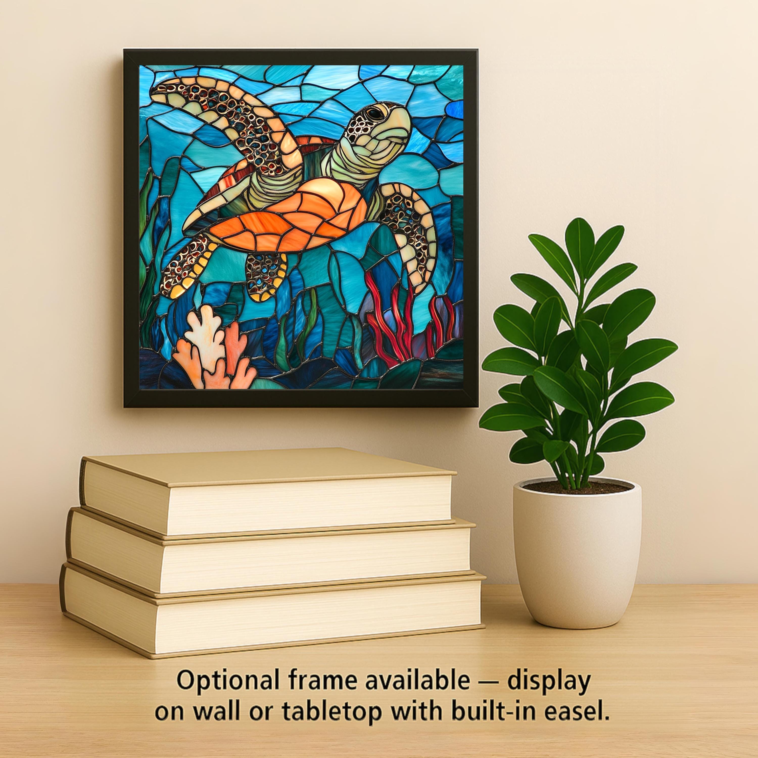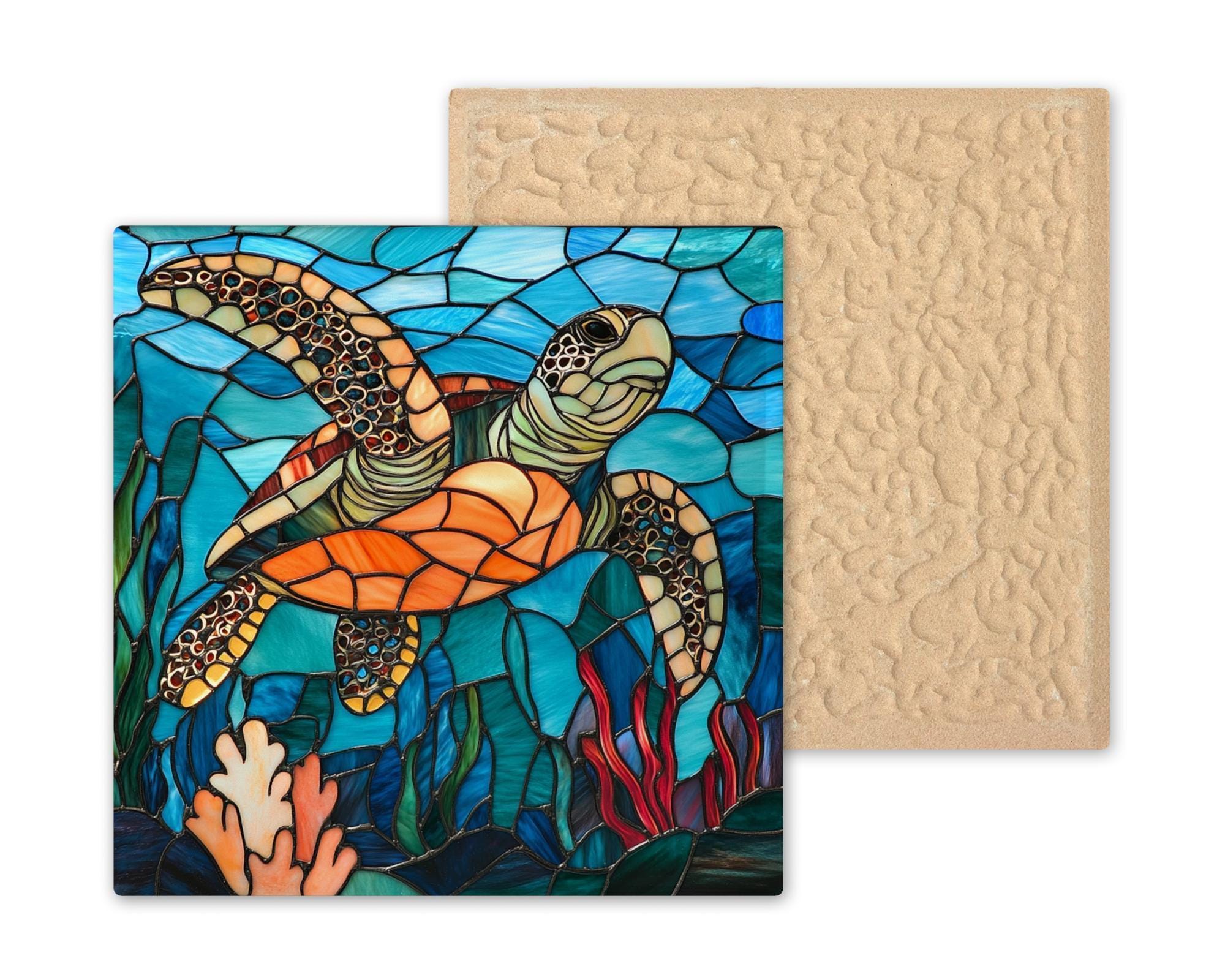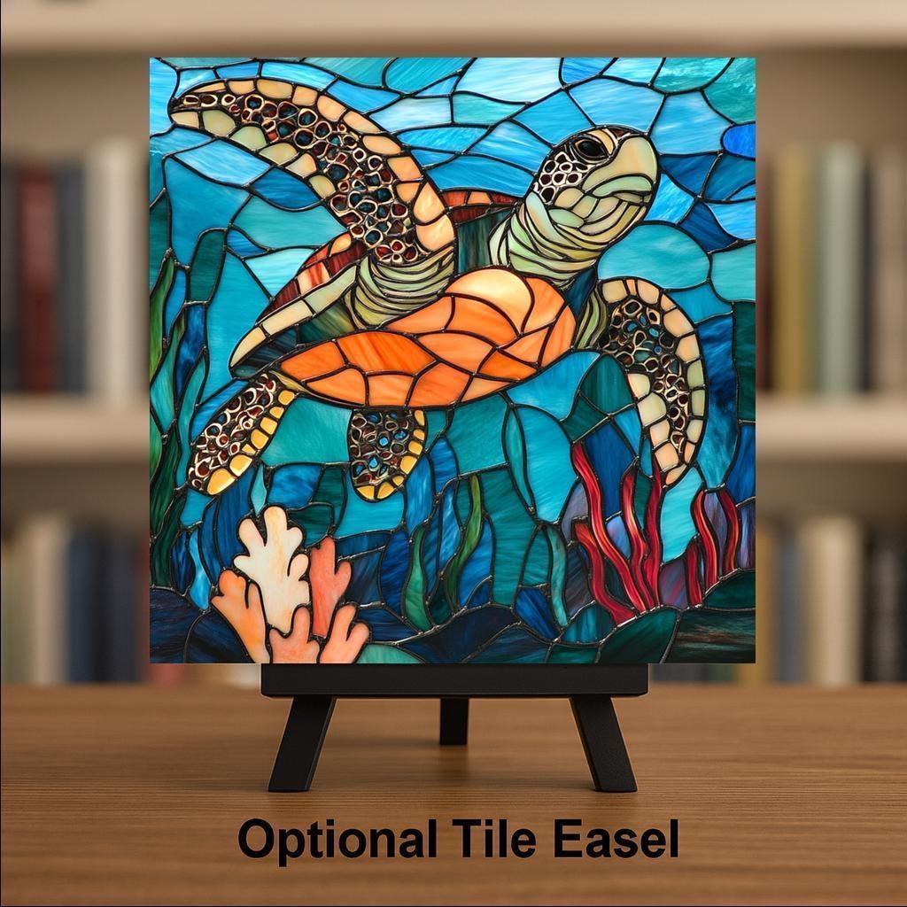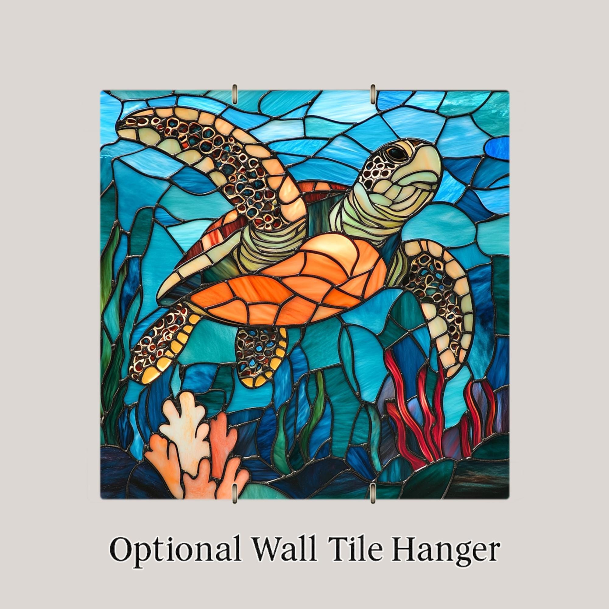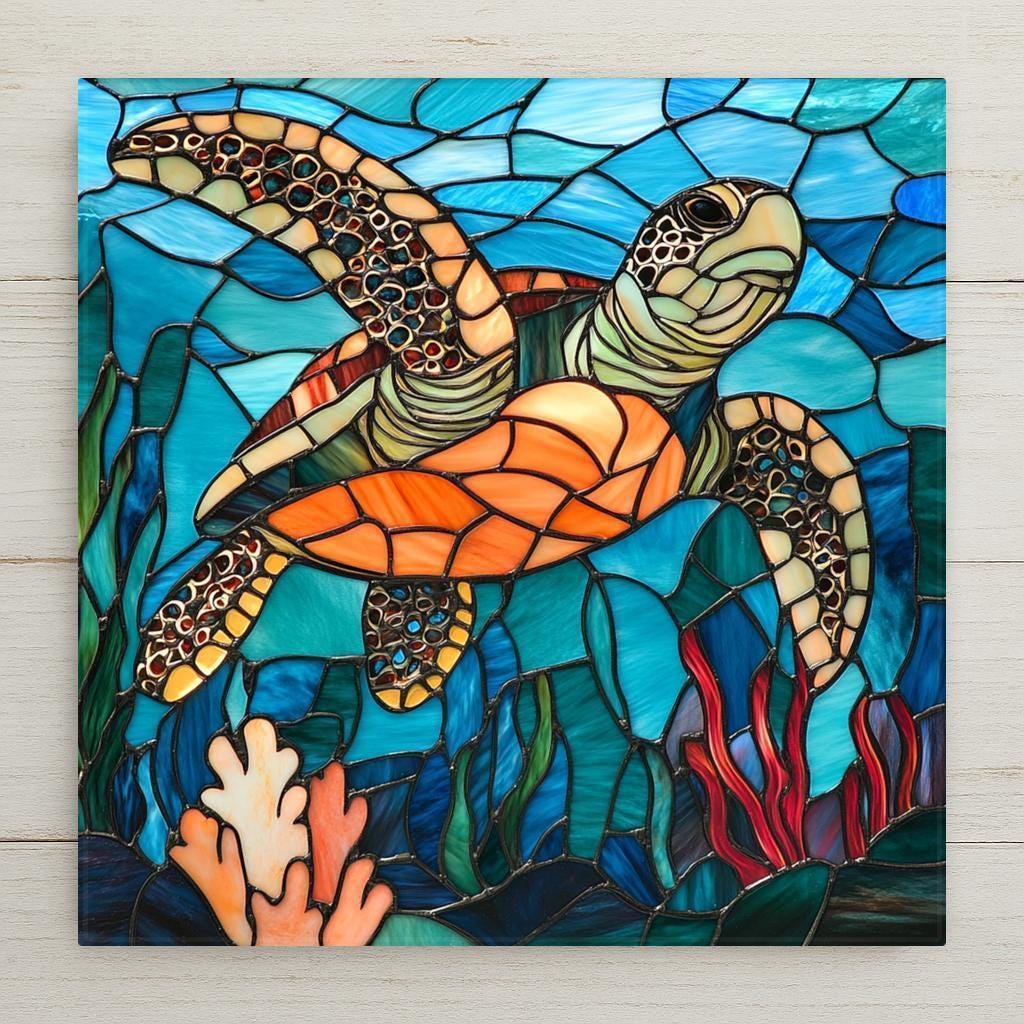 This sea turtle ceramic tile wall art captures the vibrant beauty of ocean life in a stained glass style. Featuring a colorful turtle swimming through coral reefs and waving sea plants, the design glows with blues, oranges, and tropical greens. The bold outlines and shimmering detail mimic leaded glasswork, giving this tile the look of an illuminated window beneath the sea.