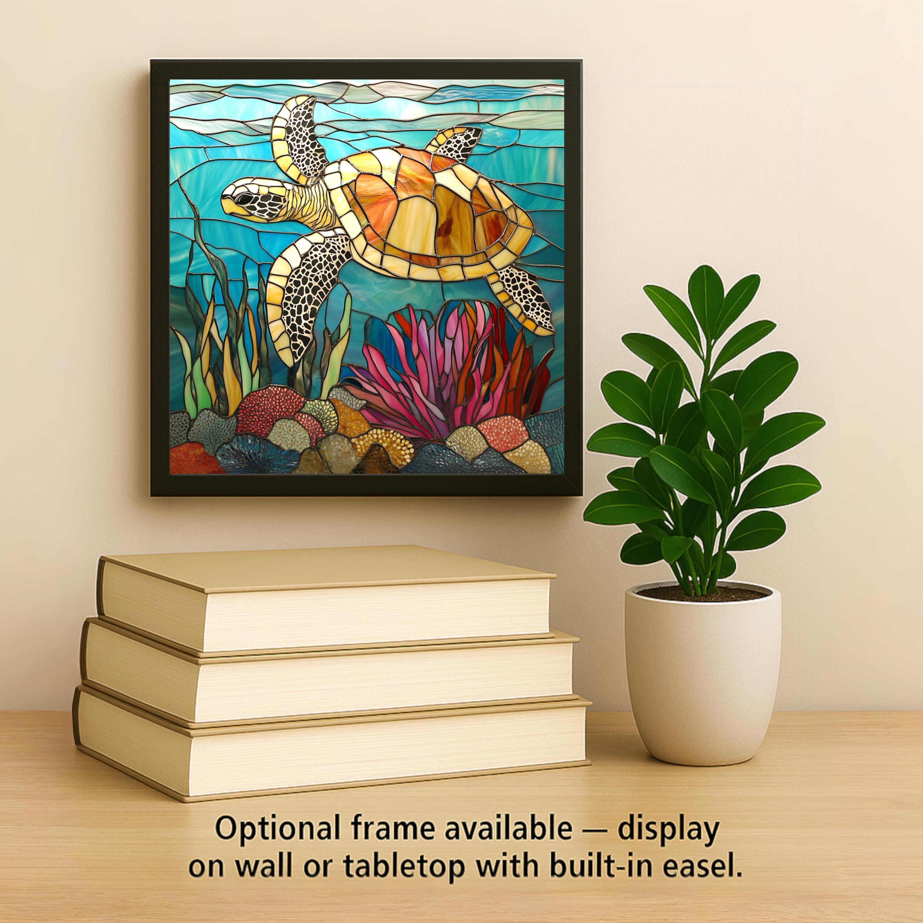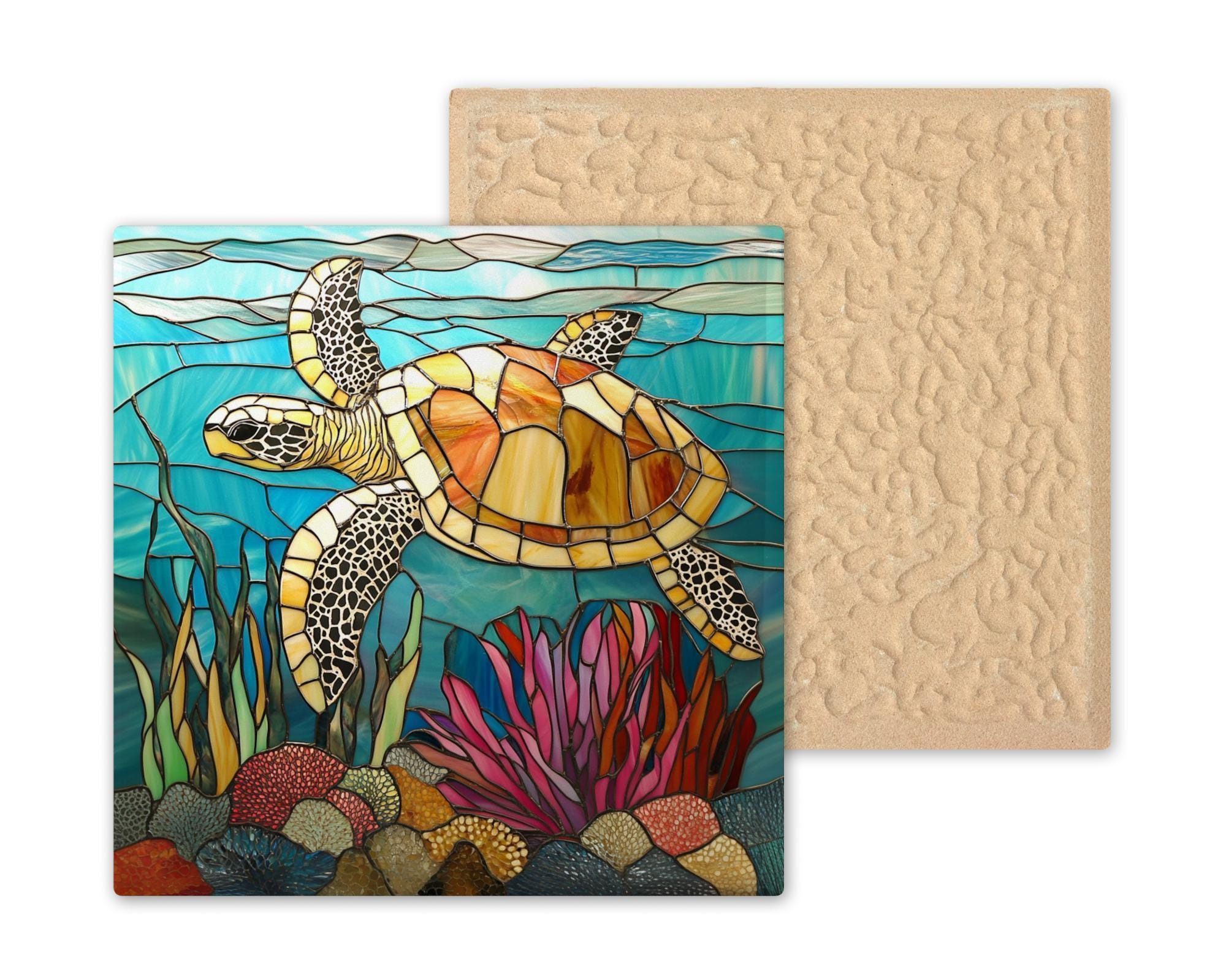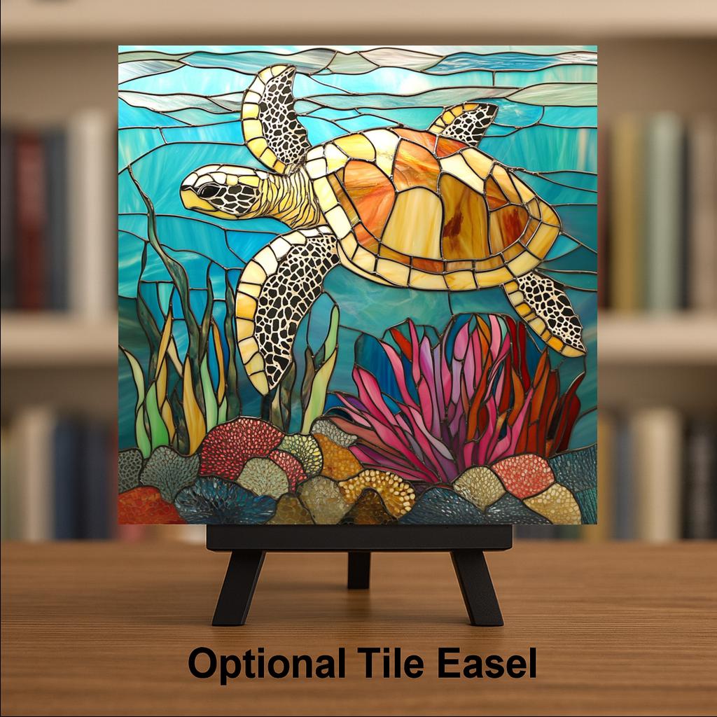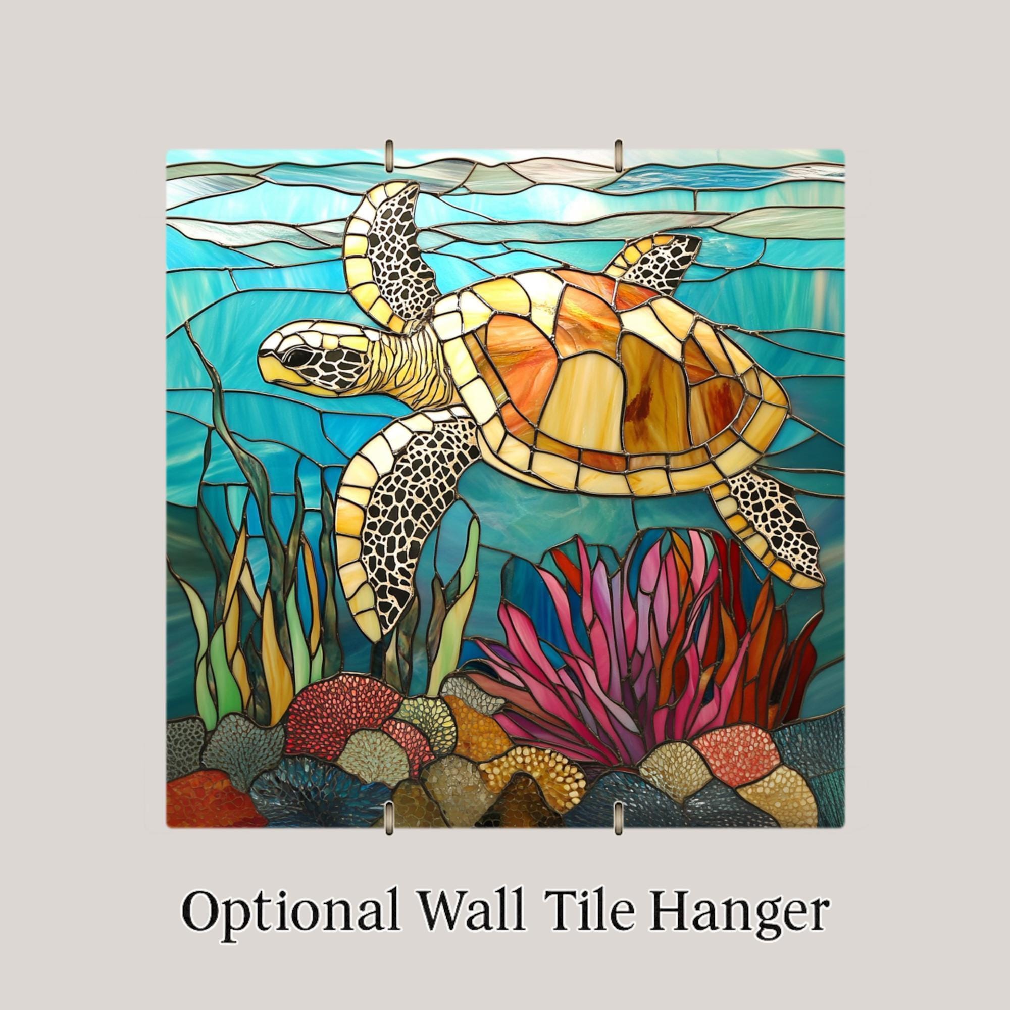 This sea turtle ceramic tile wall art immerses you in a glowing underwater world filled with flowing seaweed, brilliant corals, and tranquil ocean blues. The sea turtle, highlighted in warm amber and gold tones, glides effortlessly through the current with a sense of grace and movement. The stained glass effect and bold outlines give the piece both elegance and visual impact.