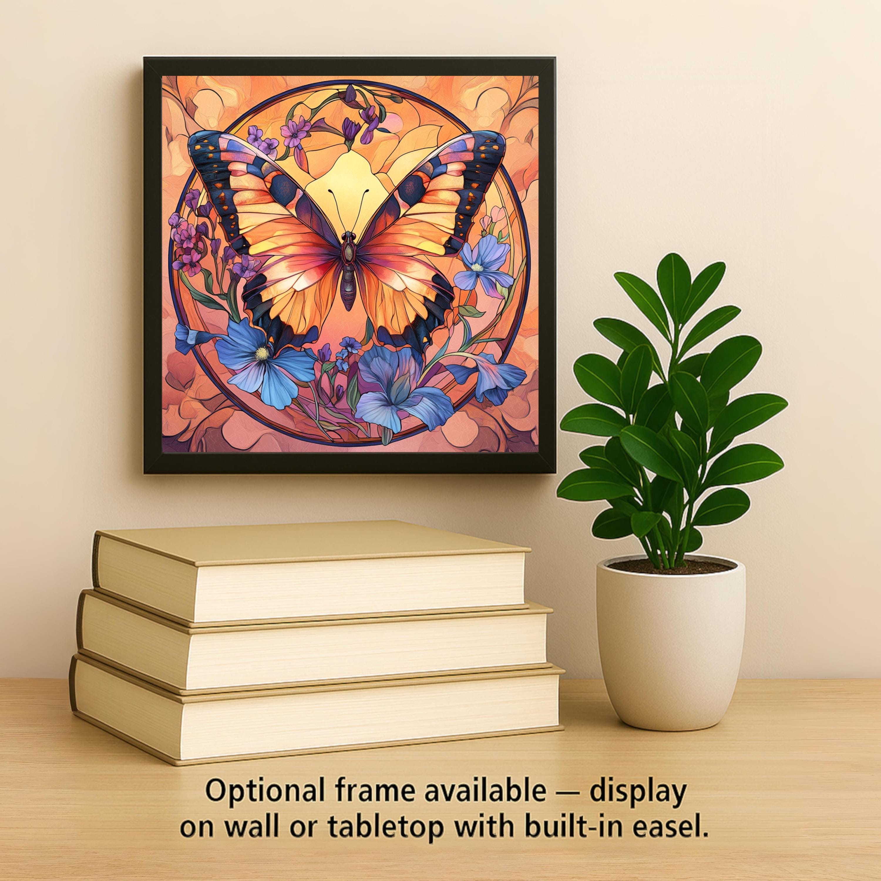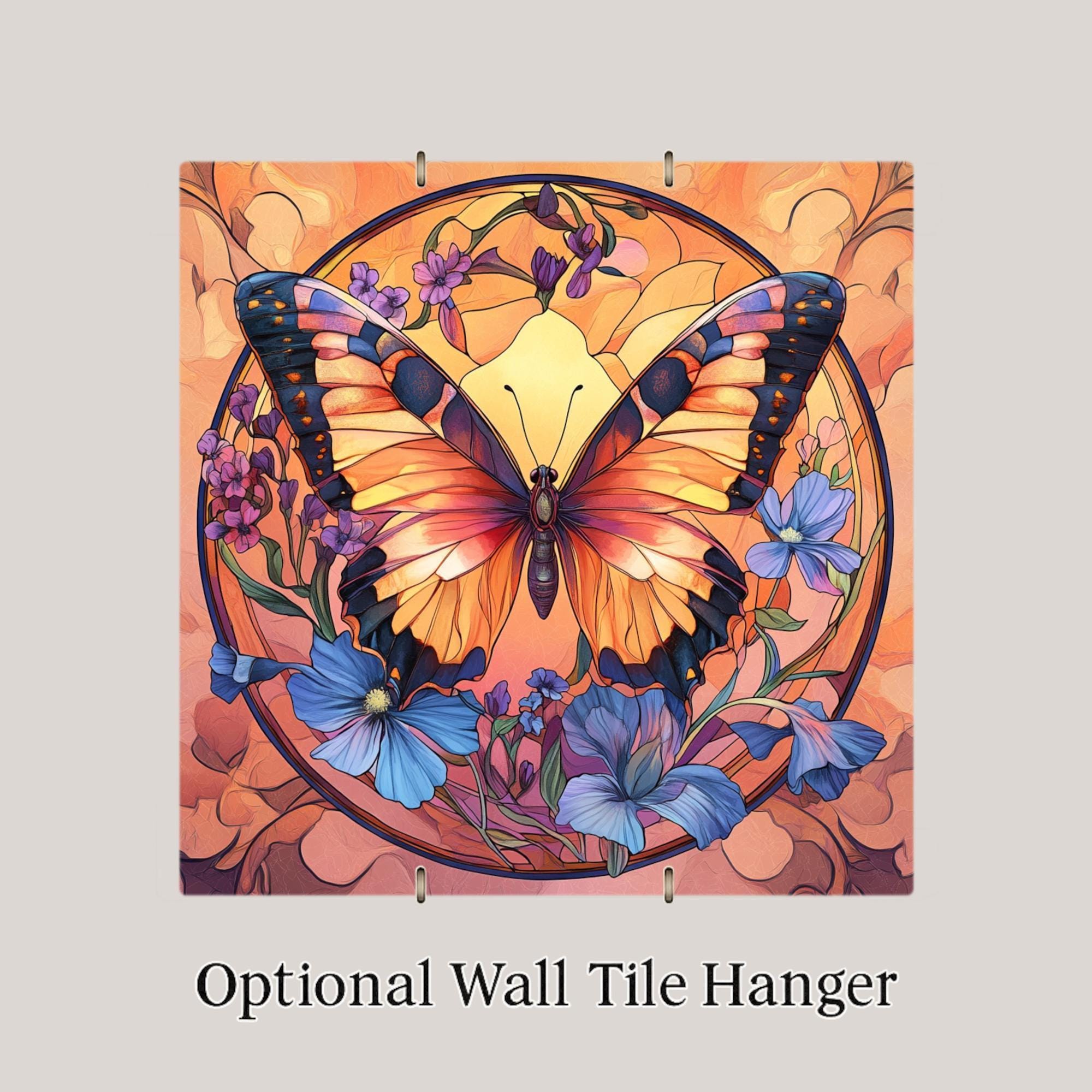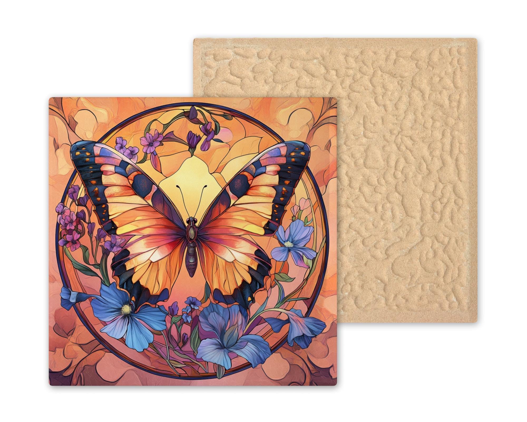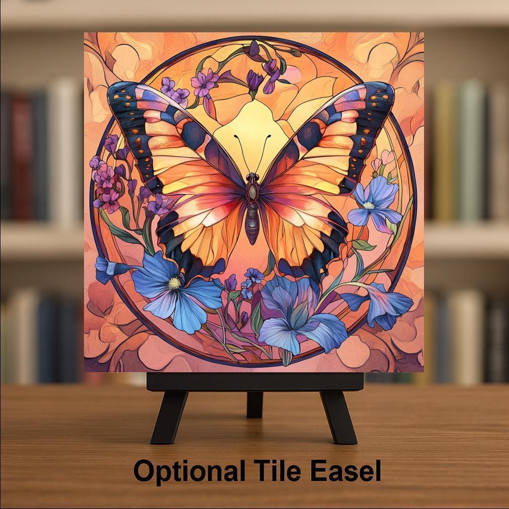 This butterfly ceramic tile features a radiant stained glass-style design in glowing orange, black, and blue tones. Set against a soft peach background, the floral and insect motifs evoke a peaceful garden scene perfect for uplifting your space. Although it may resemble stained glass, this is not actual glass—the artwork is a durable, permanent print on ceramic tile, designed for lasting beauty and easy care. A perfect gift for nature lovers or collectors of butterfly décor, it works beautifully in a garden room, craft nook, bathroom, or entryway. The elegant design and vivid colors also make it a unique memorial piece or sympathy gift. Choose optional cork backing for countertop use, a tile wall hanger for easy mounting, or an easel tile stand for shelf or desk display. It’s a graceful tribute to growth, change, and the natural world.