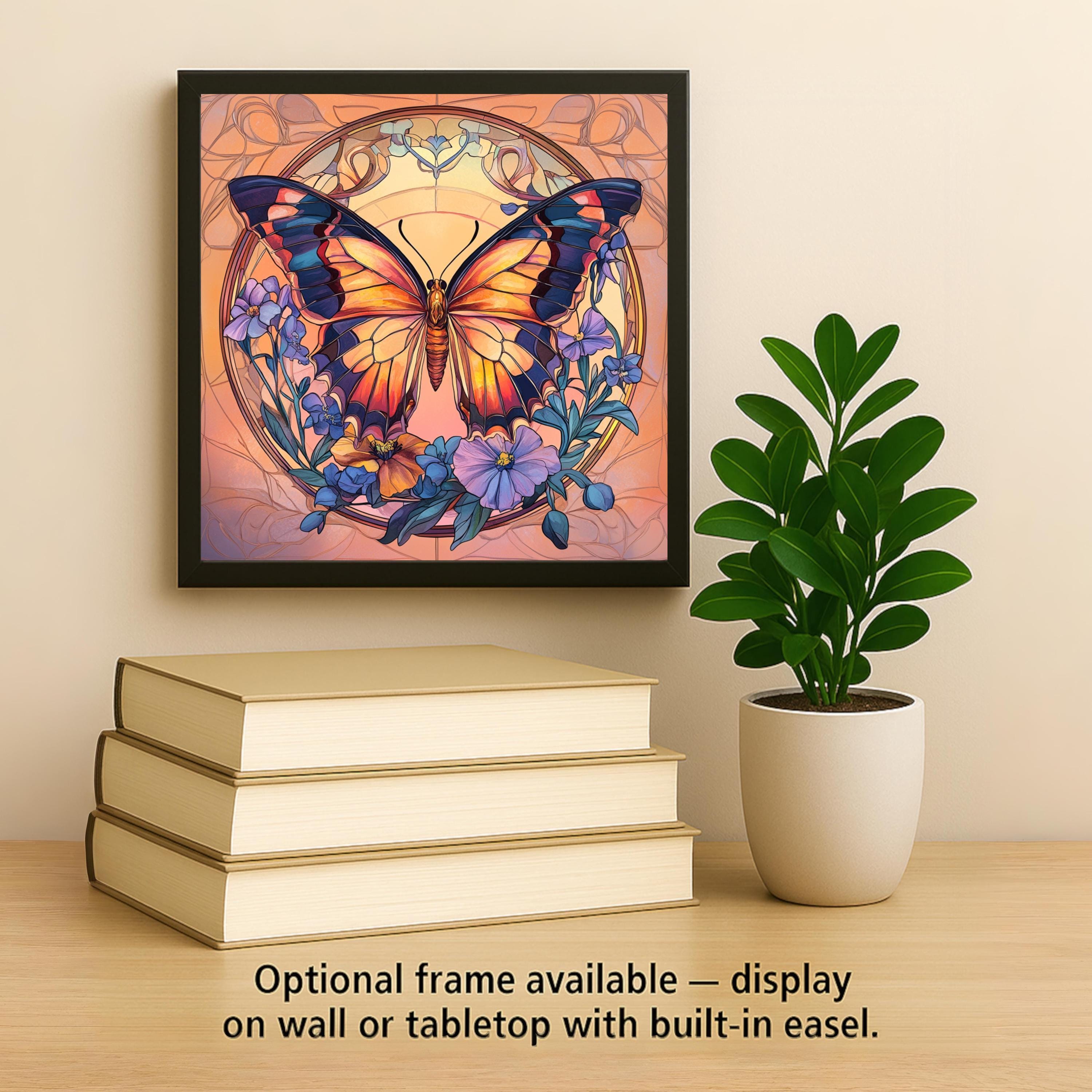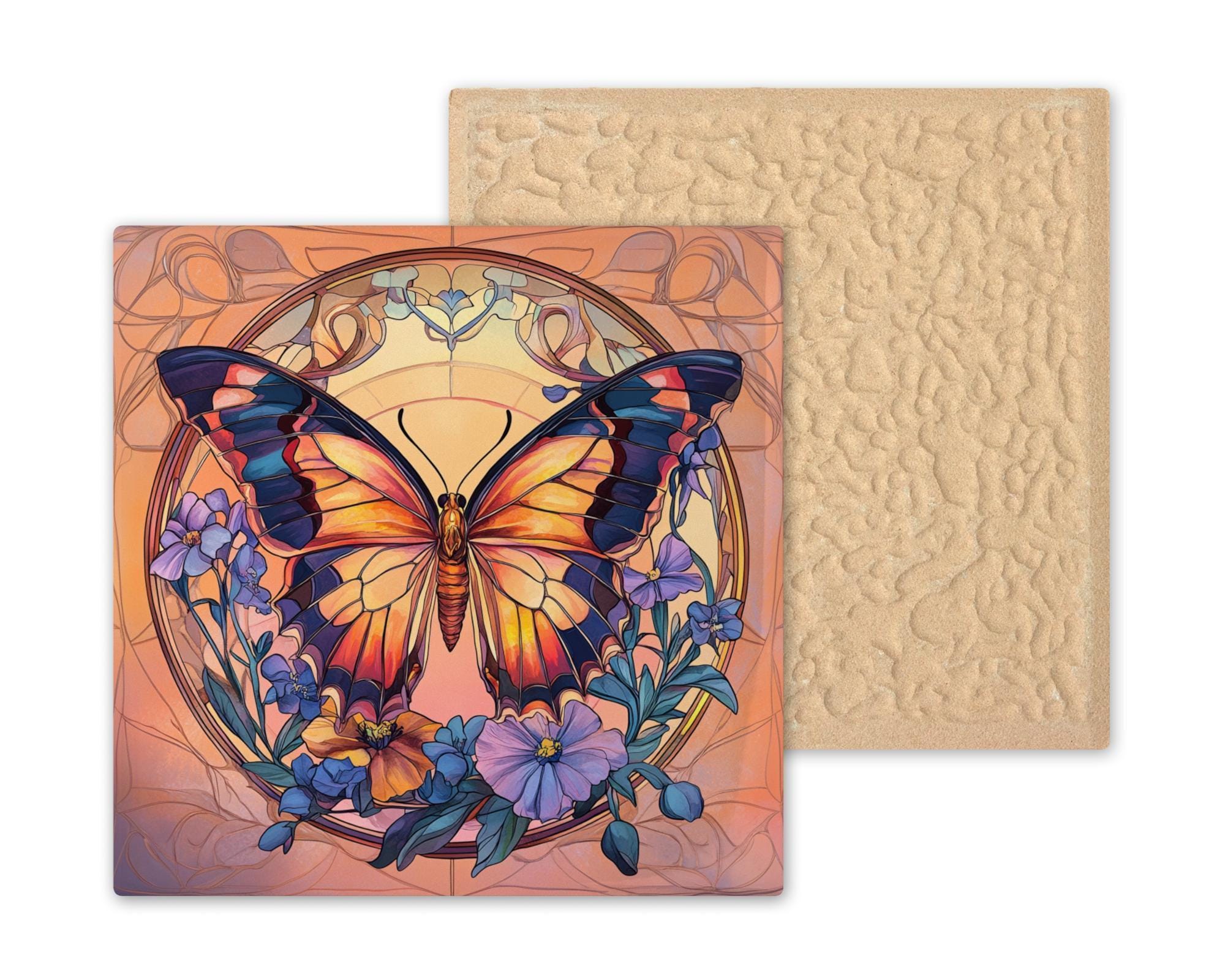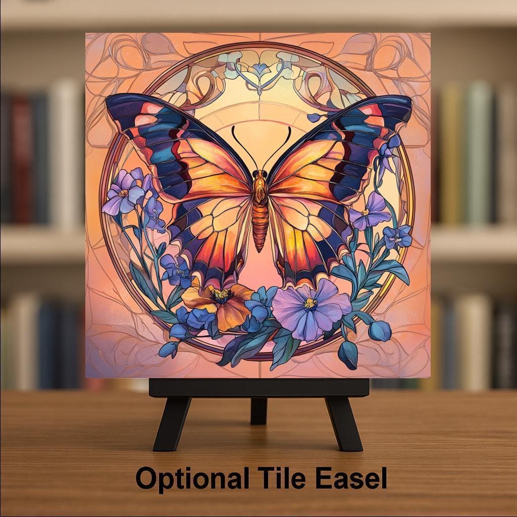 Bring the peaceful charm of spring indoors with this stunning stained glass-style butterfly ceramic tile. Featuring glowing golden wings edged in rich navy and framed by blooming pastel flowers, this design captures the spirit of rebirth and beauty.