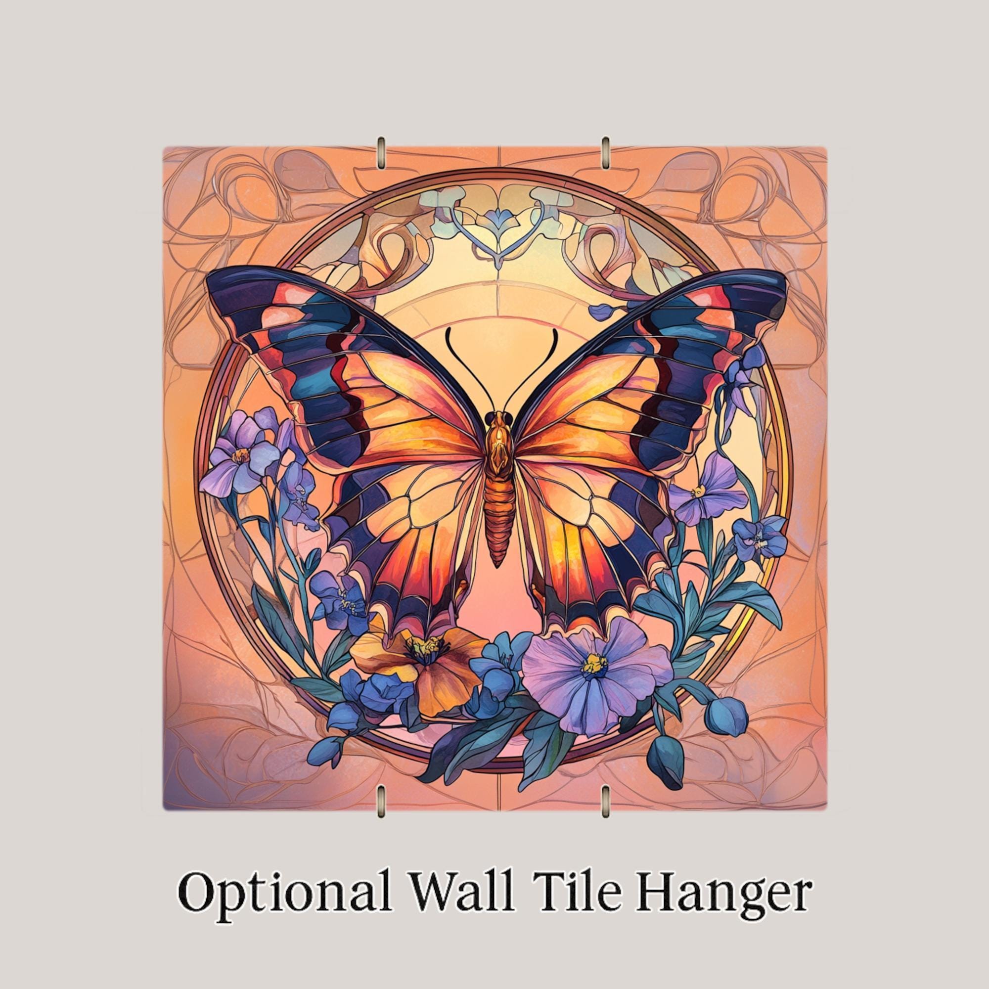 The graceful butterfly is printed with intricate linework and vibrant color, giving the look of real stained glass in a durable ceramic format. Hang it on your wall using a tile wall hanger, place it upright on a tile stand, or lay it flat as a unique kitchen trivet. This versatile piece is ideal for living rooms, bedrooms, entryways, or creative studio spaces.