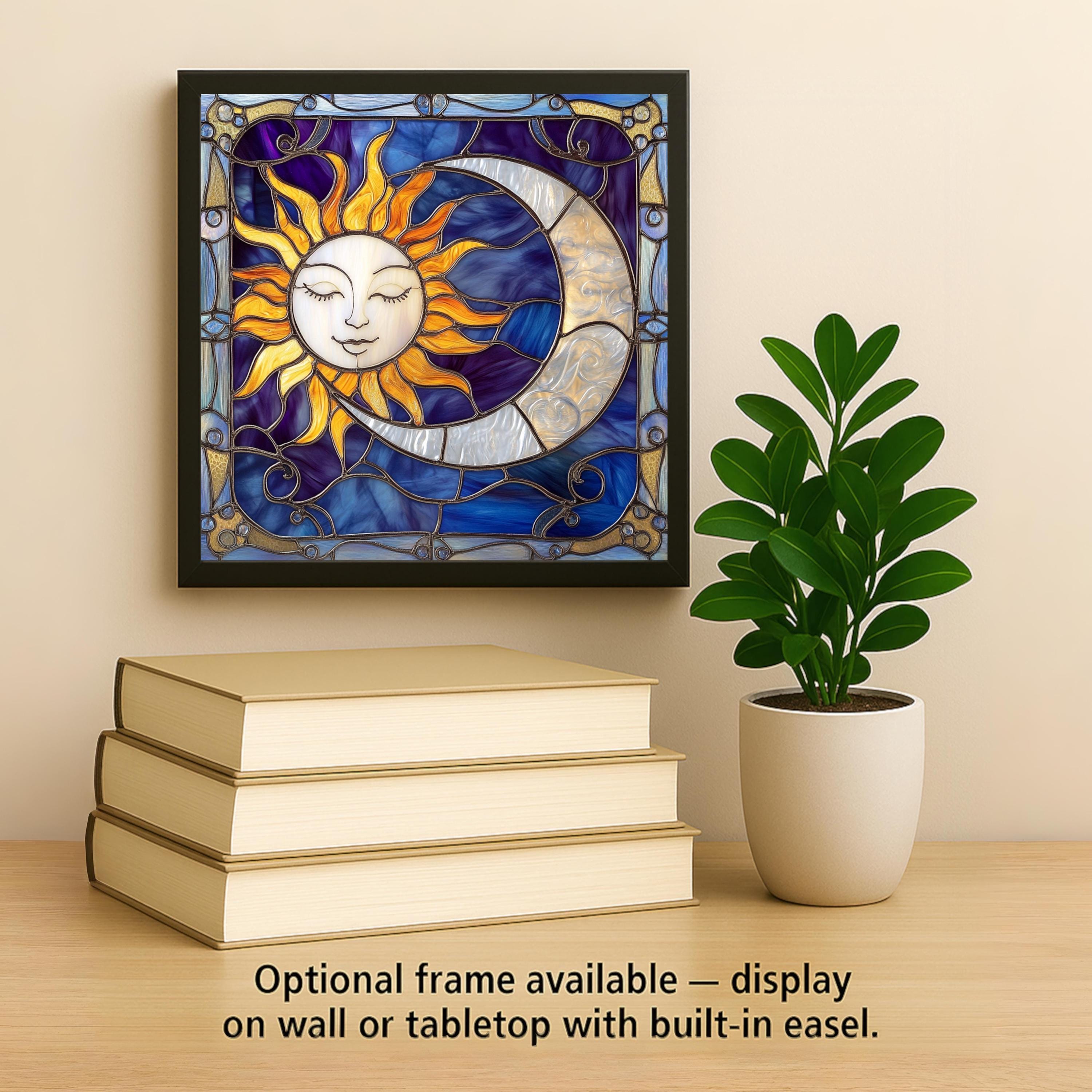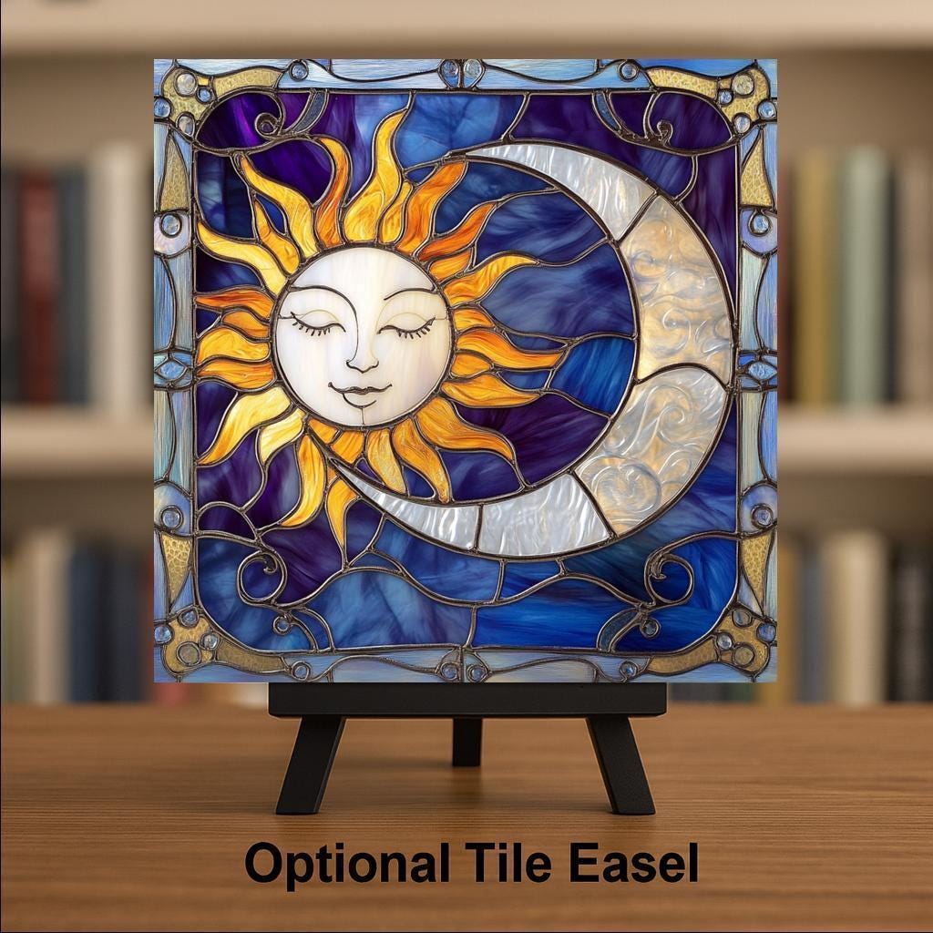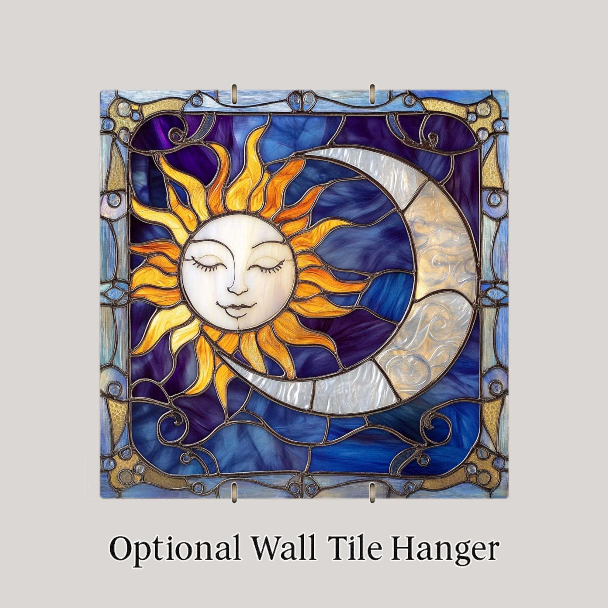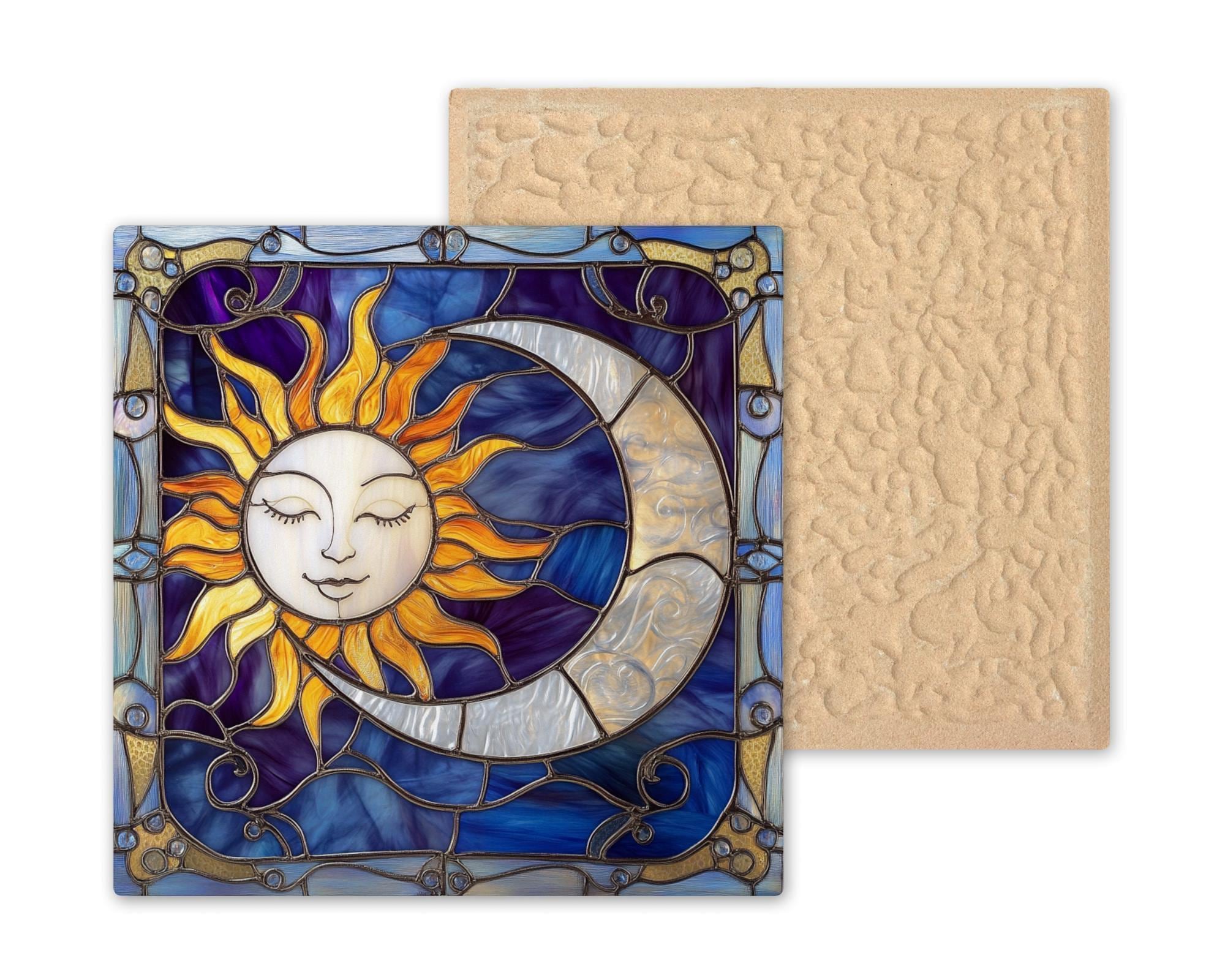 This celestial sun and moon tile brings light and calm to your home. The sun’s gentle expression and golden rays meet a pearlescent crescent moon in an elegant dance of light and shadow, symbolizing balance, wholeness, and natural rhythm. Set in a rich blue stained glass background with ornate silver and gold framing, this piece is both spiritual and stylish.