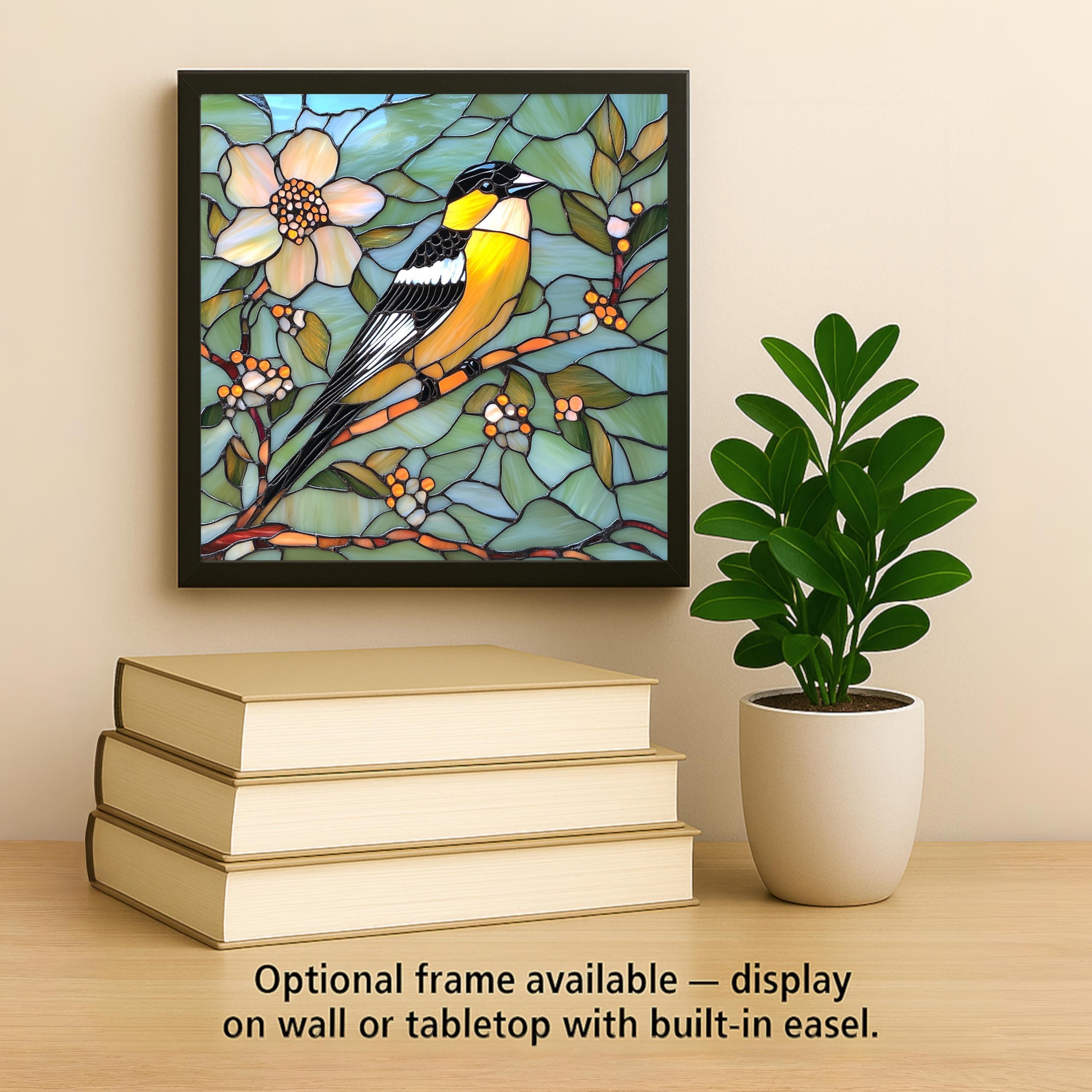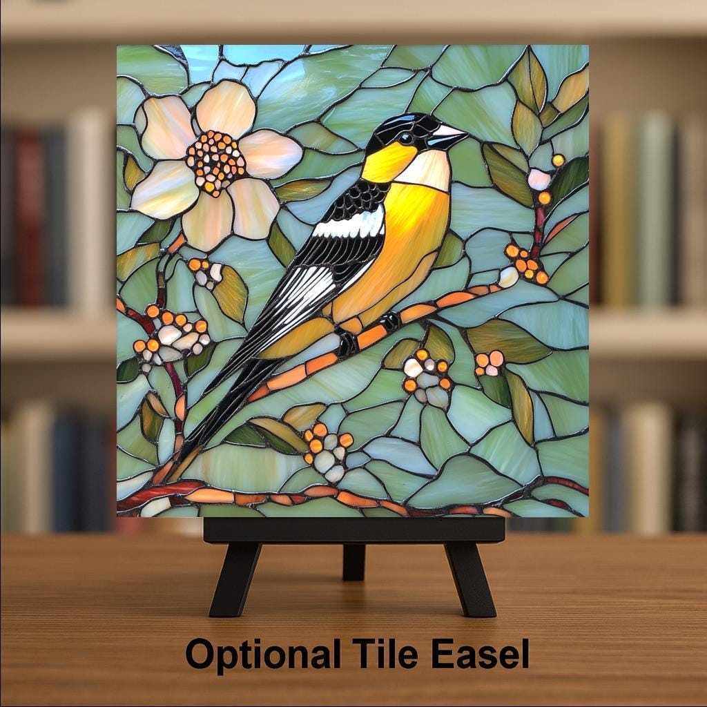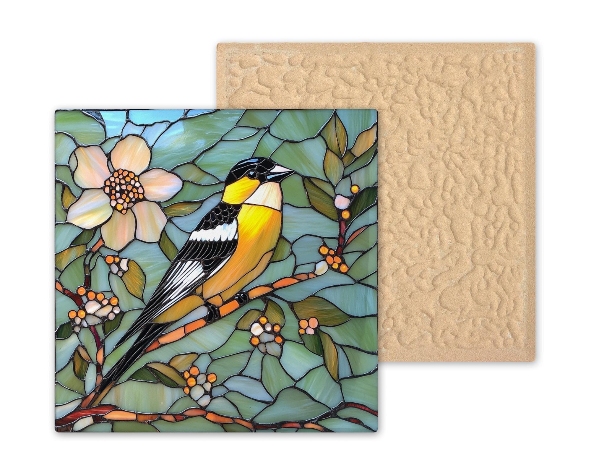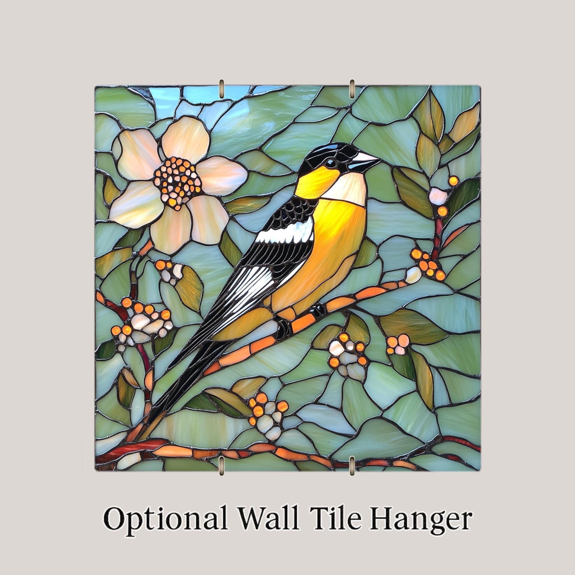 This stained glass goldfinch ceramic tile captures the elegance of a golden songbird resting among spring blossoms. Rich in color and detail, the design mimics the glow of real stained glass, with glowing amber feathers, delicate floral accents, and layered green foliage. The bold outlines and smooth glassy texture add dimension and charm to this artisan tile.