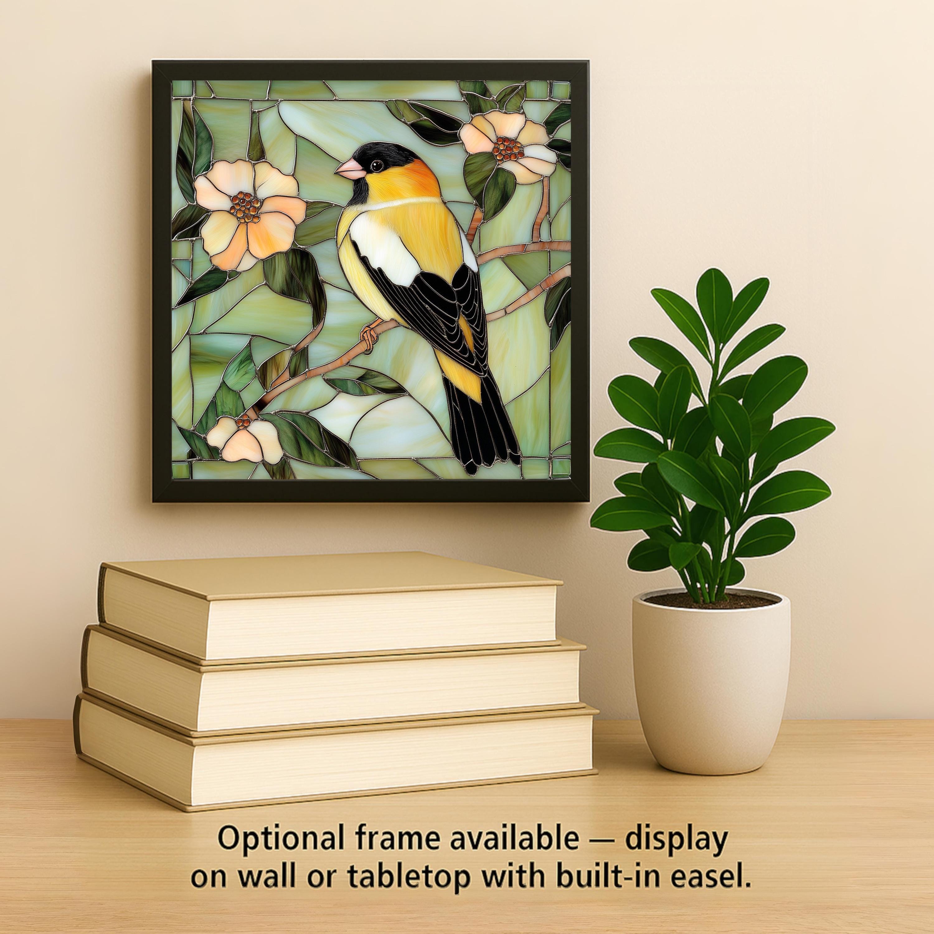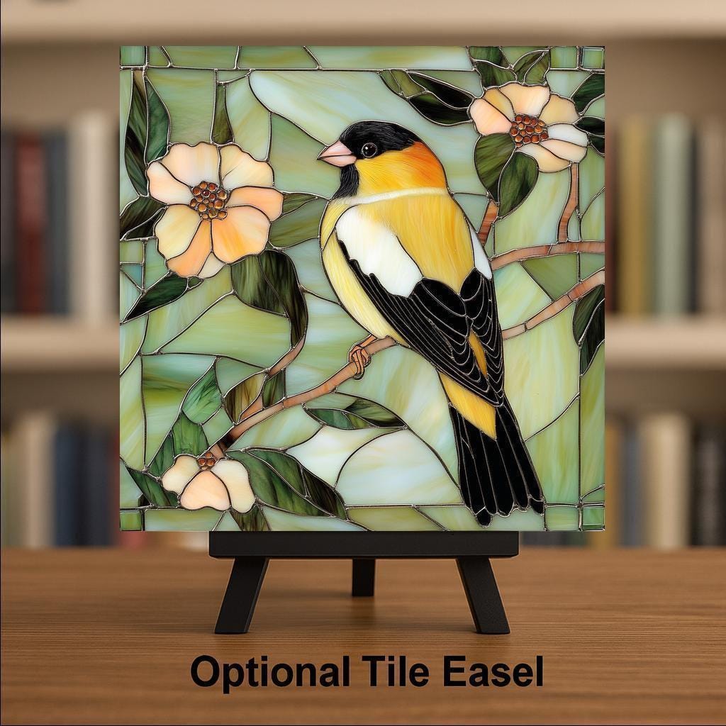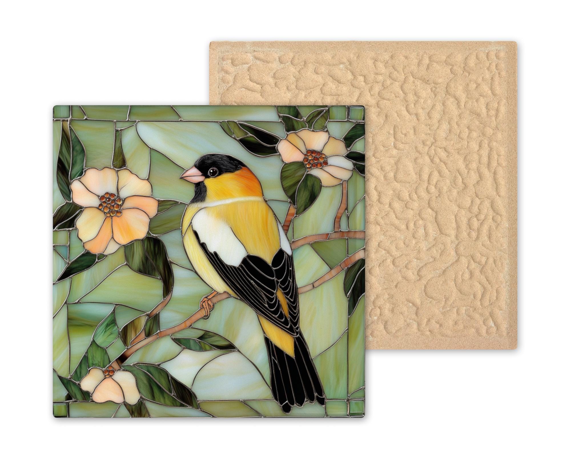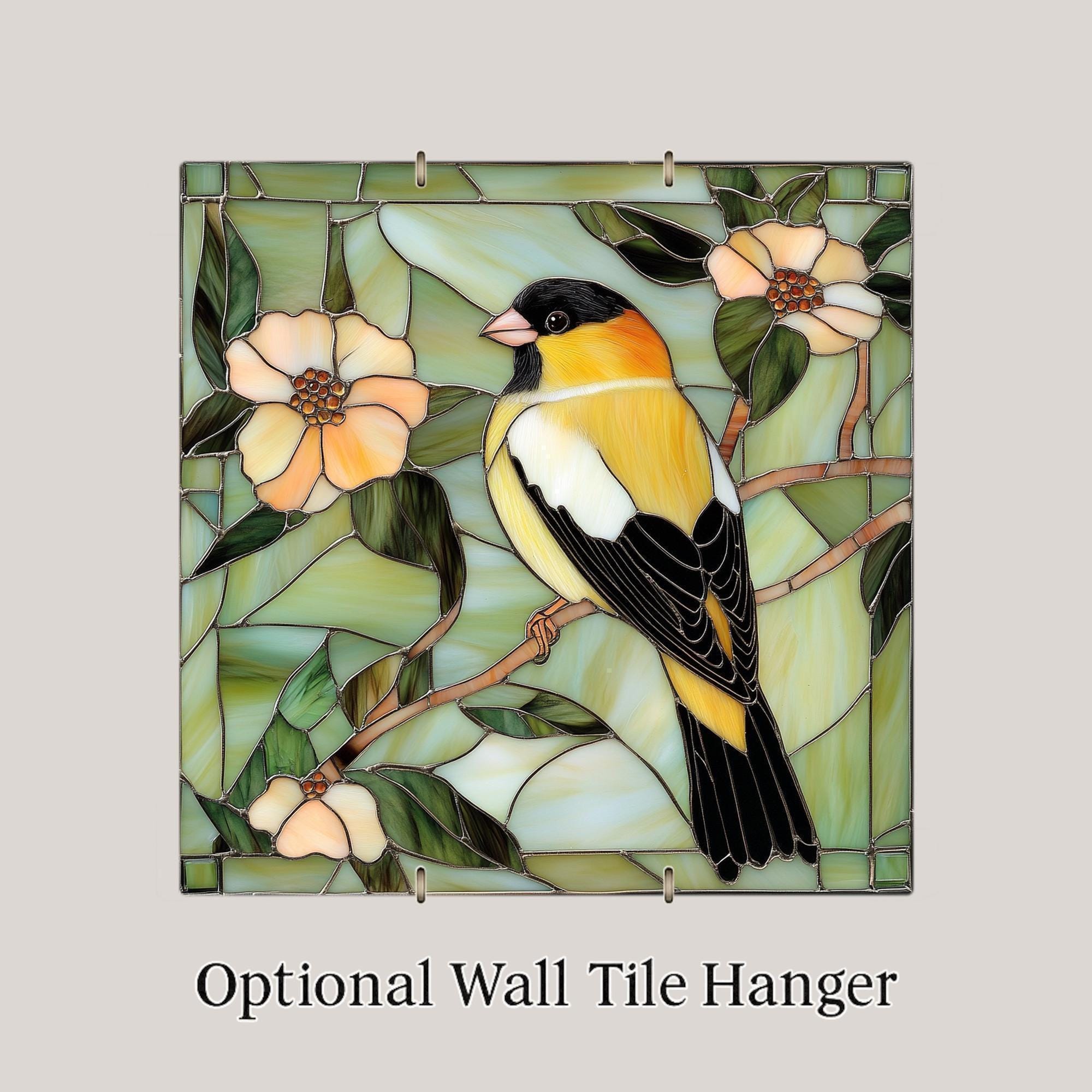 This goldfinch wall art ceramic tile brings the look of stained glass to life in a charming bird and floral motif. The vibrant yellow bird perches on a leafy branch surrounded by soft blossoms, all detailed with elegant linework and rich jewel-tone hues. The design mimics the elegance of leaded glass, making it a stunning addition to any nature-themed room.